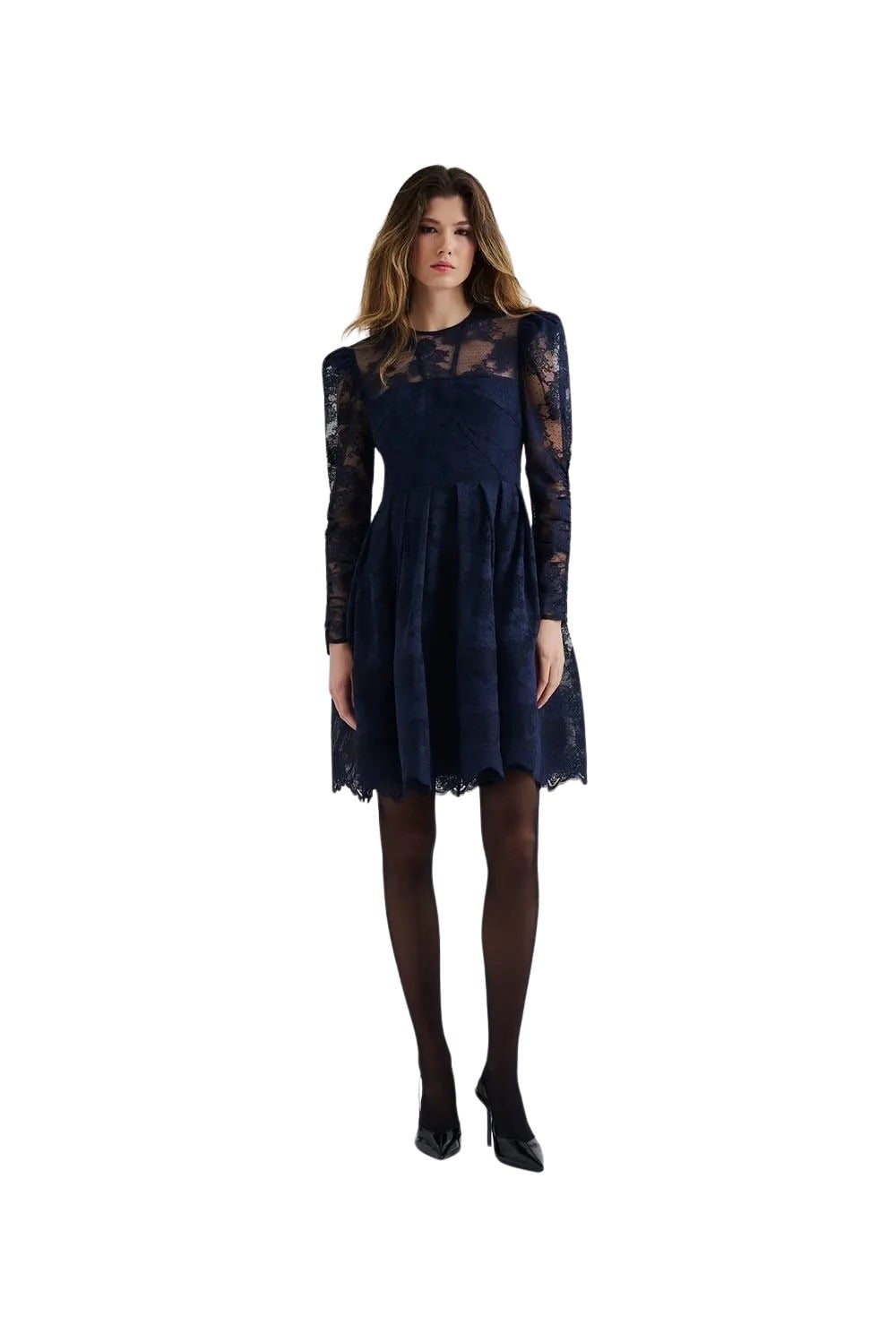 En elegant blondekjole til dame fra Malina som kombinerer klassisk femininitet med moderne snitt. Leoni Mini Dress har lange ermer, delikat blondestoff og en flatterende A-formet skjørt som gir en romantisk silhuett. Perfekt til festlige anledninger, middager eller julebord.