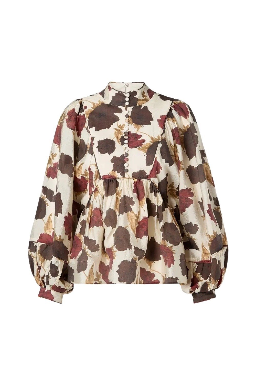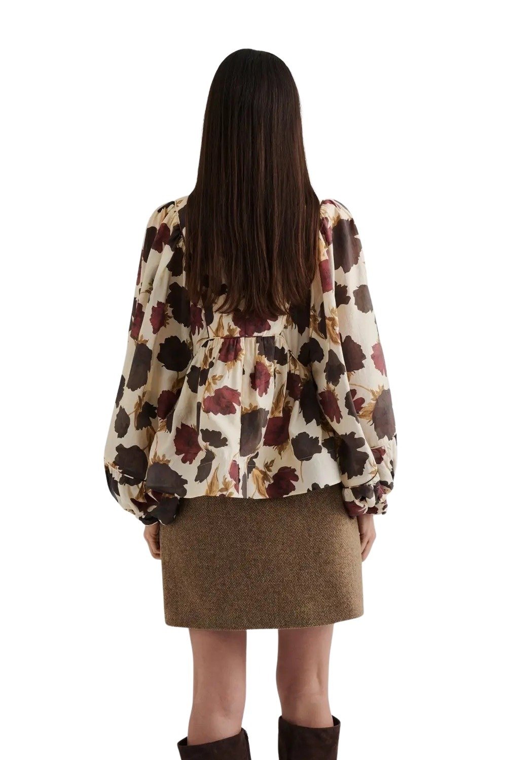 Bluse fra Malina med høy hals og elegante ballongermer. Blusen har et nydelig blomsterprint med knappestolpe i front og glidelåslukking bak. Perfekt å style med noen klassiske dressbukser og noen stilige hæler.