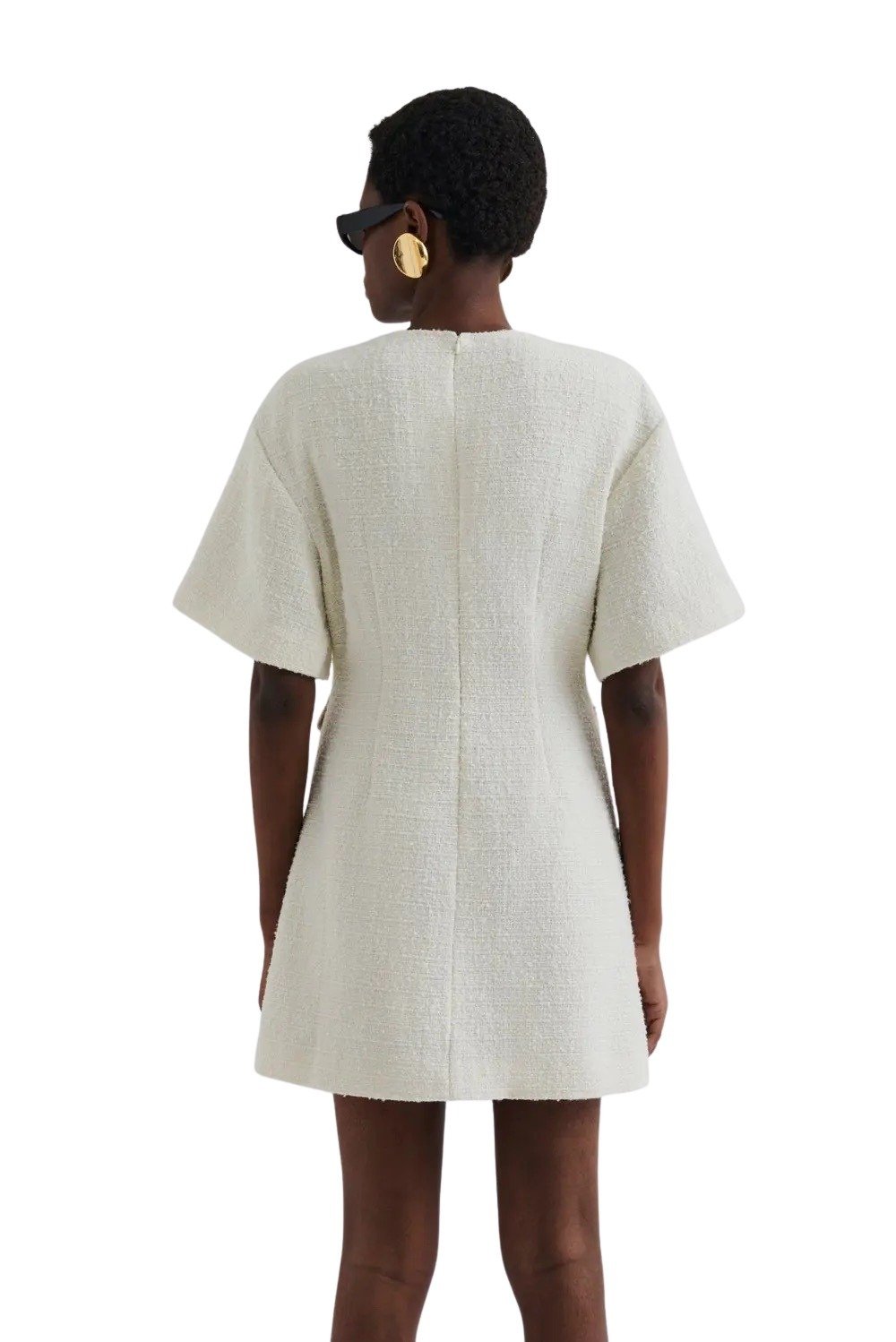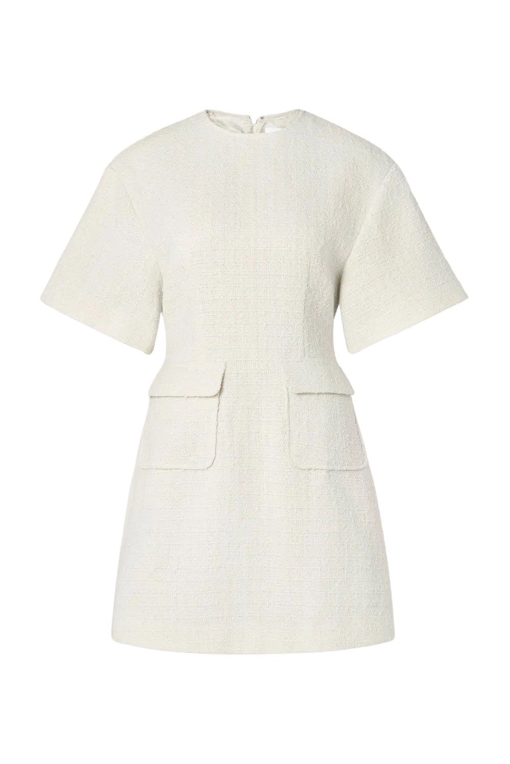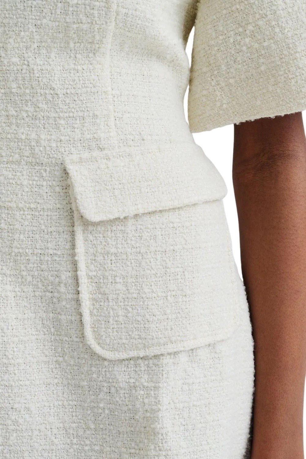Kjole til dame fra Malina. Minikjole i bouclé med lommer og korte ermer. En sofistikert kjole med feminin fasong til både formelle og uformelle anledninger.