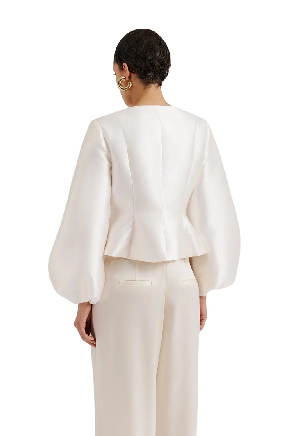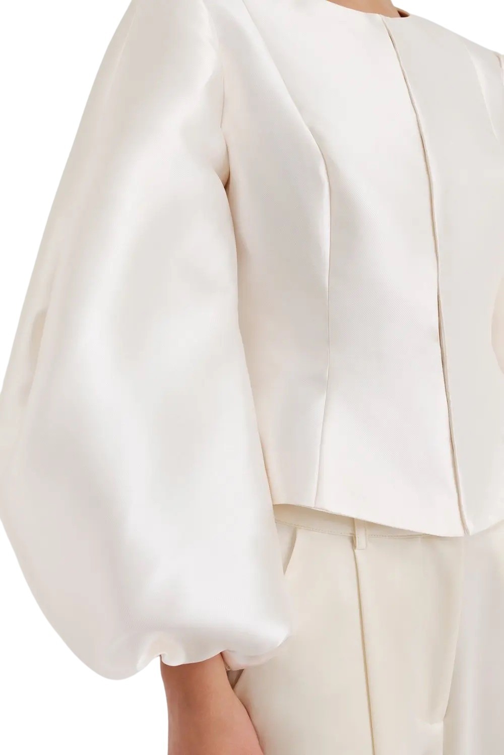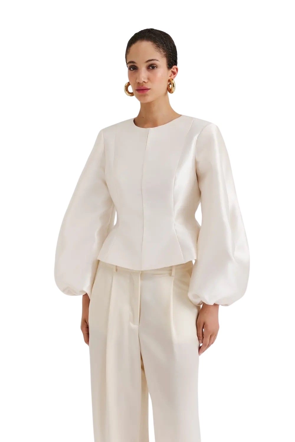 Eksklusiv og elegant bluse fra Malina med ballongermer og feminin silhuett. Laget i et glansfullt satengstoff som gir et luksuriøst uttrykk. Den figursydde midjen og de vide ermene skaper en vakker kontrast. Perfekt til både skjørt og bukser for en sofistikert look.