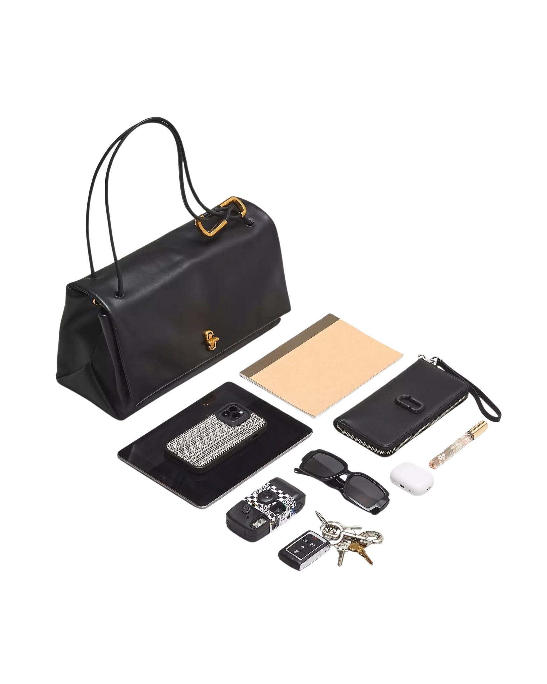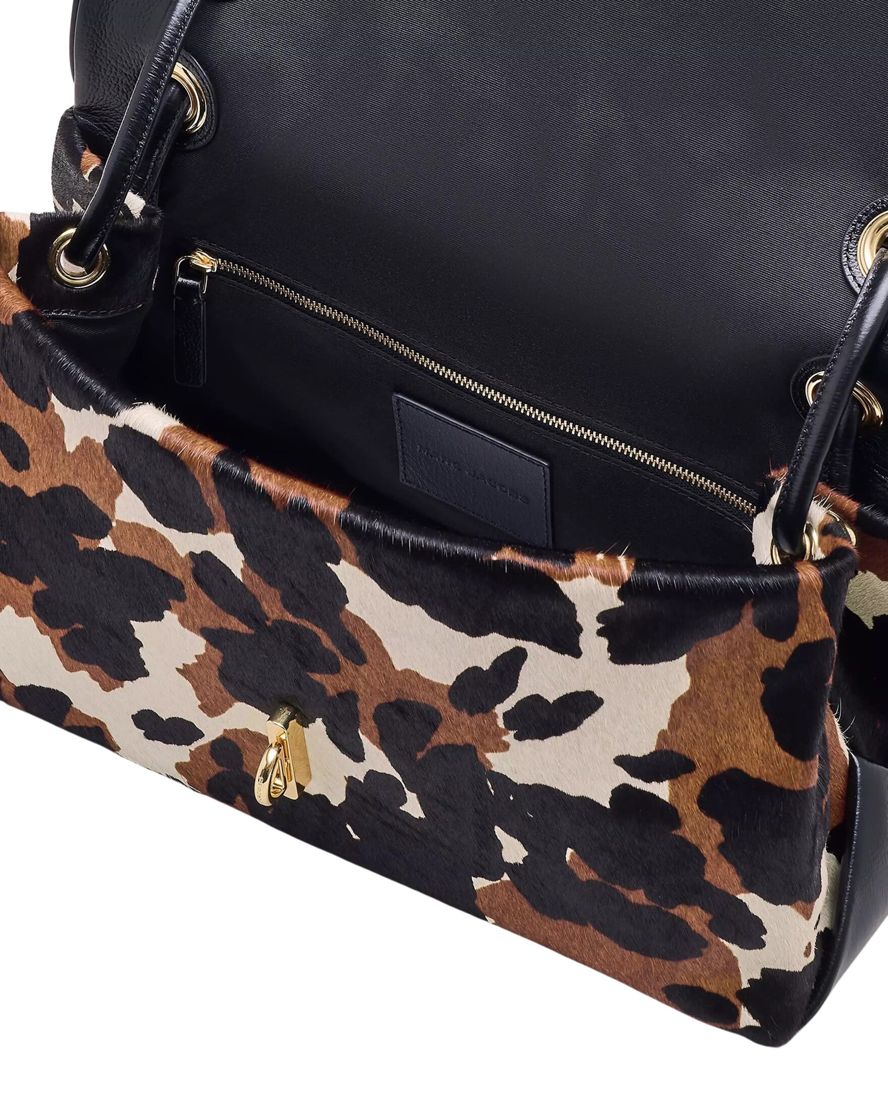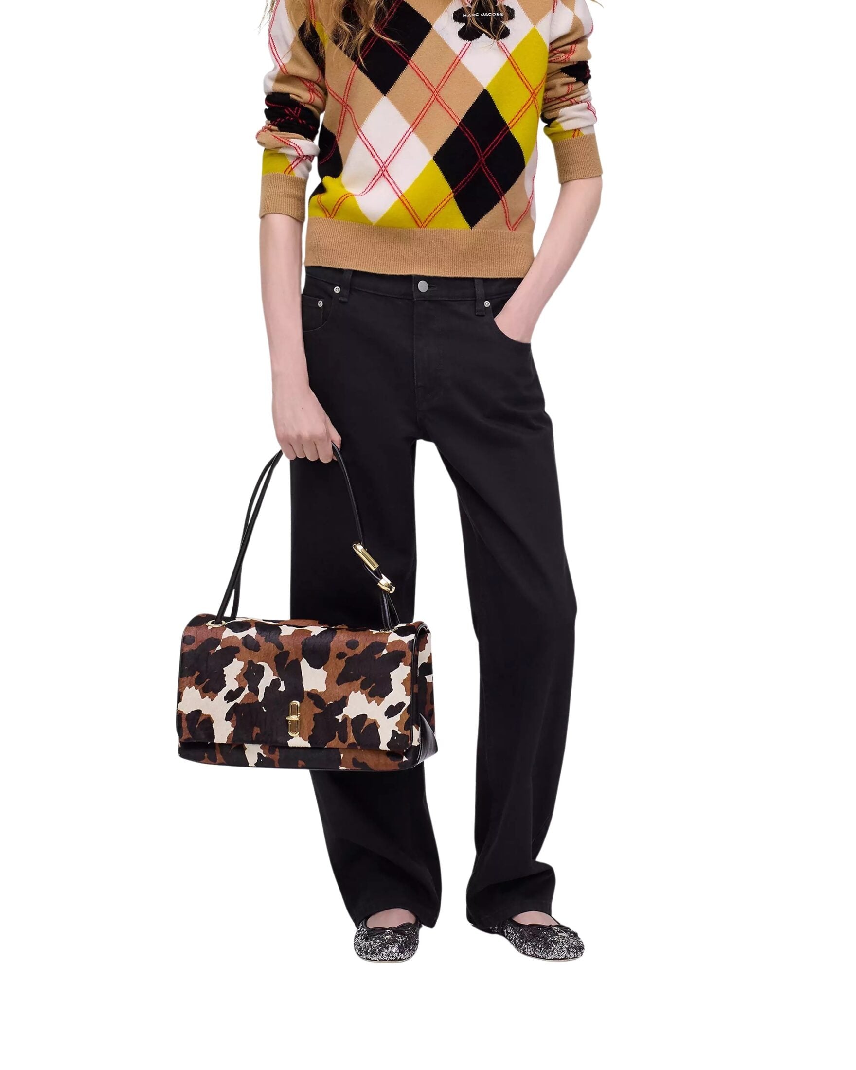 Veske fra fra Marc Jacobs. Et ekte blikkfang laget i eksklusivt kalvehår med et unikt kumønster i brune, svarte og kremhvite toner. Den elegante formen balanseres av lekre detaljer som gullfarget metall, skulderstropp og den ikoniske Double J-spennen foran. Med romslig innside og strukturert fasong er dette en veske som både skiller seg ut og fungerer perfekt til daglig bruk.
