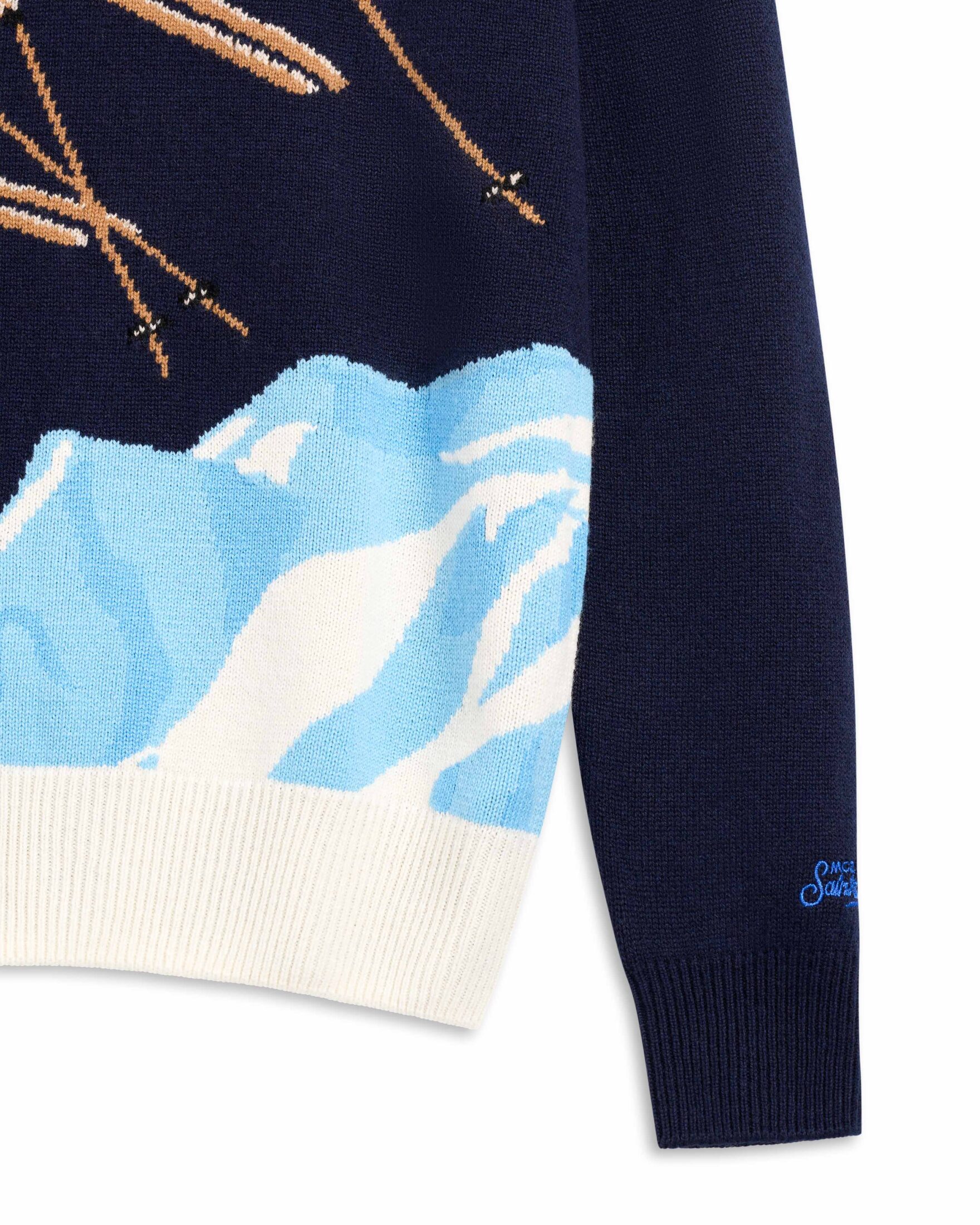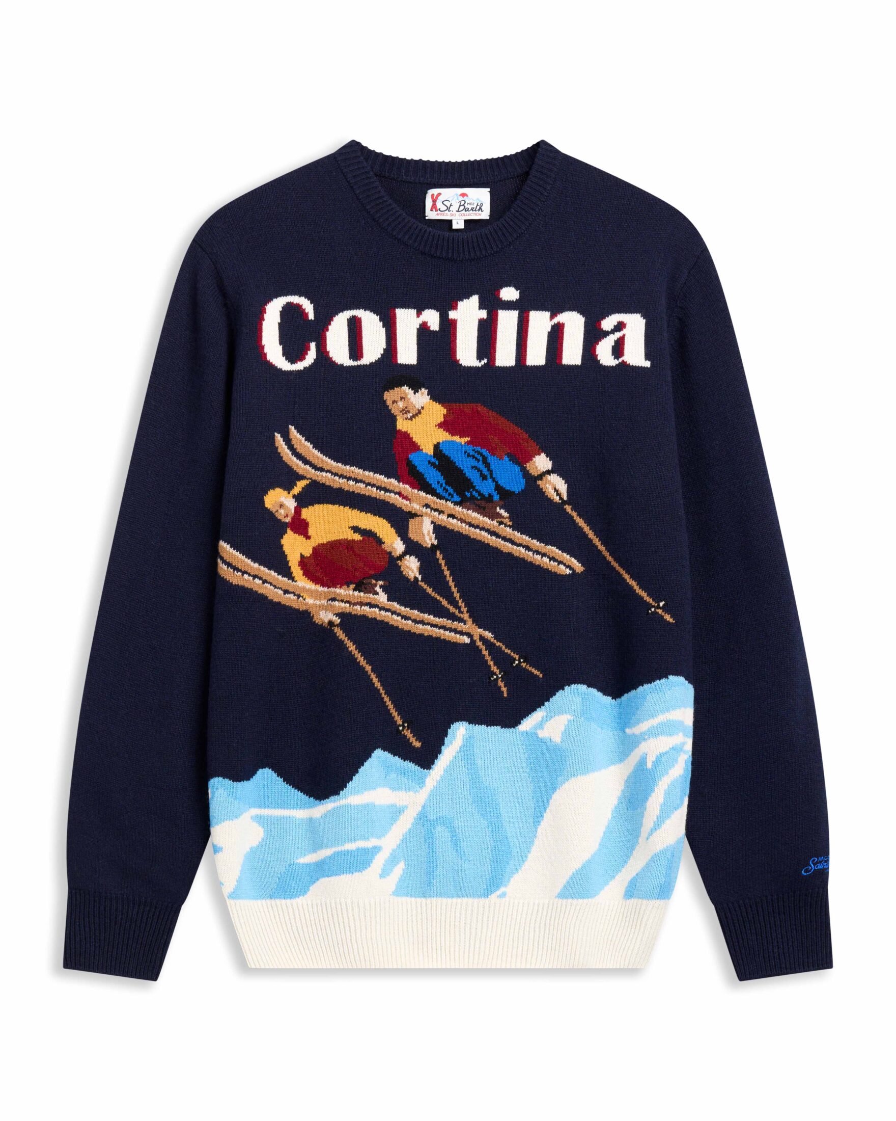 Strikkegenser fra MC2 Saint Barth med et karakteristisk Cortina-motiv inspirert av klassisk alpinsport. Laget i en behagelig ullblanding som gir varme og komfort med et tydelig statement-preg.