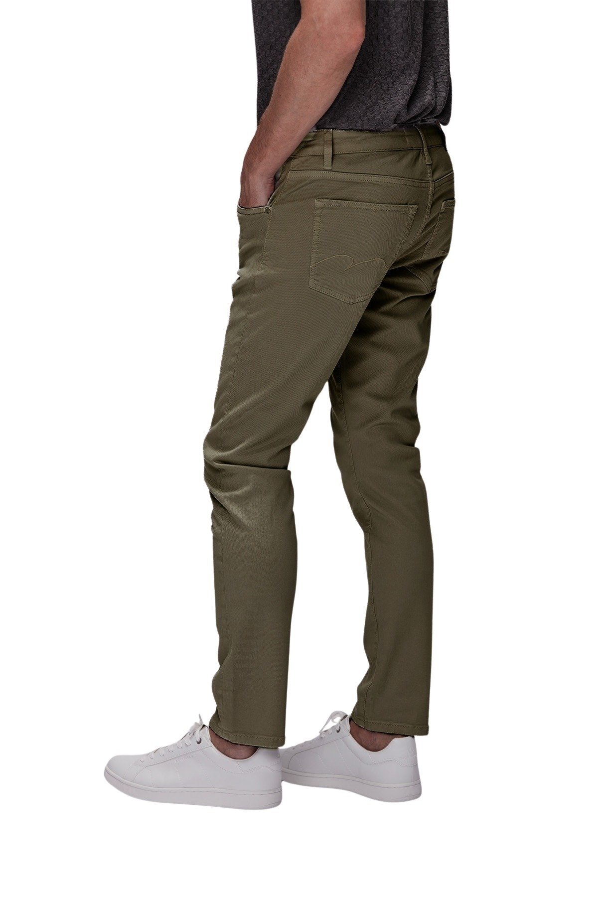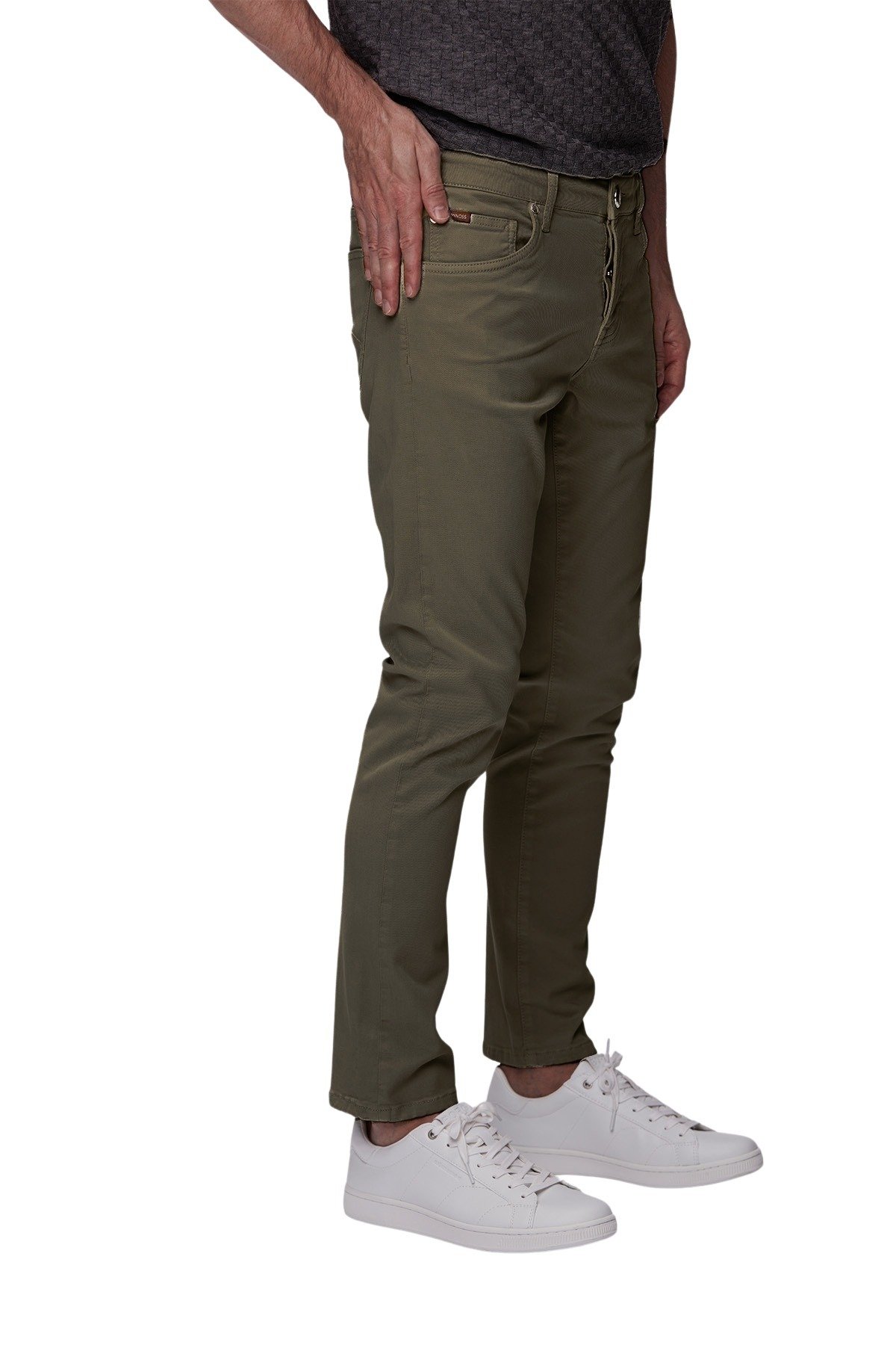 5-lommer bukse til herre fra Minoss. Laget av en stretch-bomullsblanding og er designet med en normal passform med noe avsmalnende ben. Den har knappelukking i gylfen, logo-patch bak i linningen og er ferdig med en logo i metall på myntlommen.