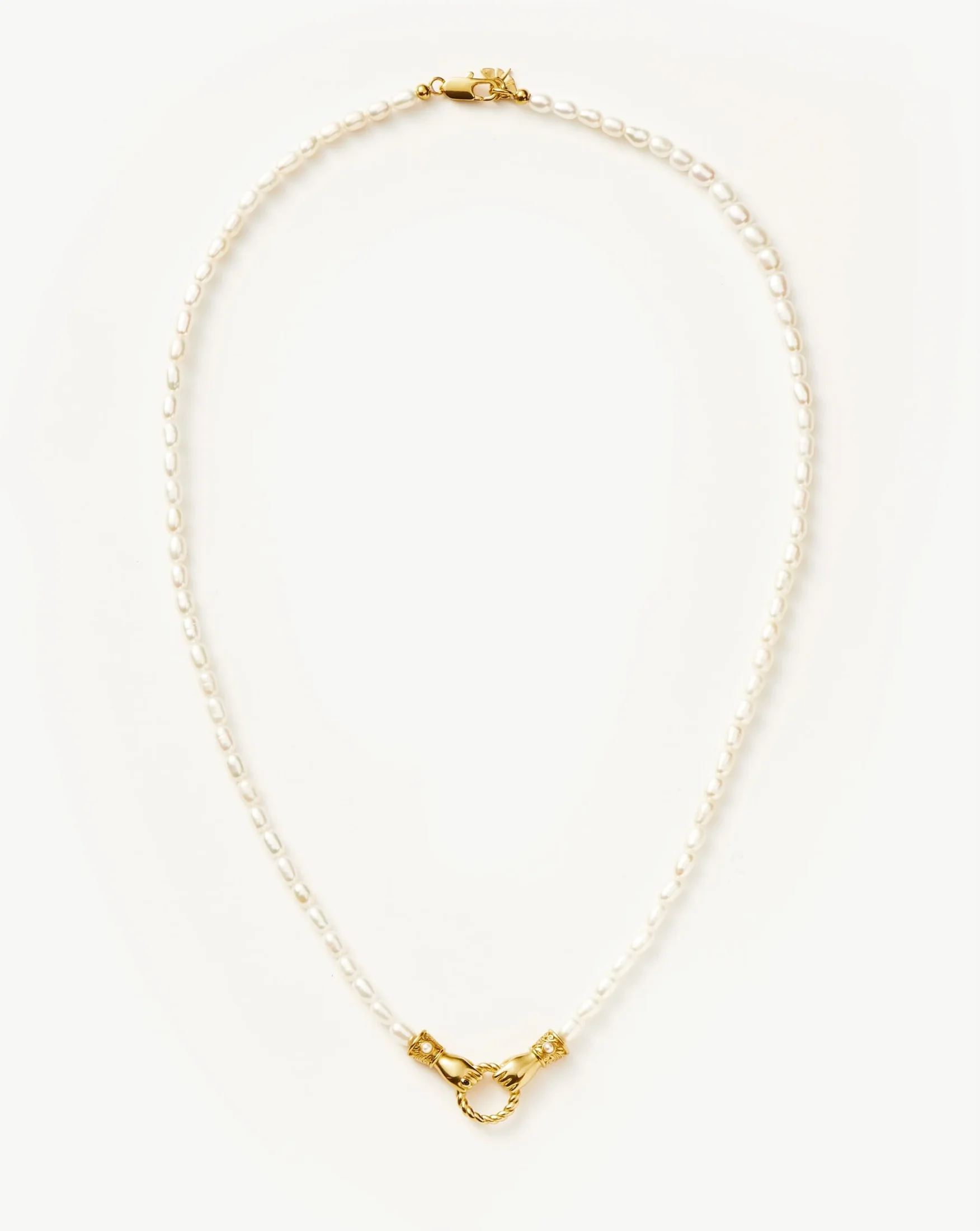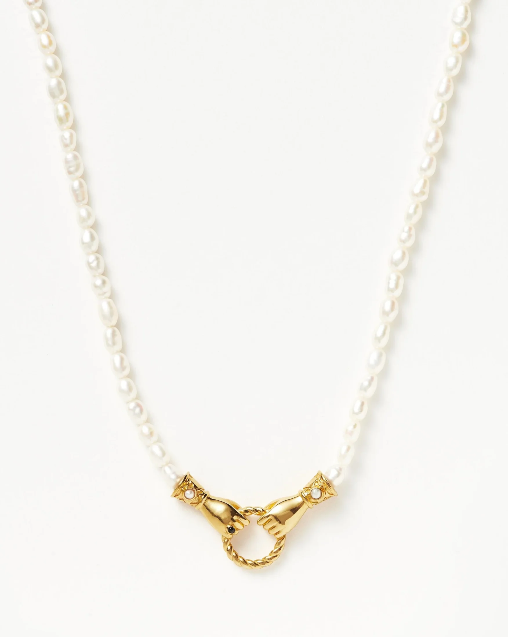 Halskjede til dame fra Missoma. Elegant halskjede som kombinerer ferskvannsperler med et unikt gullbelagt håndmotiv. Designet symboliserer enhet og styrke, med intrikate detaljer og et hint av vintage. Et elegant og meningsfullt smykke som skiller seg ut.
