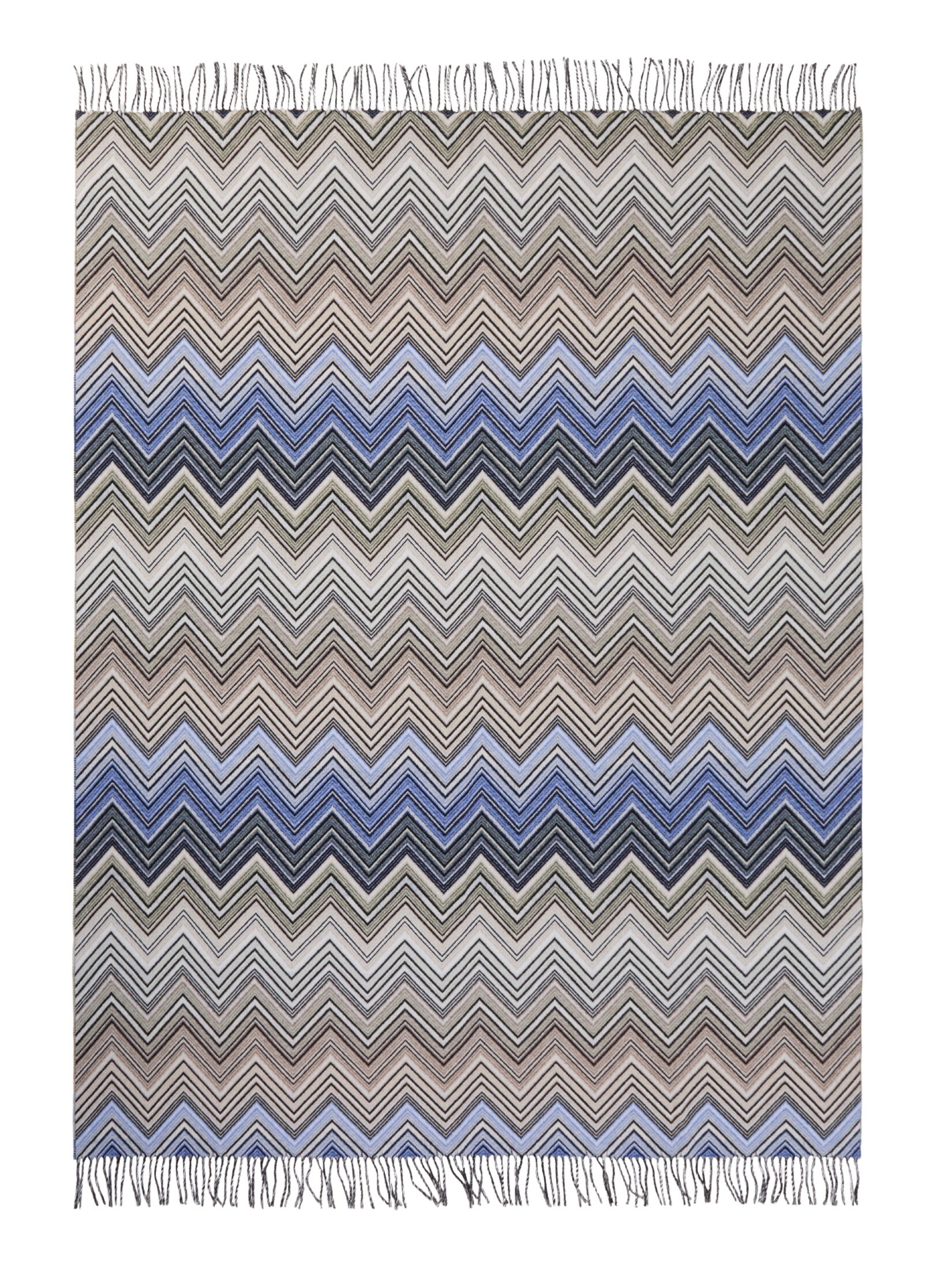 Perseo Throw fra Missoni Home. Et eksklusivt pledd i en luksuriøs blanding av ull og kasjmir, med sikksakkmønster i dempede toner med innslag av blått. Et sofistikert tilskudd som løfter både komfort og stil i hjemmet.