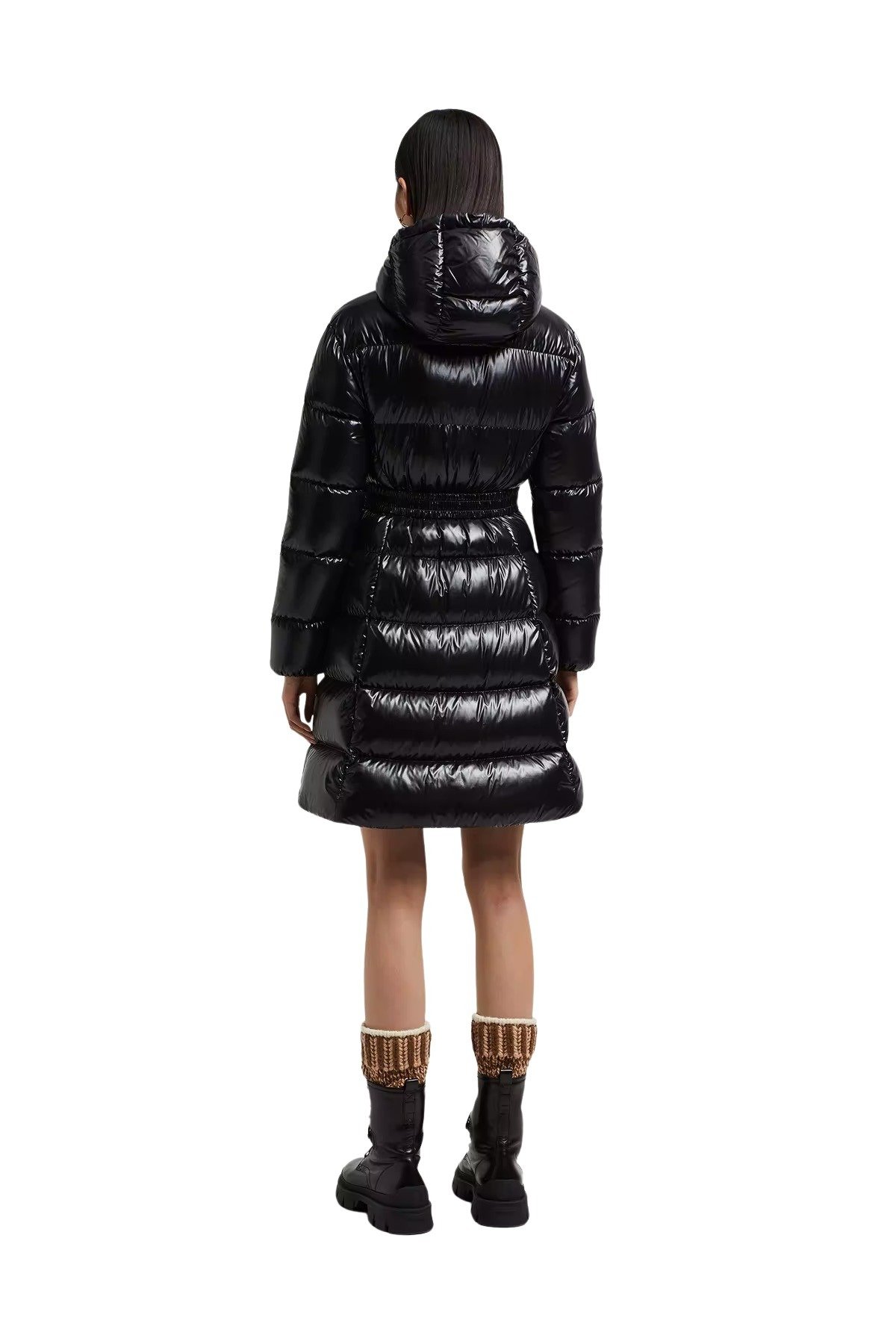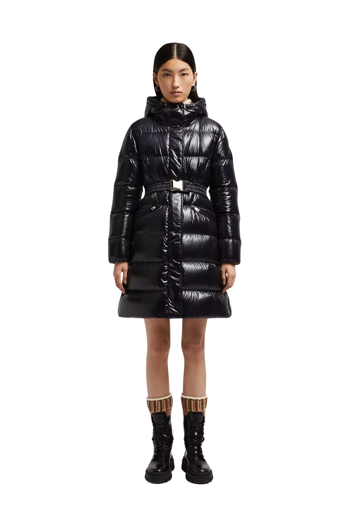 Dunjakke til dame fra Moncler. Laget av ikonisk nylonlakkstoff. Lange modell med vannavvisende egenskaper og en luksuriøs, blank finish. Feminin silhuett, forbedret med et hette og elastisk belte i midjen. Designet passer enkelt fra dag til kveld eller by til fjell.