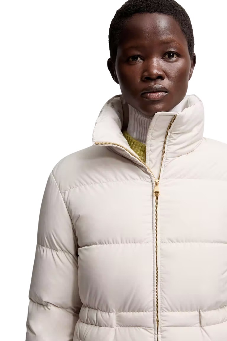 Dunjakke til dame fra Moncler. En tidløs dunjakke med moderne silhuett. Laget i et lett, vannavstøtende stoff og fylt med premium dun som holder deg varm uten å virke tung. Den høye kragen og den rene, quiltede designen gir et sofistikert uttrykk. Perfekt både til byliv og fjellturer.