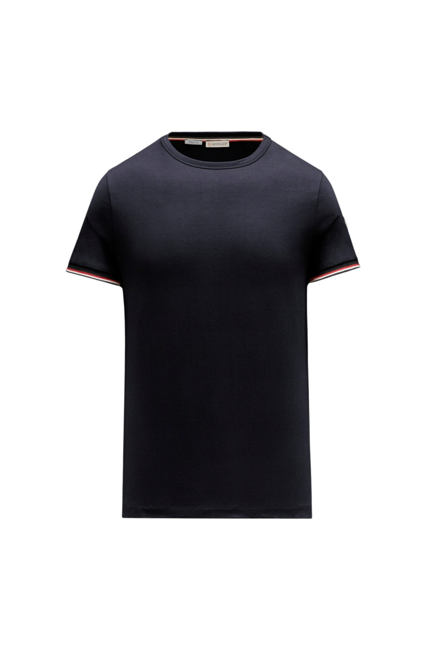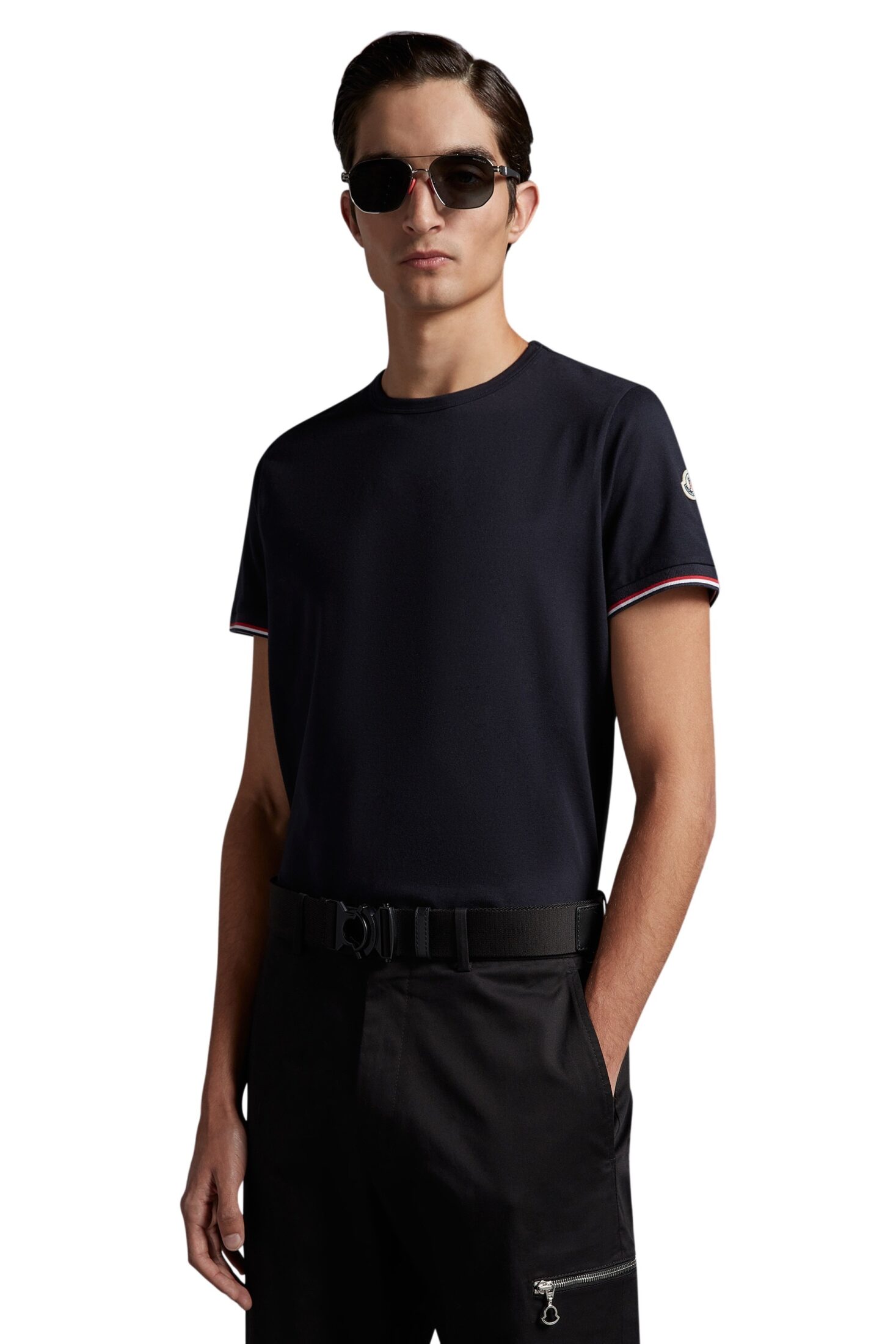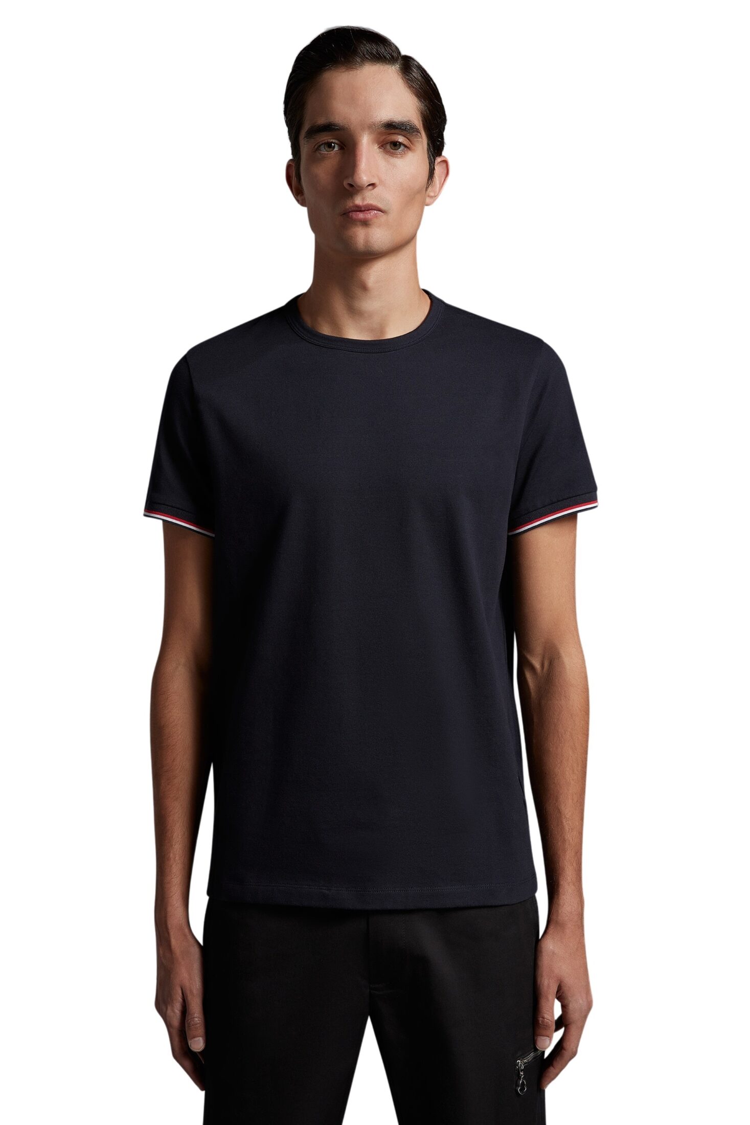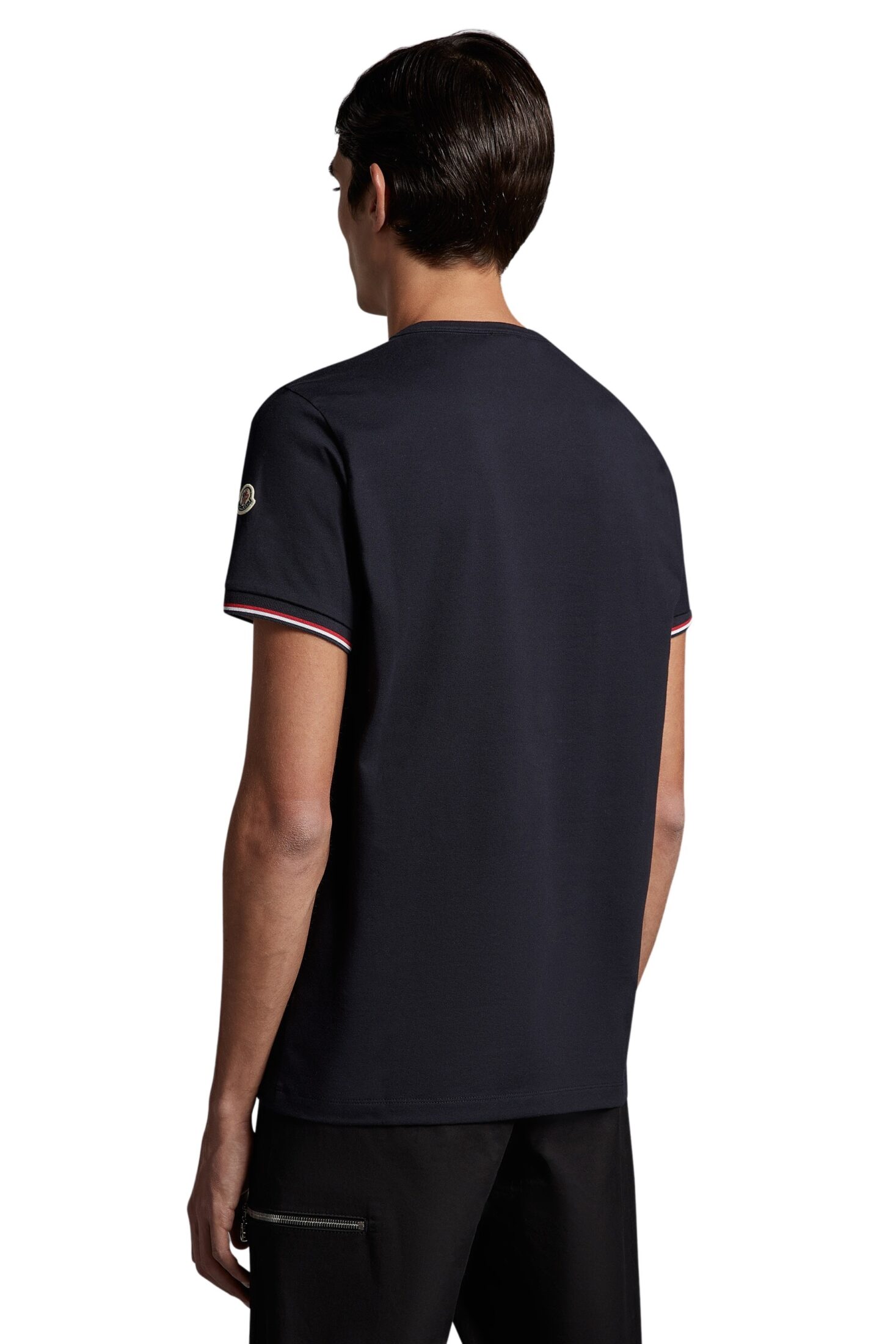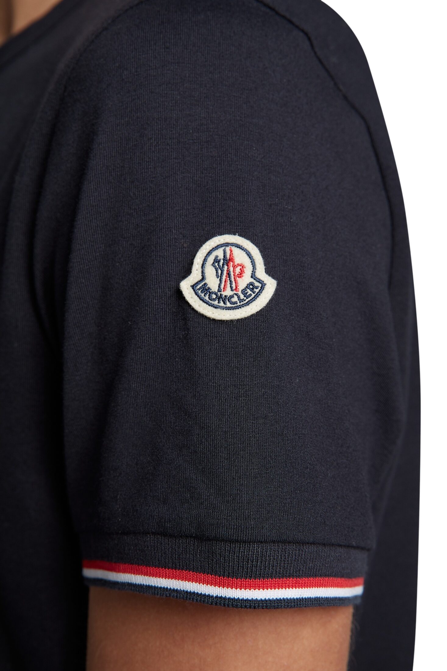 T-skjorte til herre fra Moncler. T-skjorten er laget av en myk bomullskvalitet og er designet med en normal passform. Den har en rund hals, trefargede detaljer på mansjettene og er toppet med en logo-patch på høyre erme.