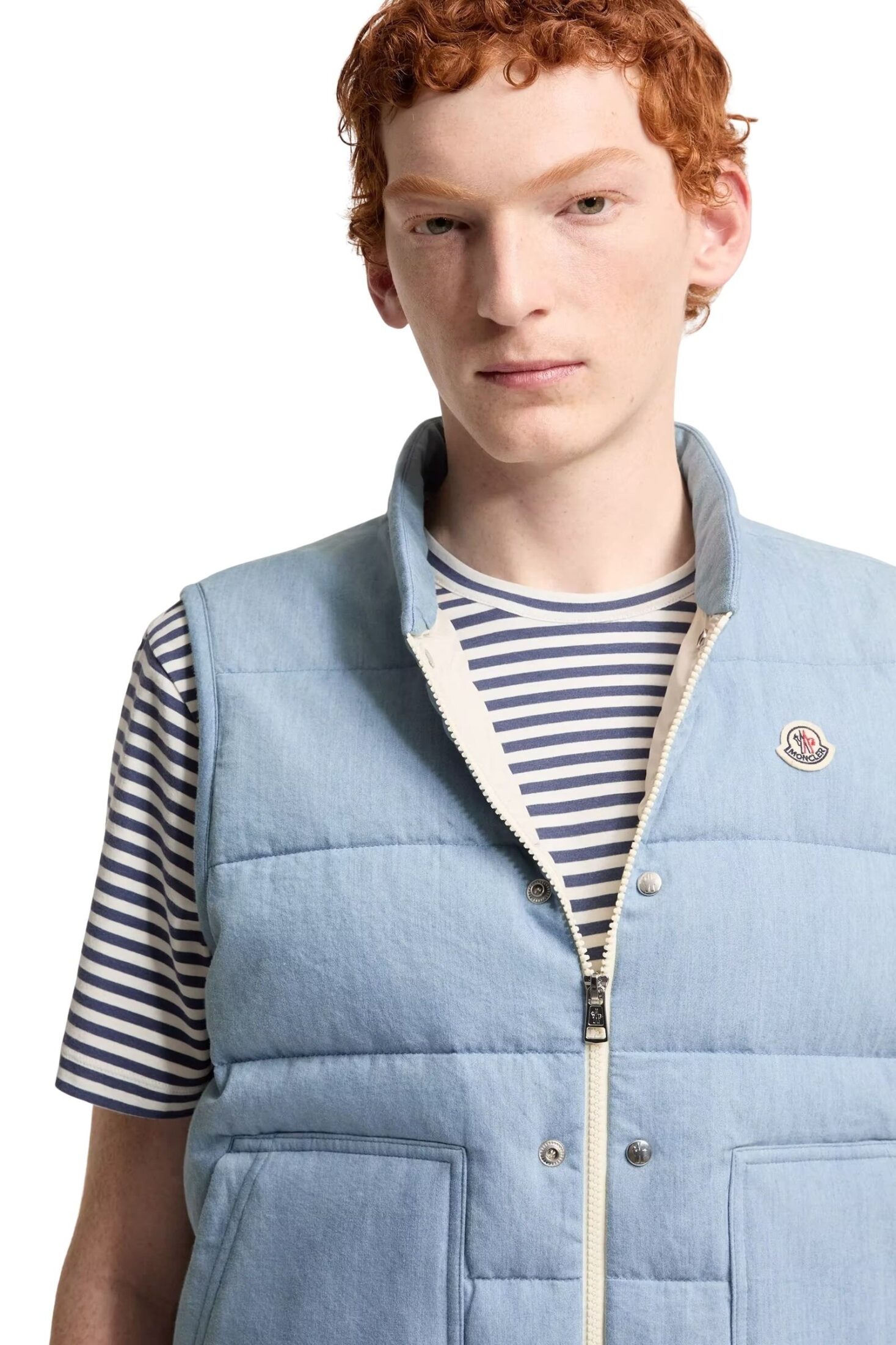 Heceta Denim Down Gilet fra Moncler. Vesten har et avslappet og moderne uttrykk med indigofarget, vasket finish som gir en naturlig, innarbeidet look. Det lette materialet og den friske fargetonen skaper en sommerlig følelse. Perfekt som et stilrent lag for varmere dager.