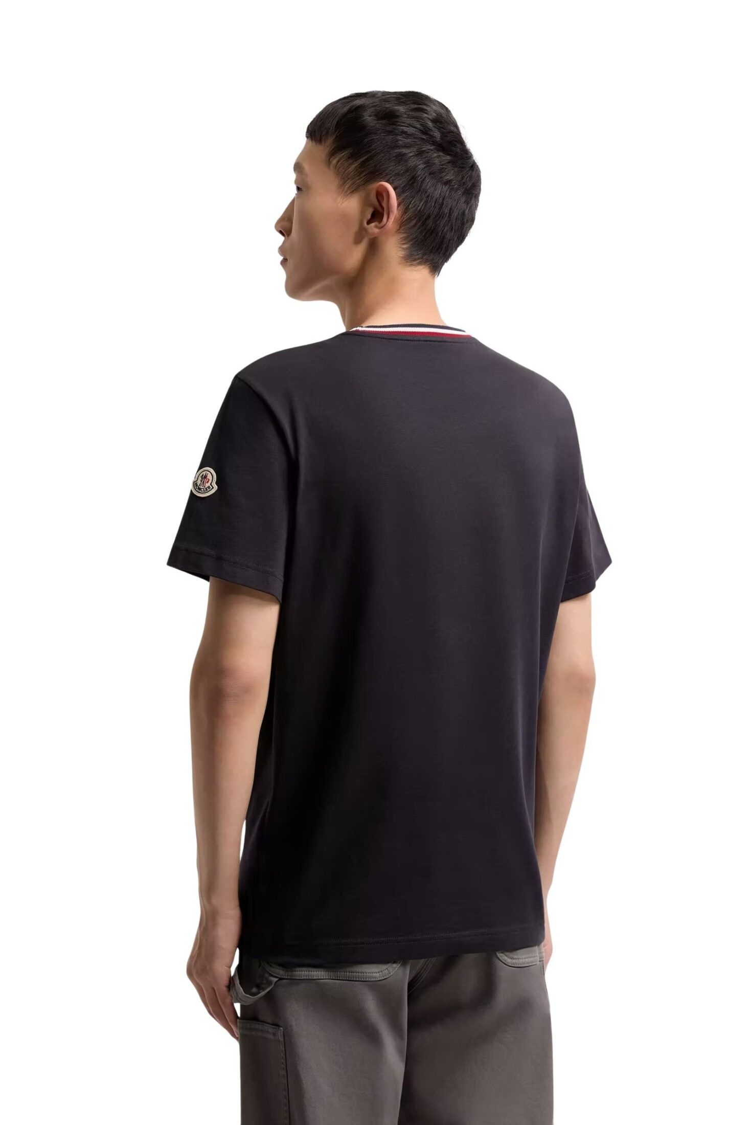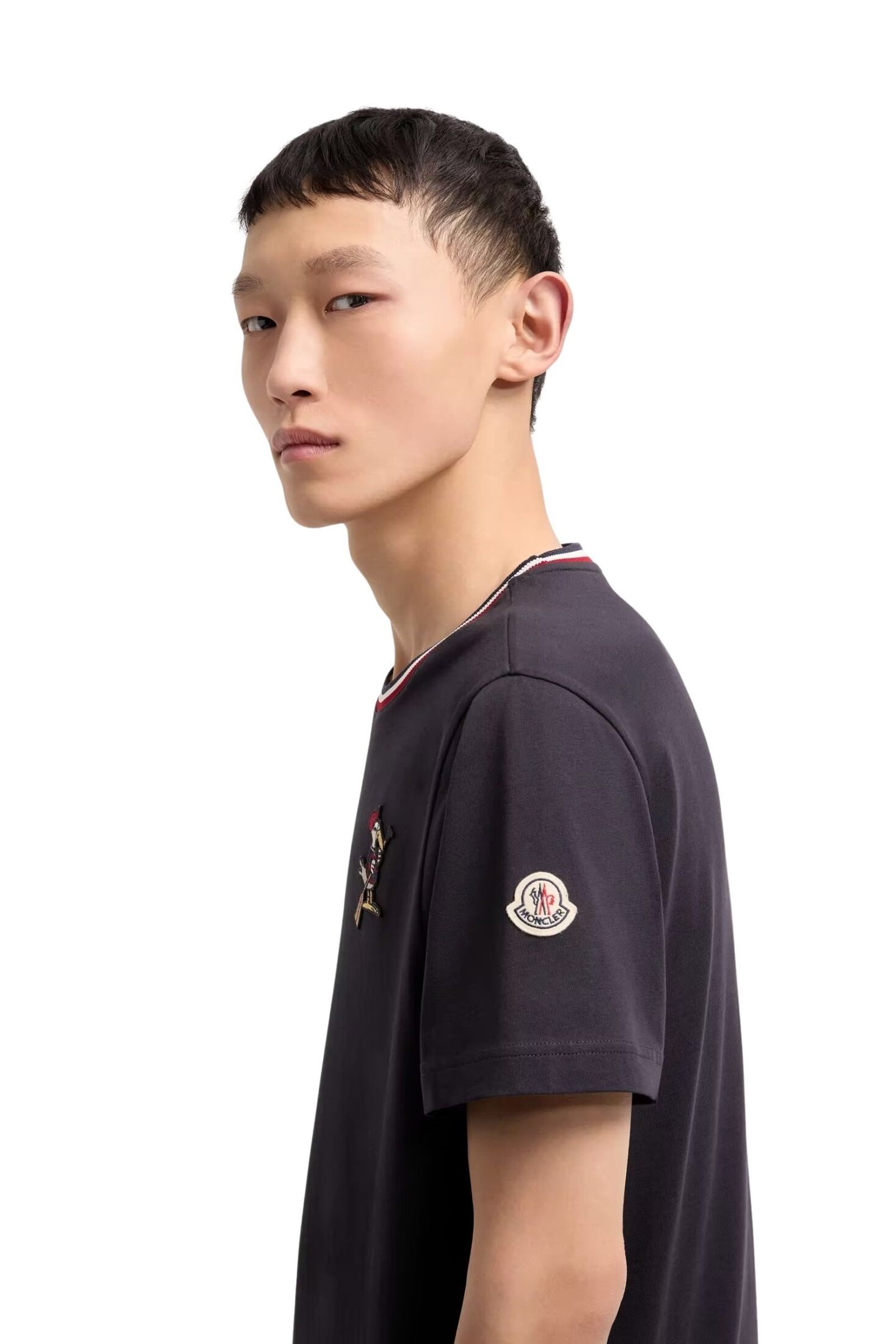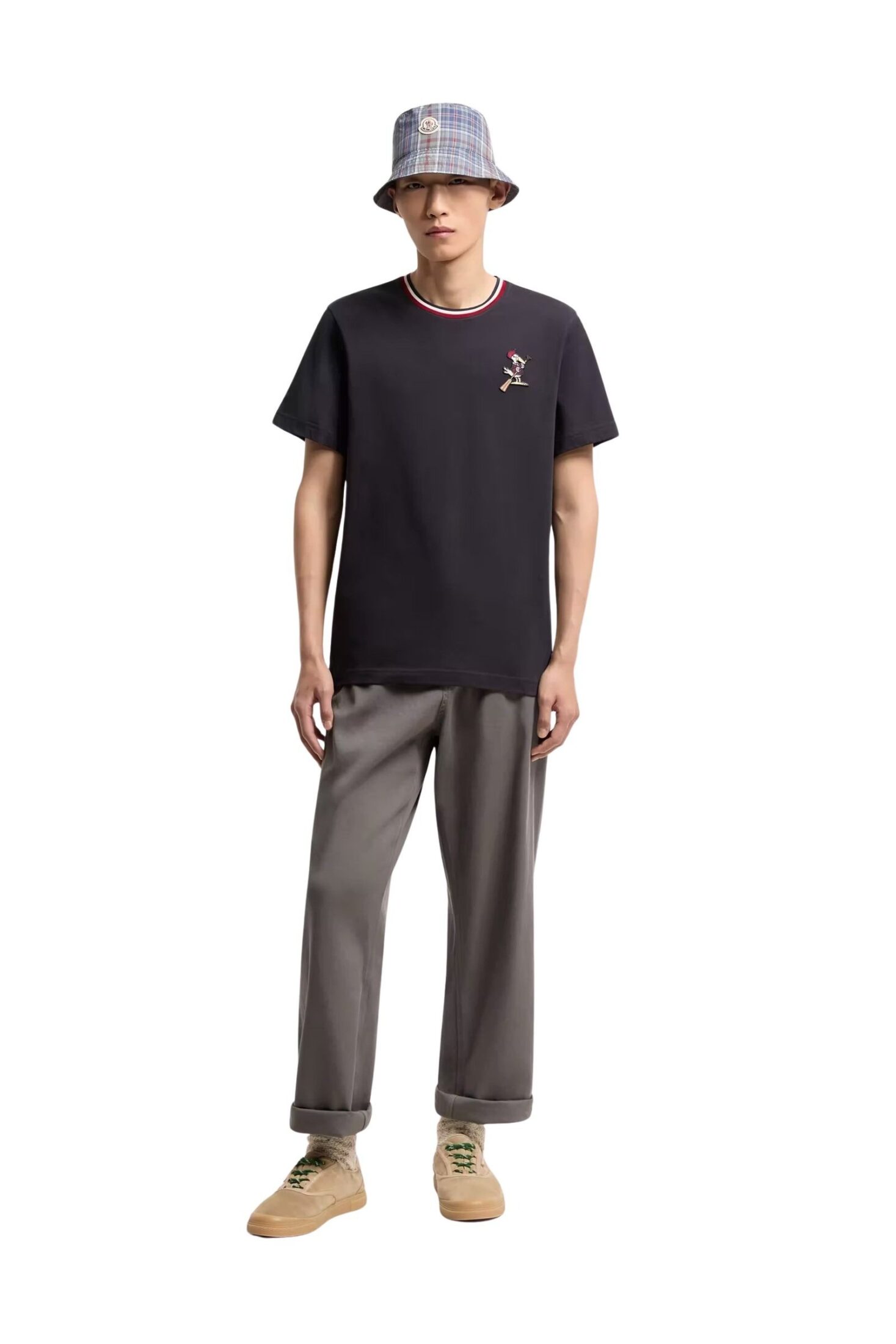 T-skjorte til herre fra Moncler, laget i myk bomullsjersey og dekorert med den lekne MonDuck-logoen som hyller merkets arv. Den klassiske modellen med rund hals og korte ermer får et sporty preg av ribbestrikket krage med trikolor-detaljer. En karakterfull hverdagsfavoritt med tydelig signatur.