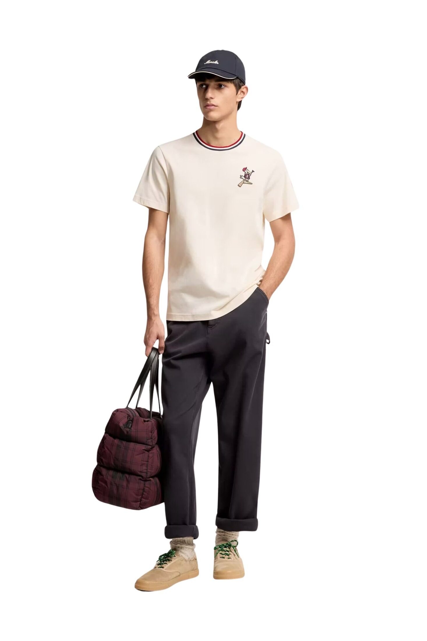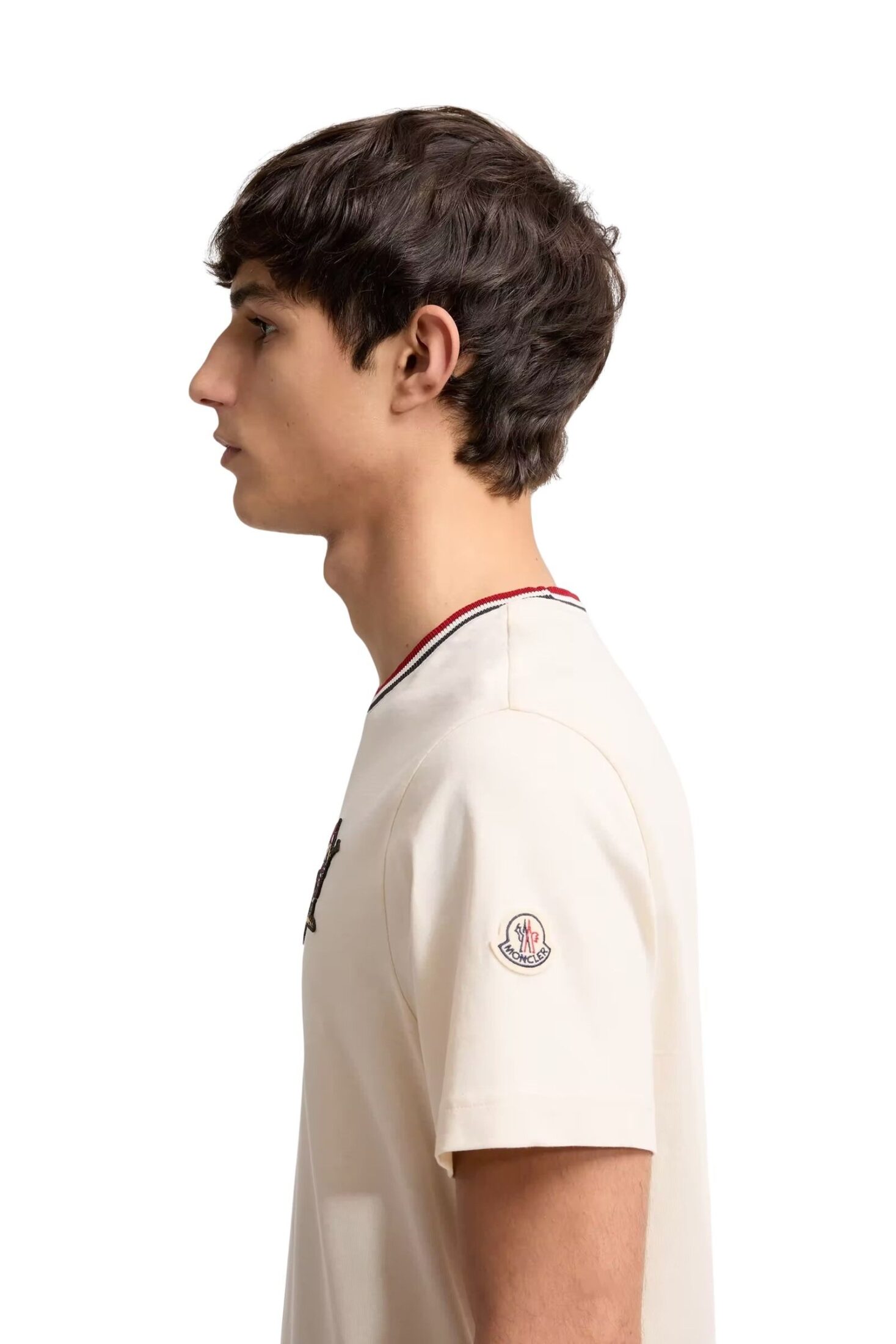 T-skjorte til herre fra Moncler, laget i myk bomullsjersey og dekorert med den lekne MonDuck-logoen som hyller merkets arv. Den klassiske modellen med rund hals og korte ermer får et sporty preg av ribbestrikket krage med trikolor-detaljer. En karakterfull hverdagsfavoritt med tydelig signatur.