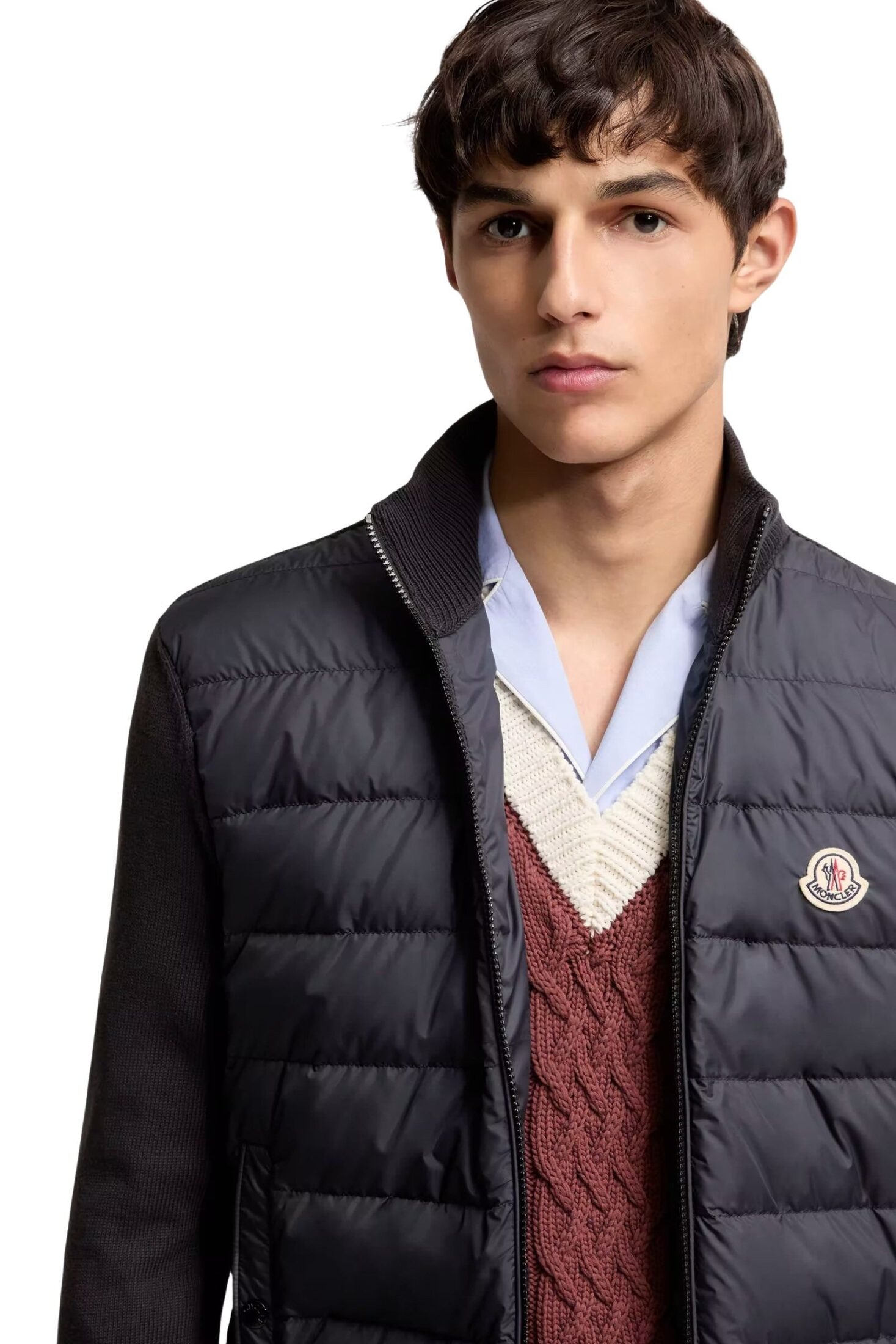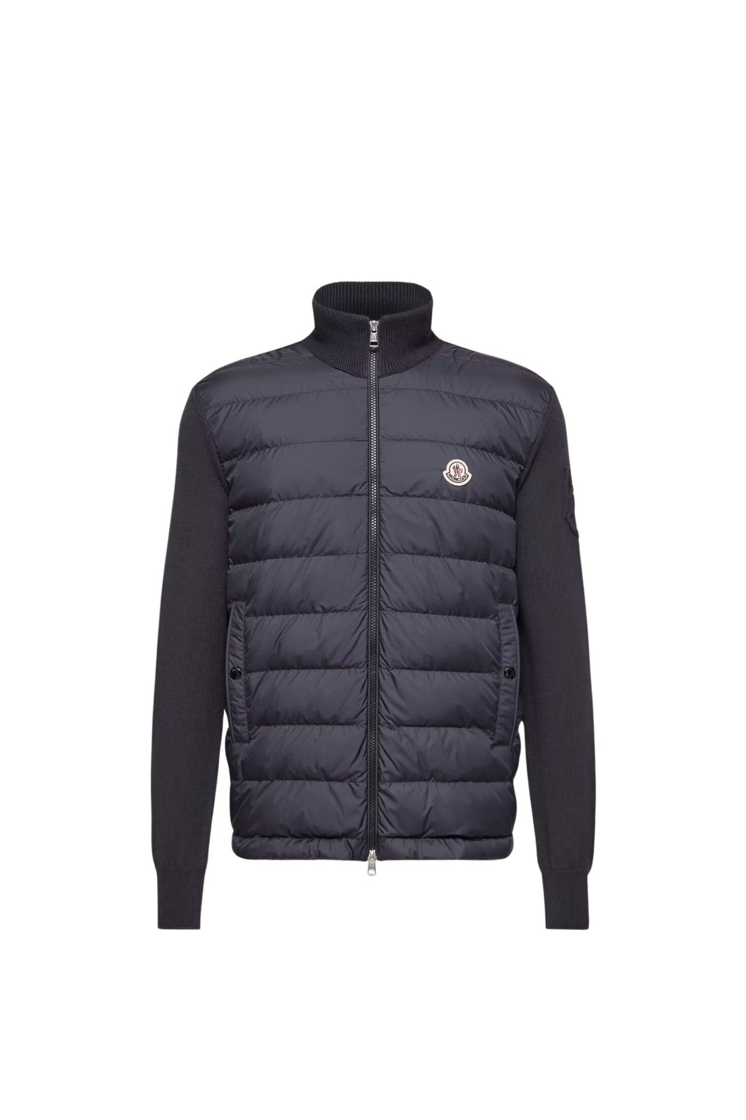 Cardigan til herre fra Moncler, laget i myk bomull og en dunfylt front for ekstra varme. Den høye halsen og den lette konstruksjonen gjør modellen ideell i overgangssesong, enten brukt alene som ytterplagg eller som et isolerende lag under jakke.