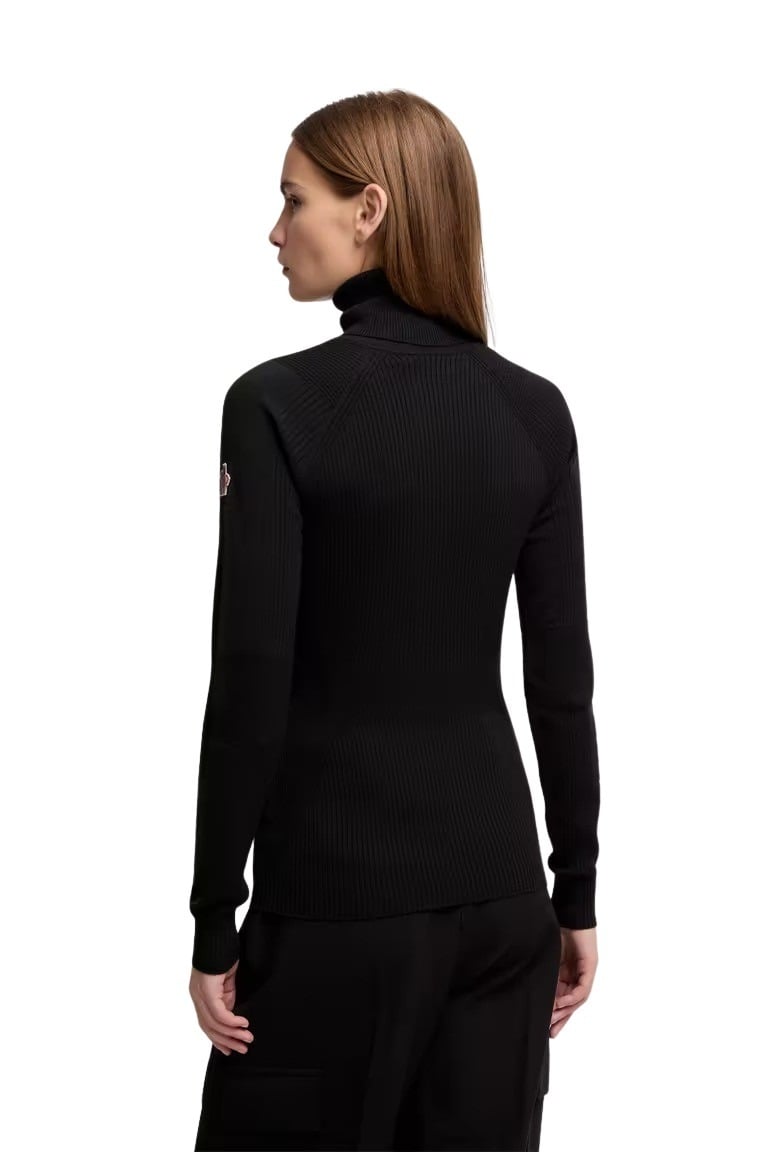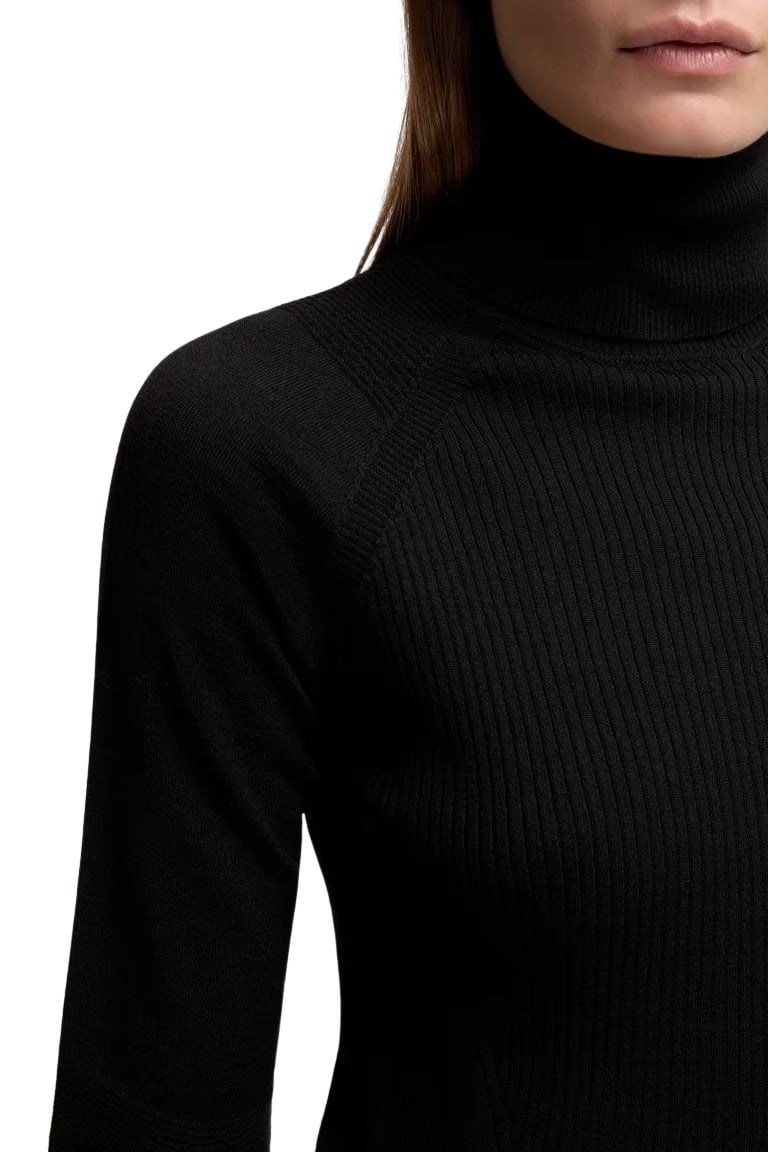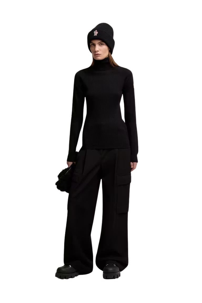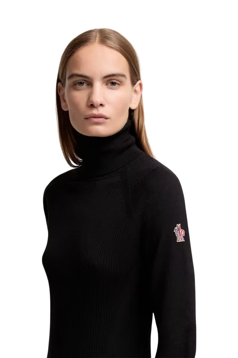 Genser til dame fra Moncler med en beskyttende høy hals. Strikket av en ullblanding med en komfortabel stretchoverflate. Perfekte følgesvennen på fjellet eller en forfriskende vinter i byen.