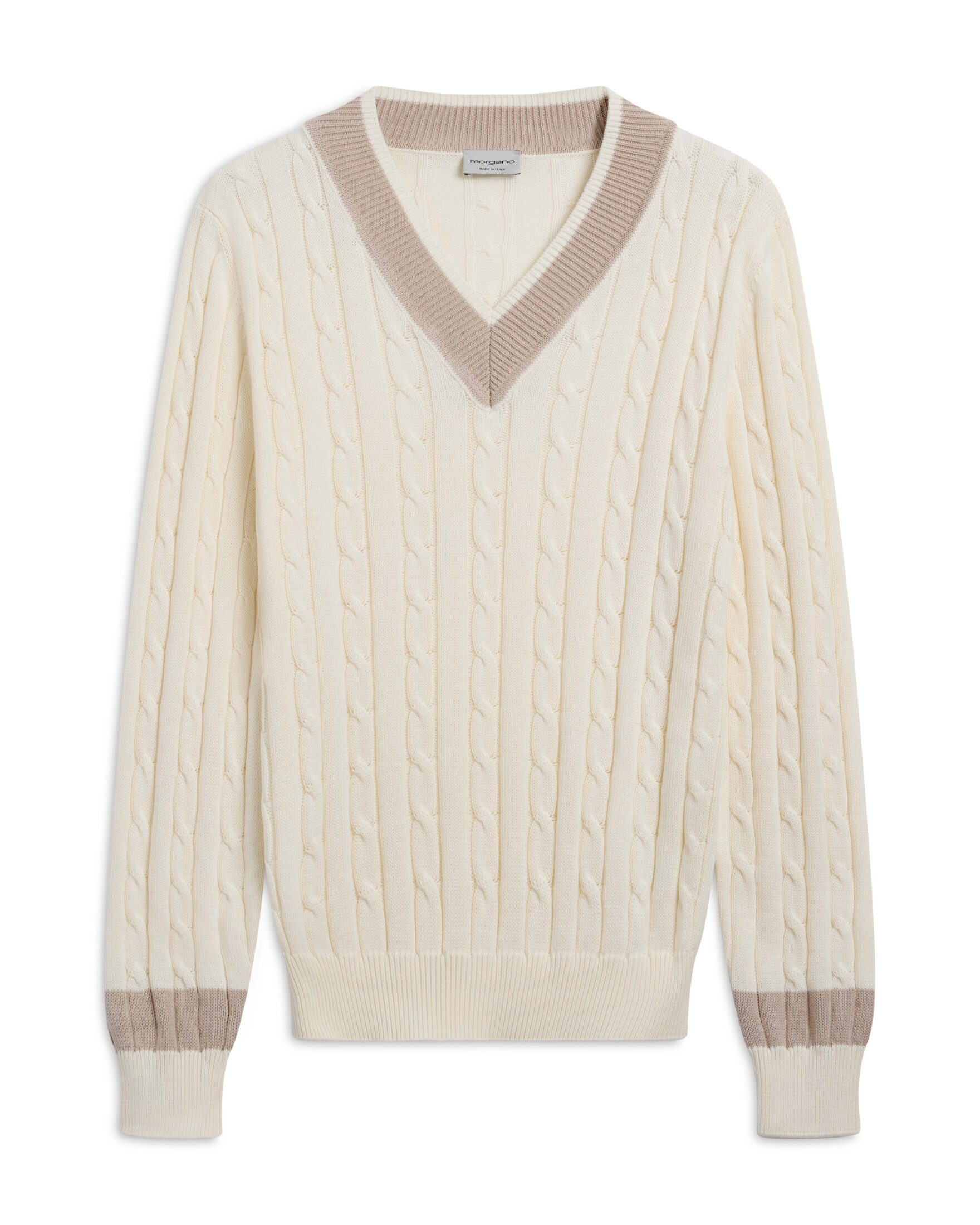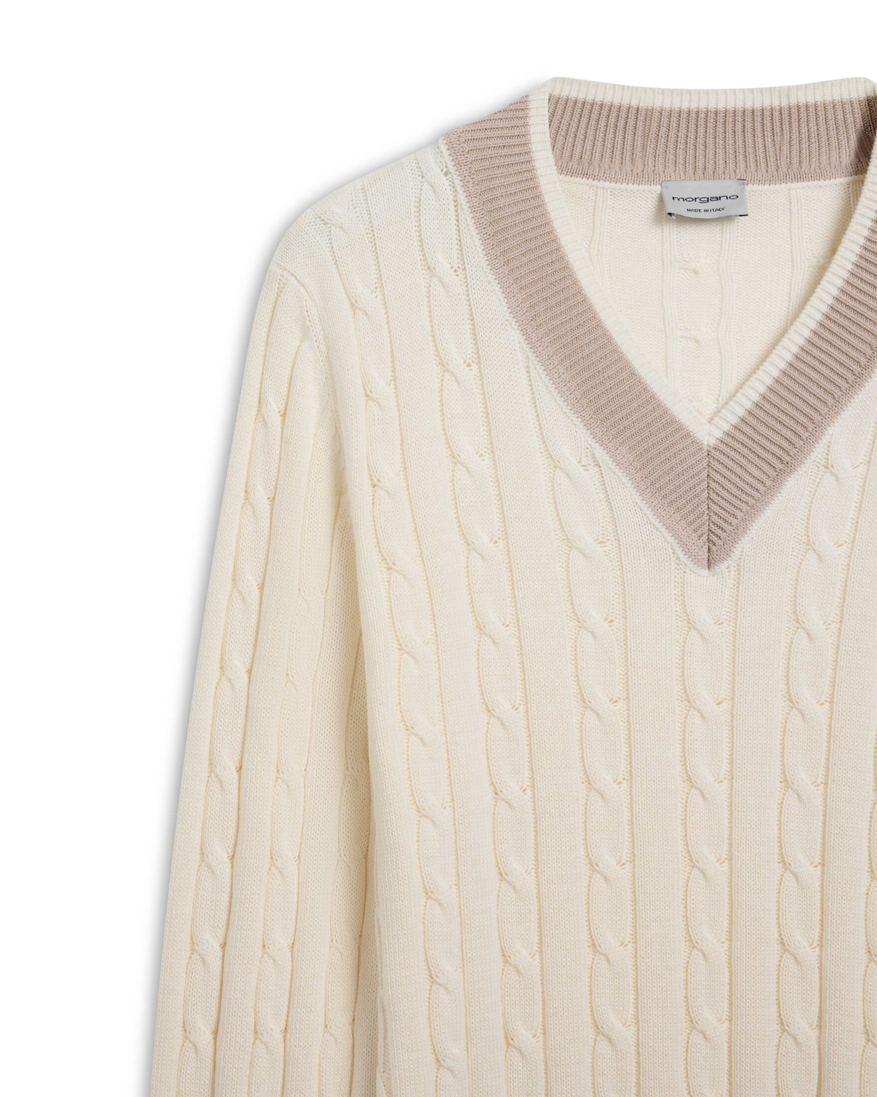 Kabelstrikket genser til herre fra Morgano. Laget i myk og behagelig bomull. V-hals med kontrastdetaljer gir et raffinert og sporty uttrykk. Perfekt over en skjorte for en velkledd stil. Et tidløst plagg som kombinerer komfort og eleganse.