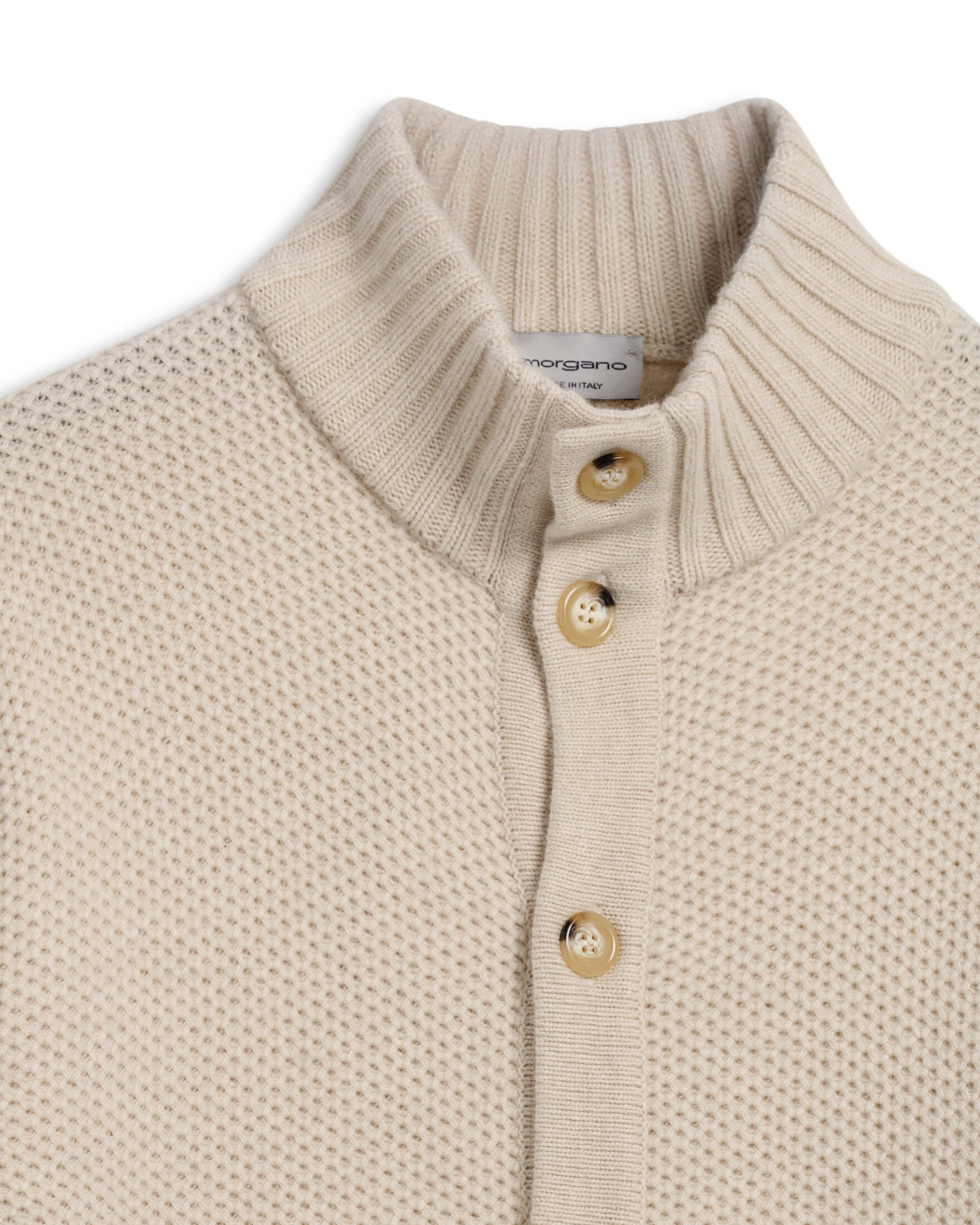 Tidløs cardigan til herre fra Morgano, laget i en eksklusiv blanding av 90% merinoull og 10% kasjmir. Den har strukturert strikk, høy krage og knappelukking for et klassisk og maskulint uttrykk. Perfekt som et varmende lag over skjorte eller t-skjorte. En elegant og komfortabel genser med italiensk håndverk i hver detalj.