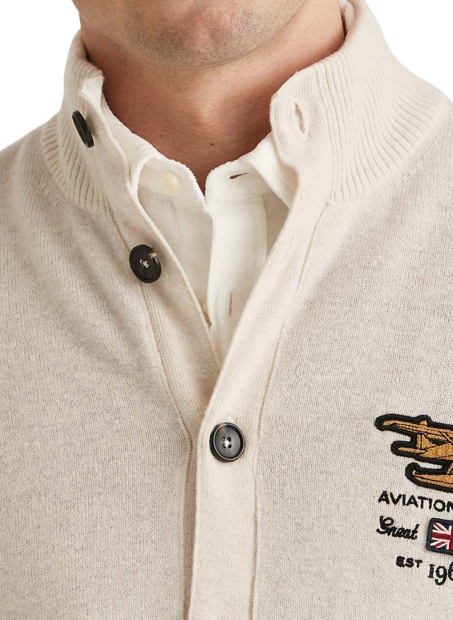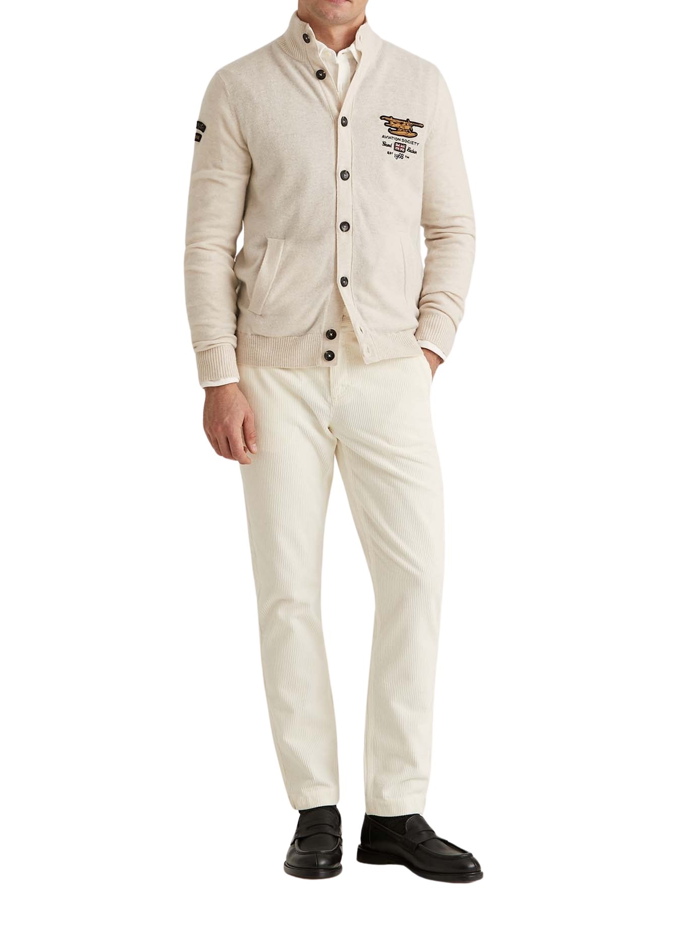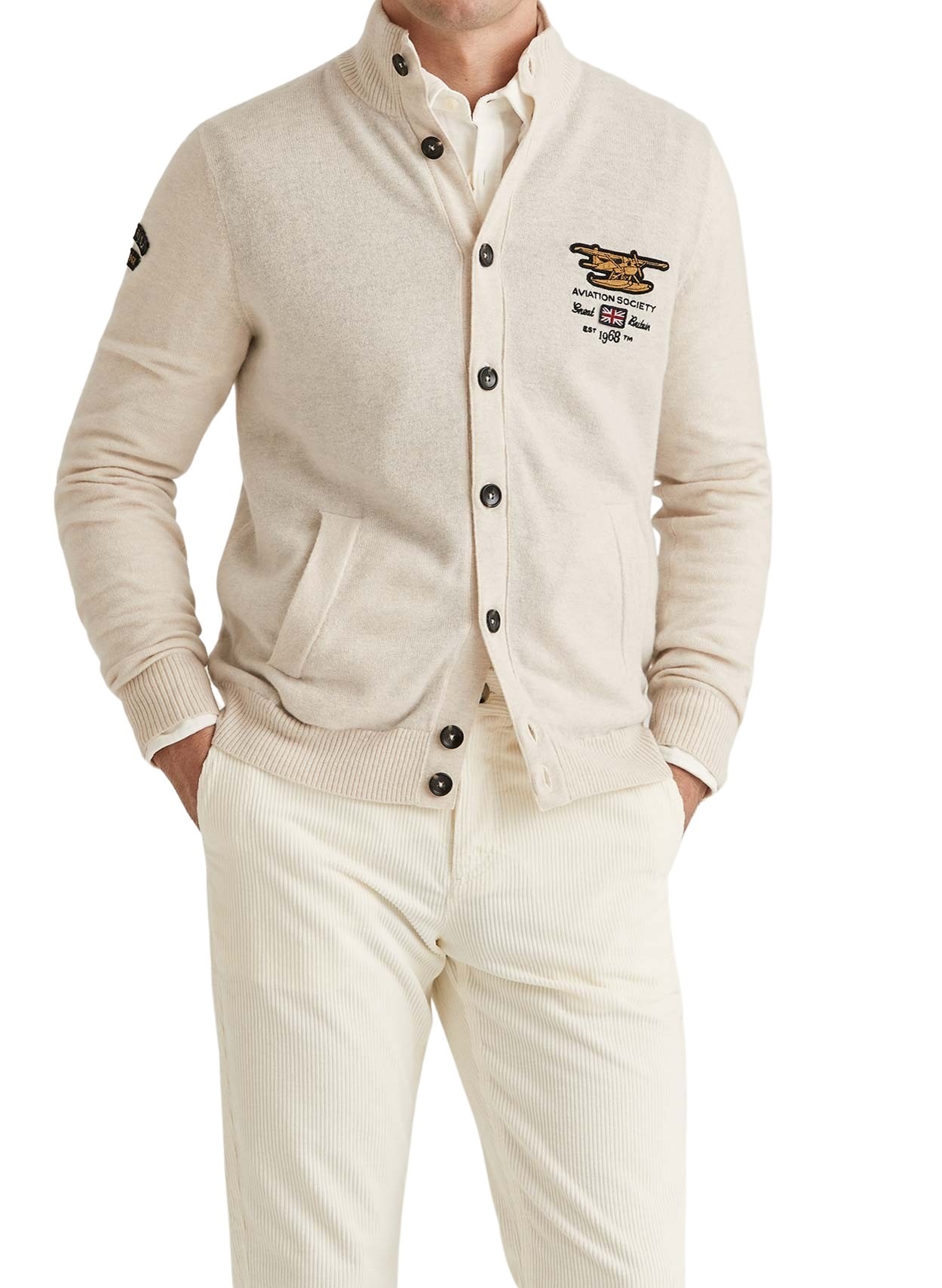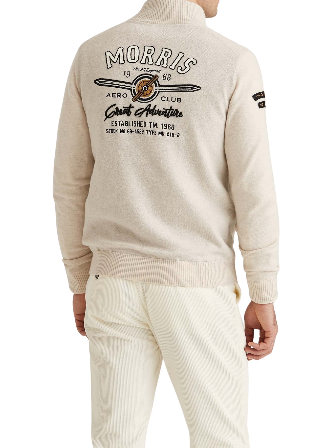 Cardigan til herre fra Morris Stockholm. Strikket jakke, inspirert av vintage luftfartsklubber. Designet med en sporty logo på brystet og over ryggen, gir et hint av nostalgi. Laget av 100% ekstra fin merinoull, som gir en myk og luksuriøs følelse.