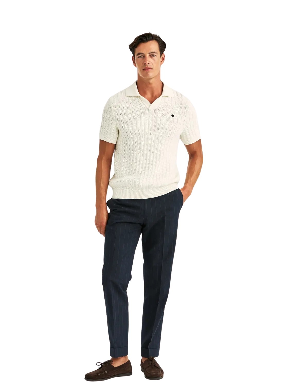 Baldwin Resort Polo fra Morris Stockholm. En stilren poloskjorte i myk bomull med en strukturert, strikket kvalitet. Den åpne kragen gir et avslappet og sofistikert uttrykk inspirert av klassisk riviera-stil. Perfekt til linbukser eller shorts på varme dager.