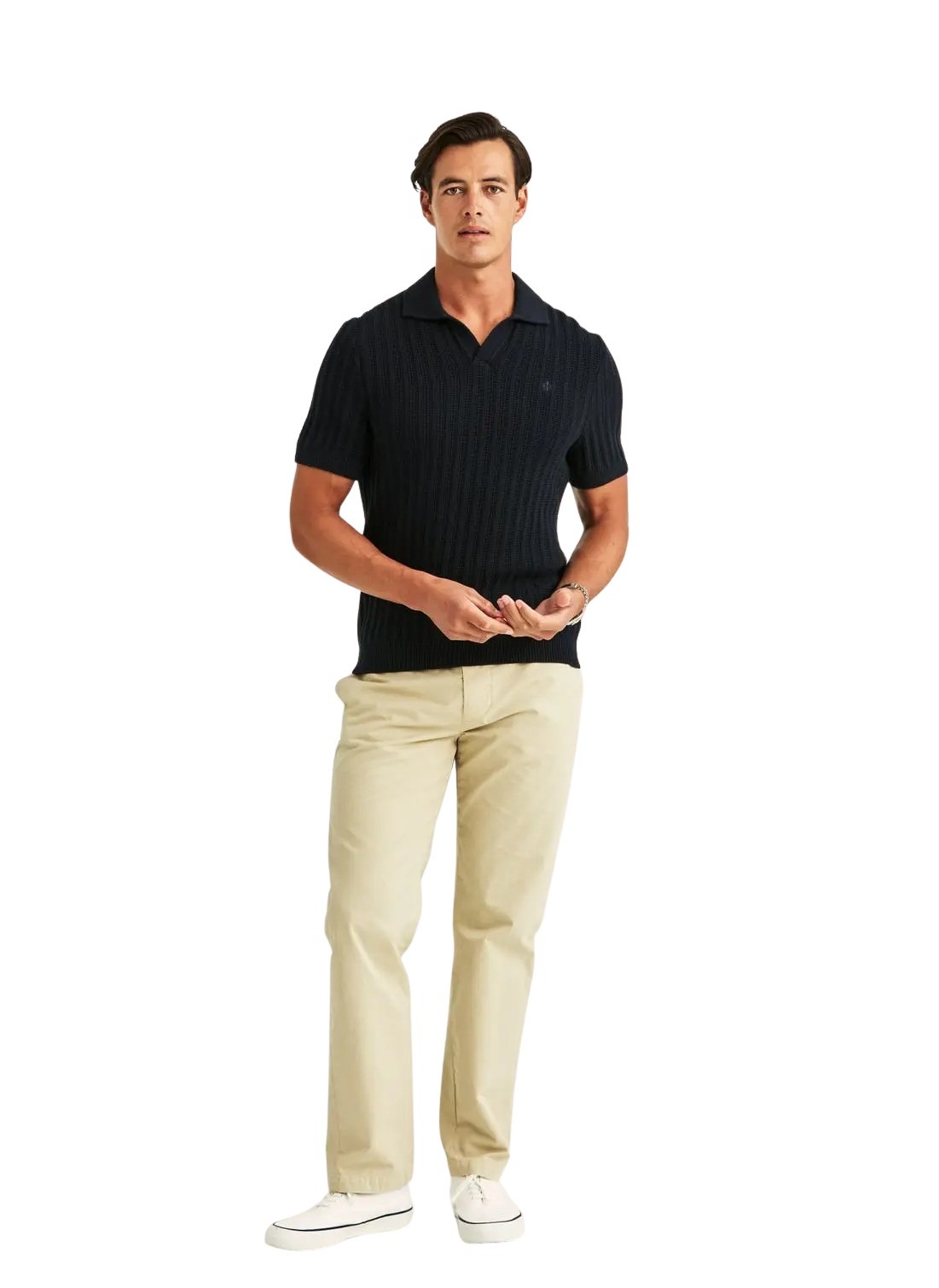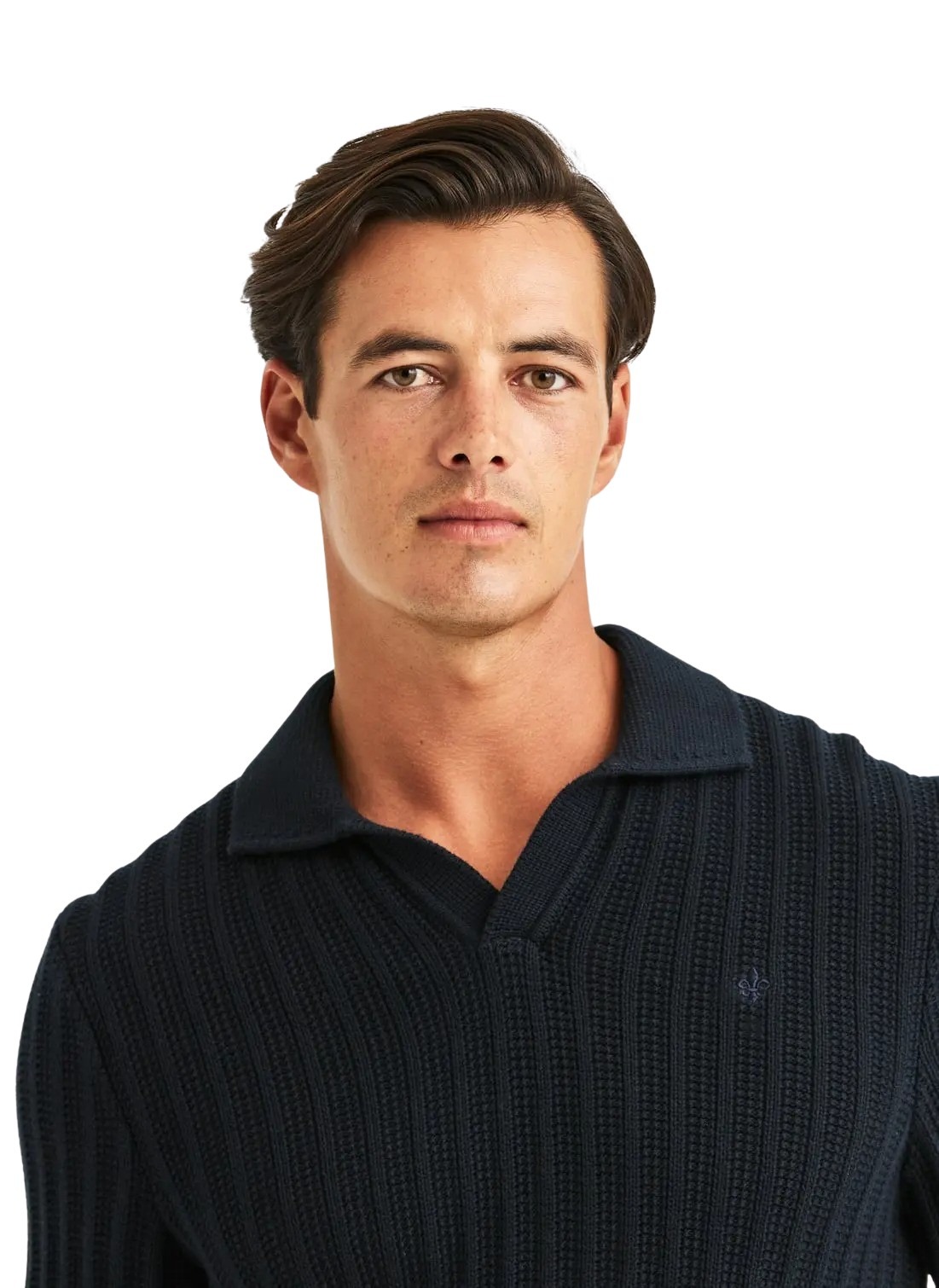 Baldwin Resort Polo fra Morris Stockholm. En stilren poloskjorte i myk bomull med en strukturert, strikket kvalitet. Den åpne kragen gir et avslappet og sofistikert uttrykk inspirert av klassisk riviera-stil. Perfekt til linbukser eller shorts på varme dager.