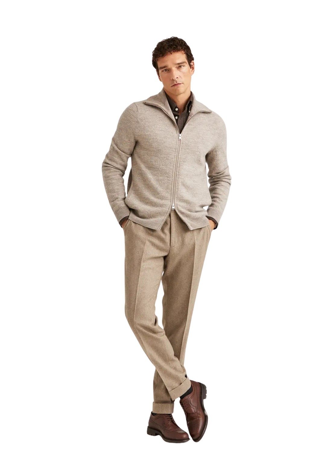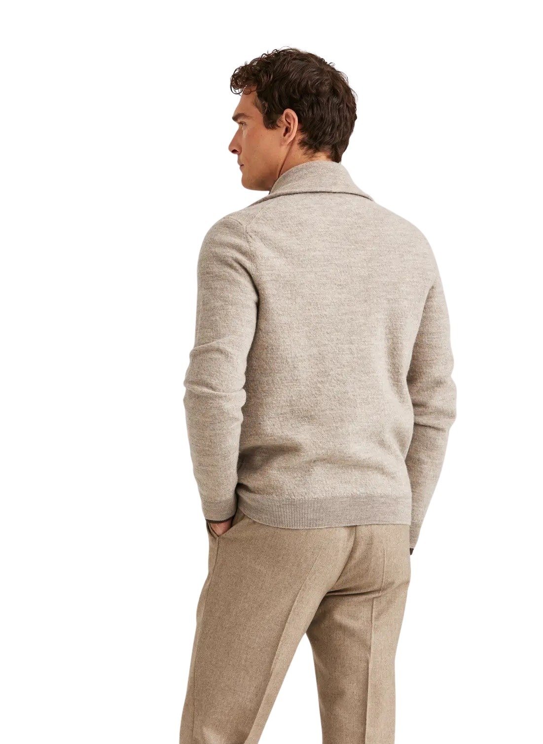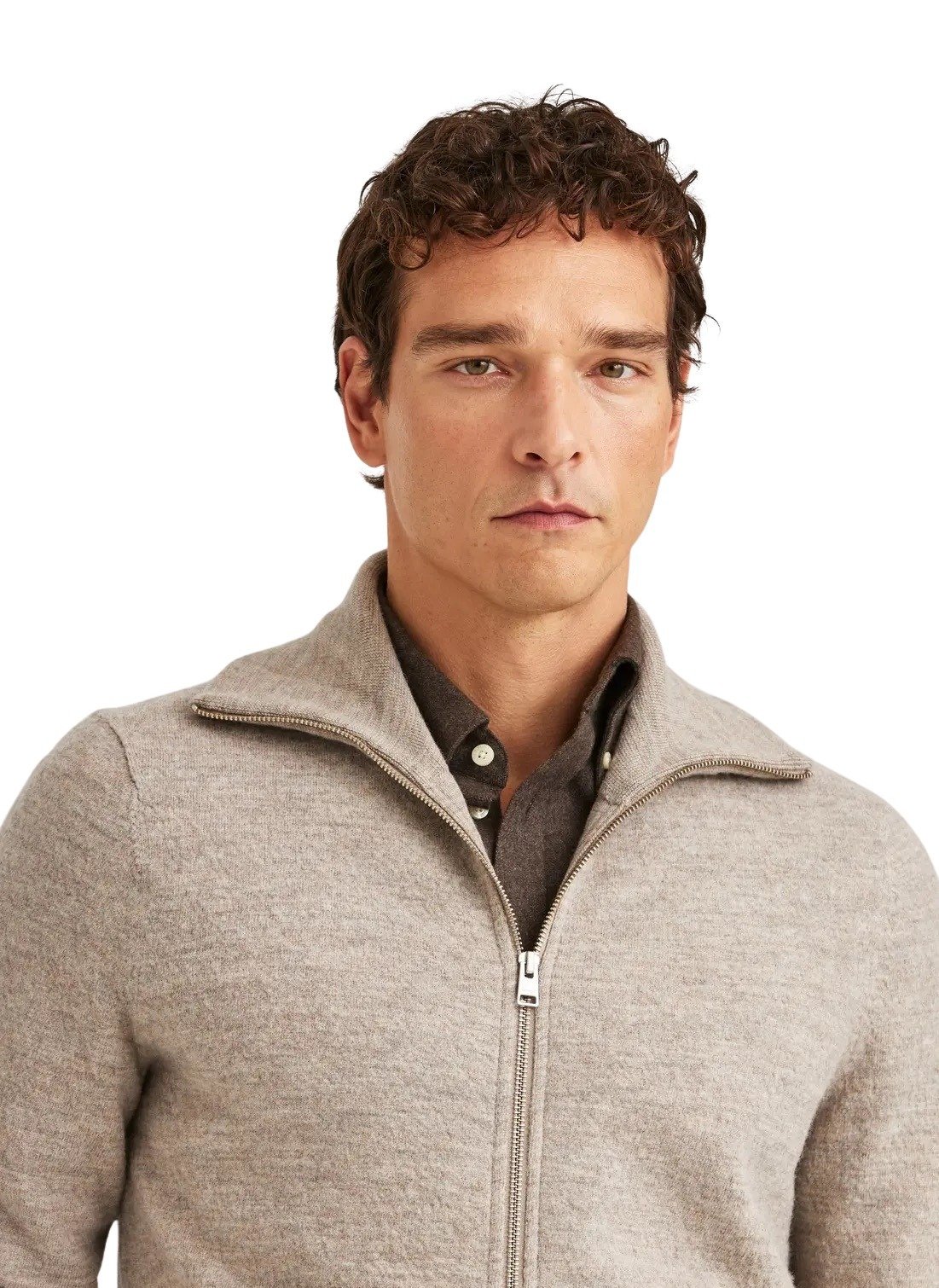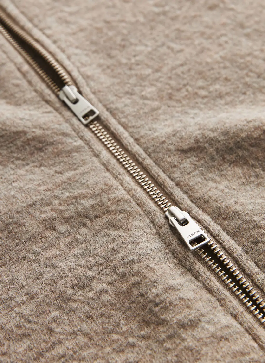 Strikkejakke fra Morris Stockholm. Laget i kokt ull, som gir en varm, solid og teksturert følelse. Den tette kvaliteten beskytter godt mot kulde, samtidig som jakken beholder et rent og stilfullt uttrykk. Med toveis glidelås og høy krage er dette et allsidig plagg for kjølige dager. Perfekt å kombinere med flanellbukser for et helhetlig antrekk.