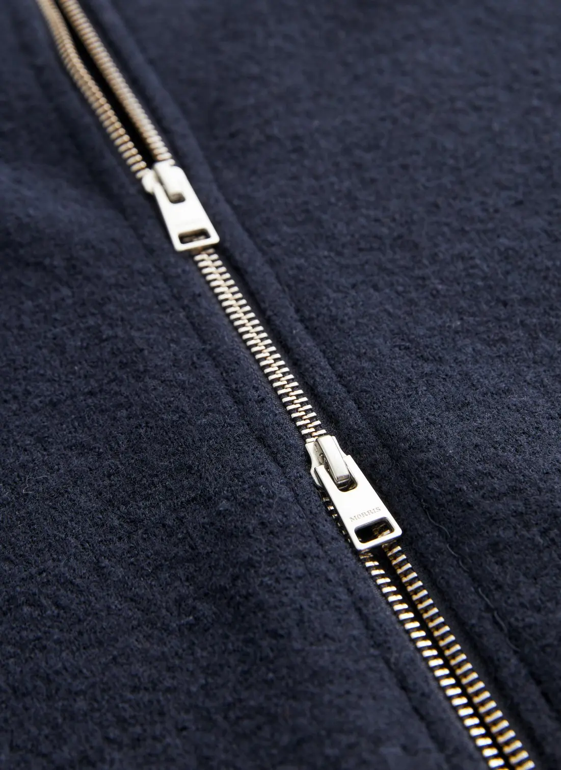 Strikkejakke fra Morris Stockholm. Laget i kokt ull, som gir en varm, solid og teksturert følelse. Den tette kvaliteten beskytter godt mot kulde, samtidig som jakken beholder et rent og stilfullt uttrykk. Med toveis glidelås og høy krage er dette et allsidig plagg for kjølige dager. Perfekt å kombinere med flanellbukser for et helhetlig antrekk.