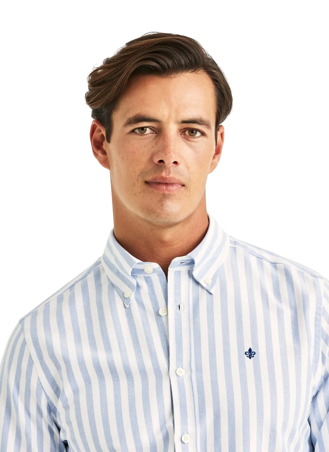 Douglas Oxford Stripe Shirt fra Morris Stockholm. En klassisk skjorte inspirert av britisk preppy-stil. Laget i myk Oxford-bomull med tidløse striper som gir et rent og velkledd uttrykk. Button down-krage og slim fit gir en moderne passform. Perfekt både til hverdags og mer oppdressede anledninger.