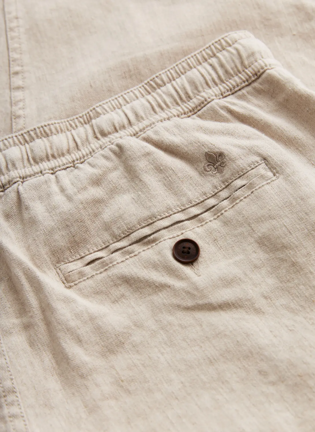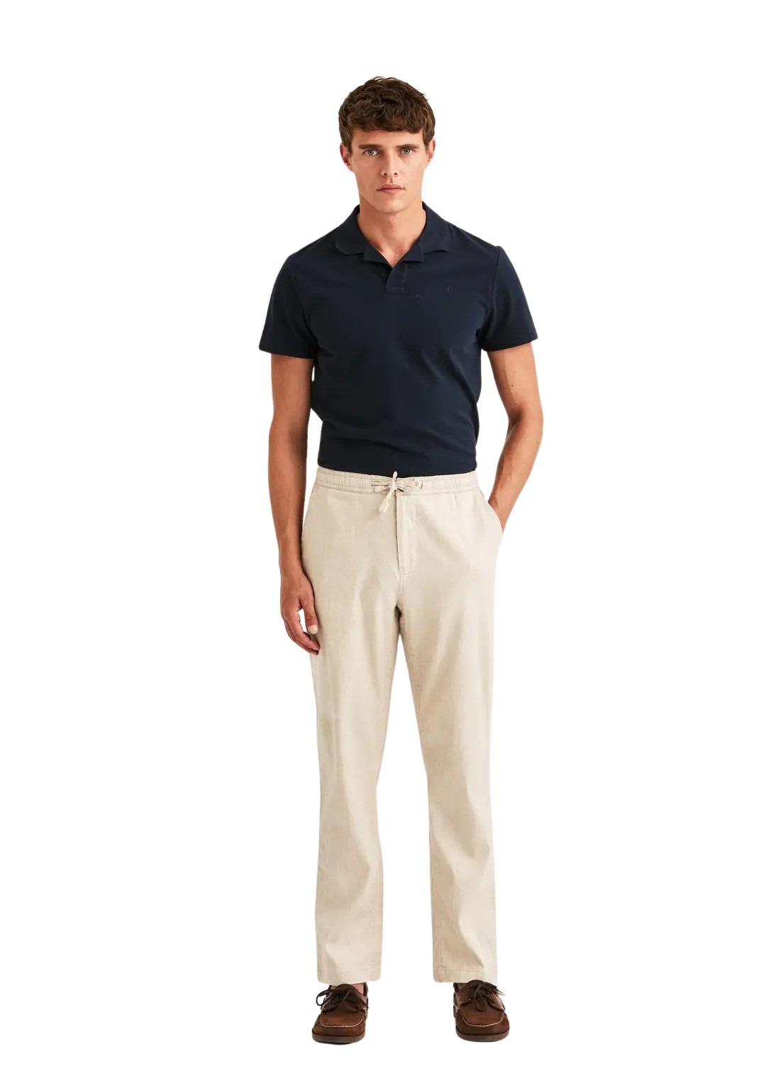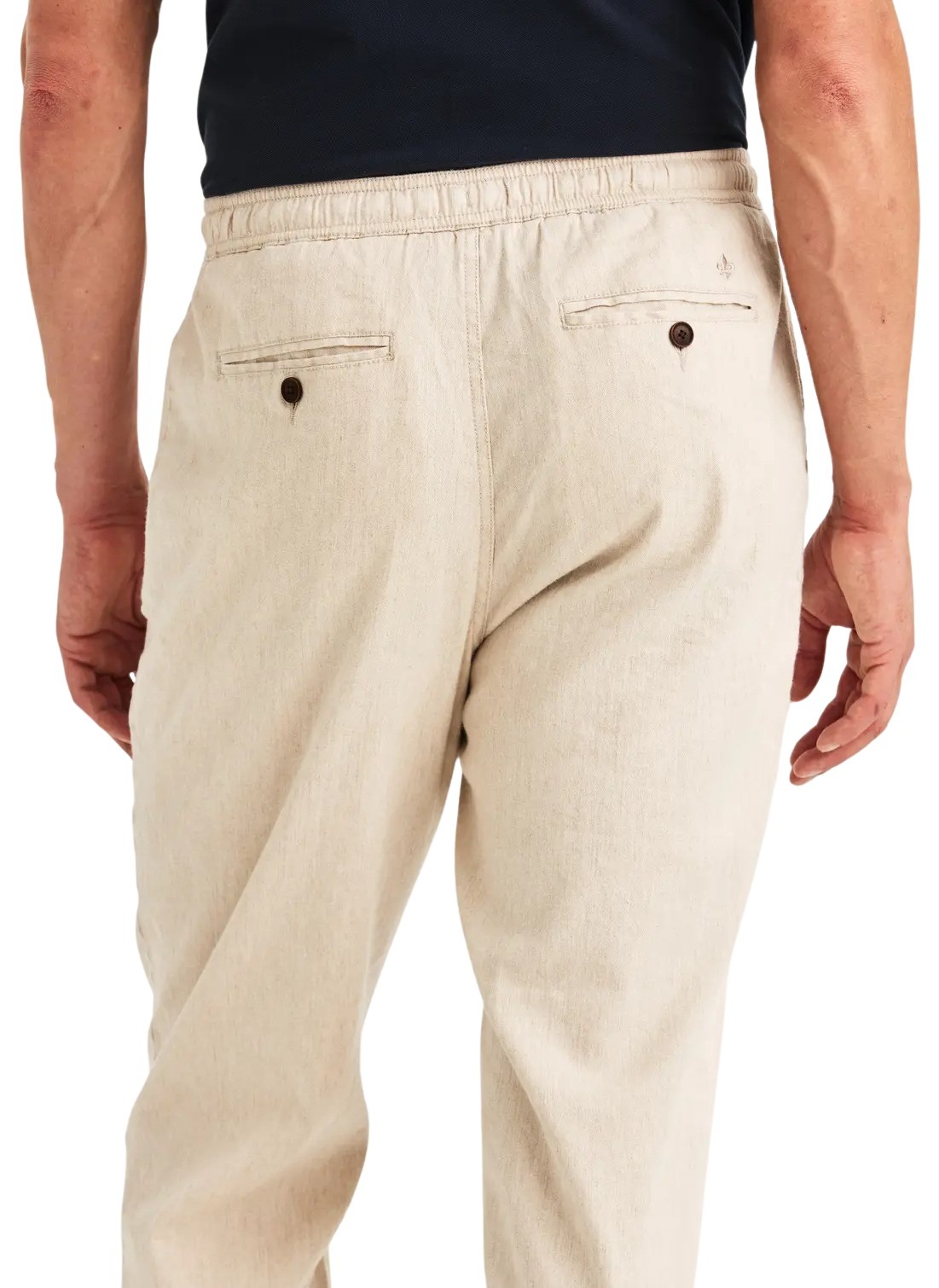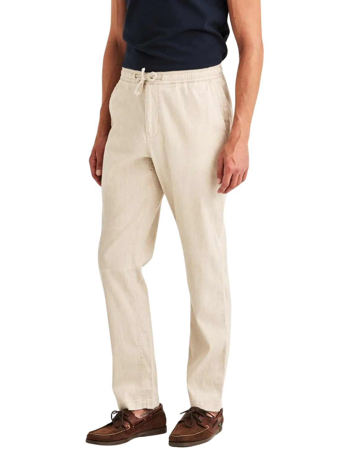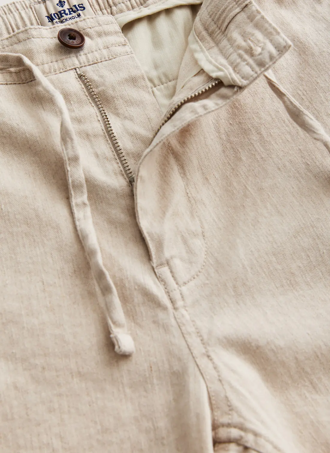 Fenix Linen Trouser fra Morris Stockholm. En lett og komfortabel bukse i en pustende blanding av bomull, lin og stretch – perfekt for varme dager. Den har elastisk linning med snøring som gir en fleksibel og behagelig passform. Kombiner den med en linskjorte eller piqué for en avslappet, men velkledd sommerstil.