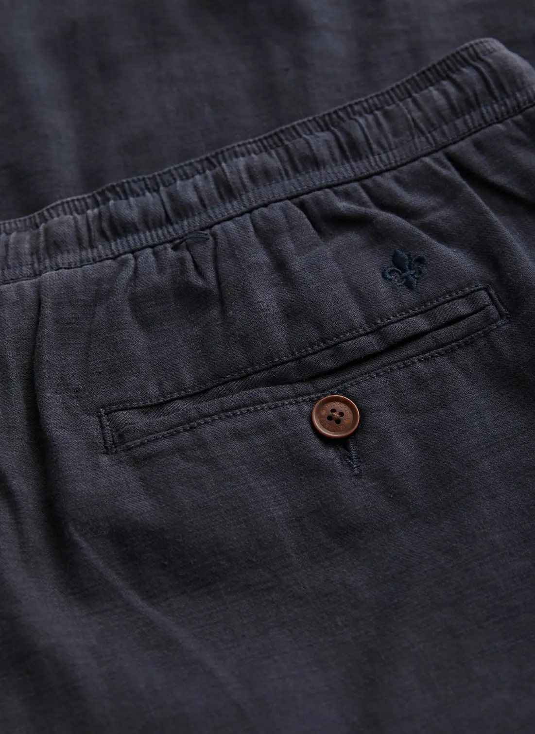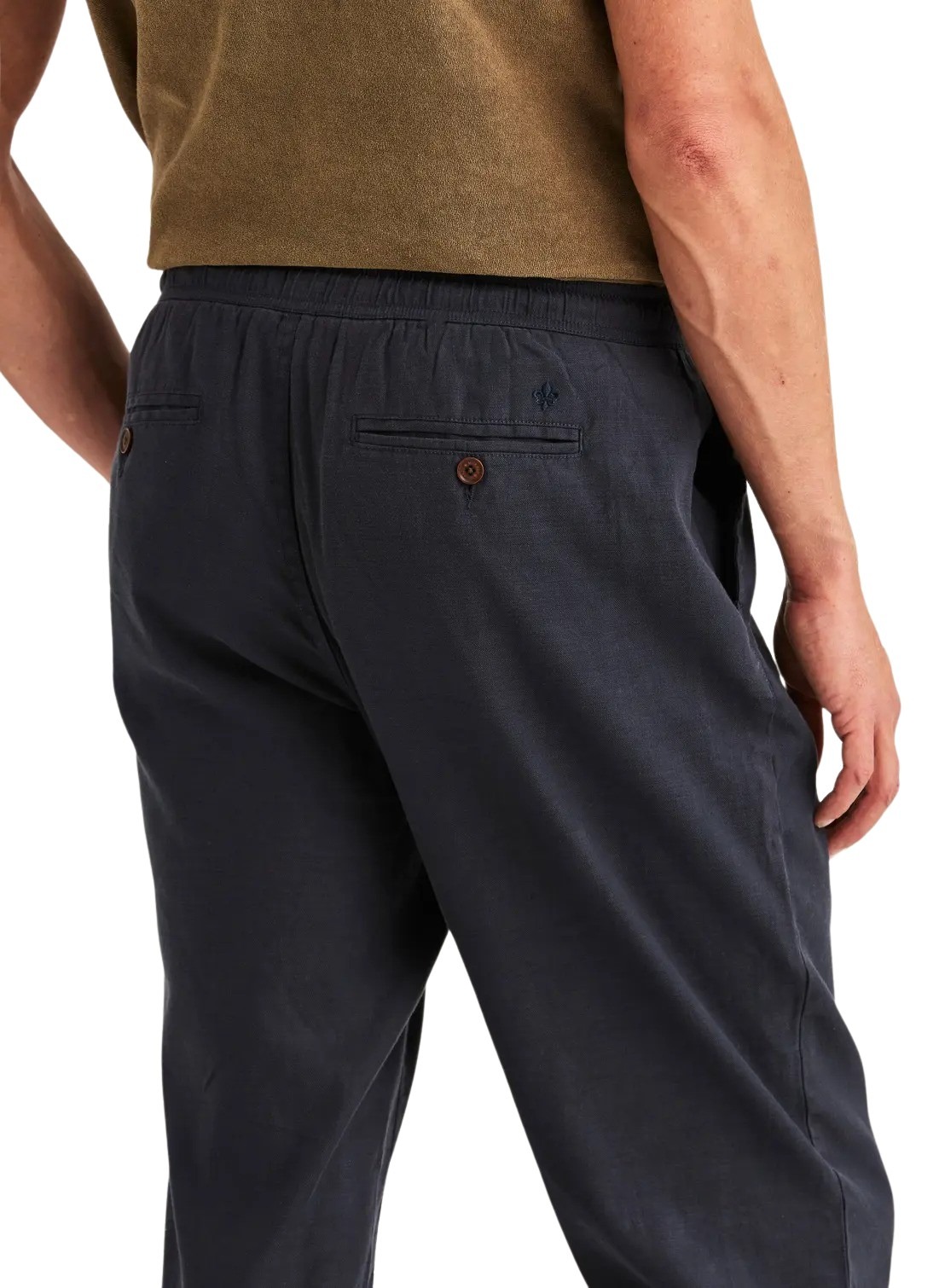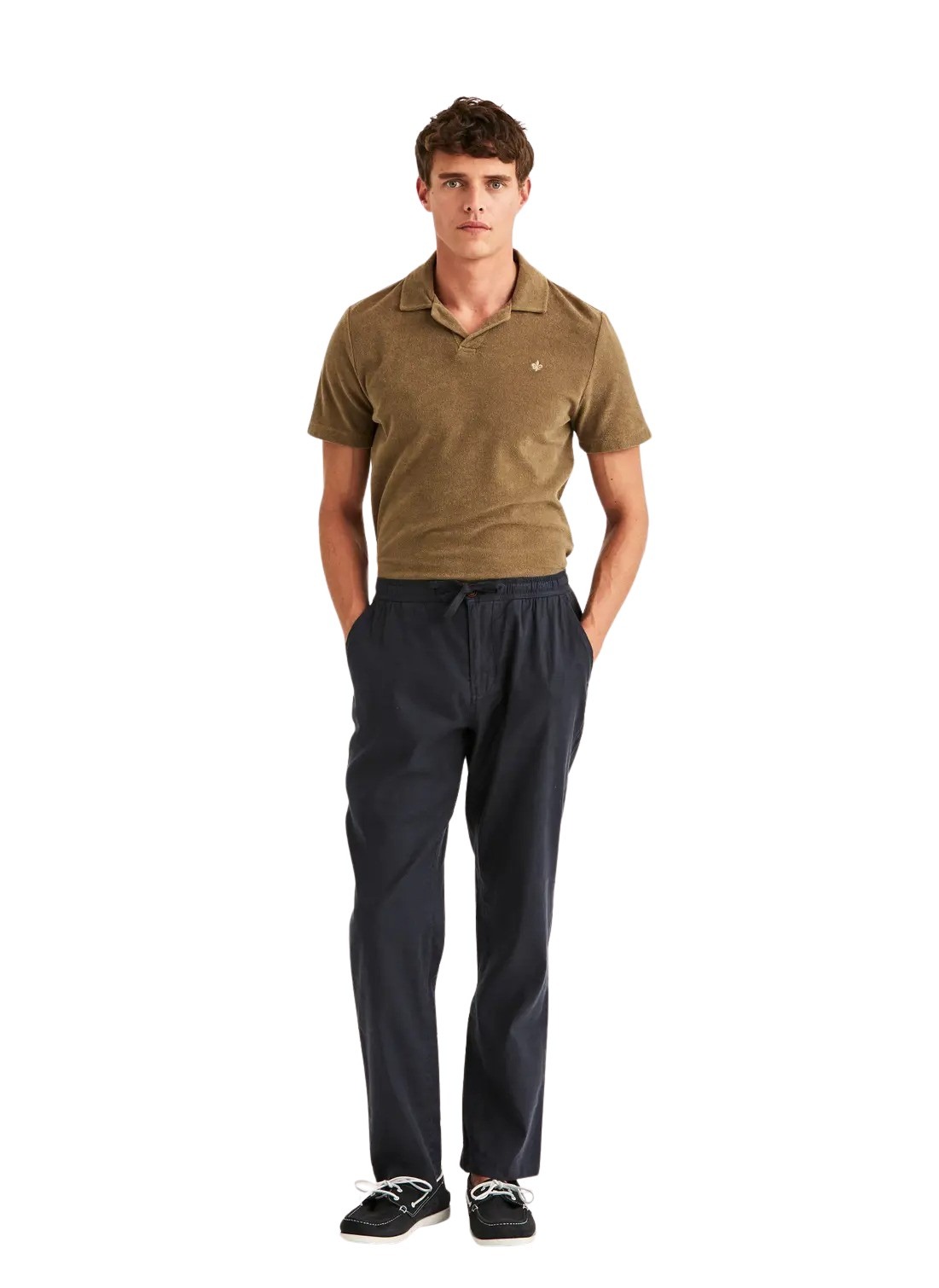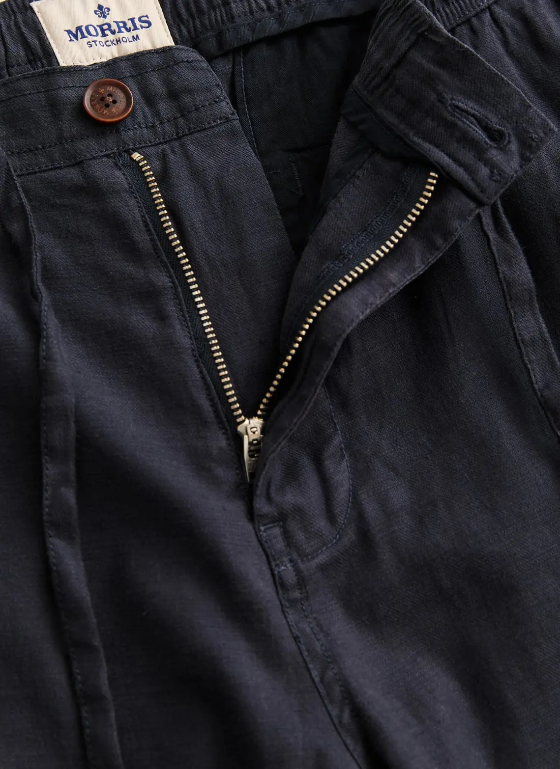Fenix Linen Trouser fra Morris Stockholm. En lett og komfortabel bukse i en pustende blanding av bomull, lin og stretch – perfekt for varme dager. Den har elastisk linning med snøring som gir en fleksibel og behagelig passform. Kombiner den med en linskjorte eller piqué for en avslappet, men velkledd sommerstil.