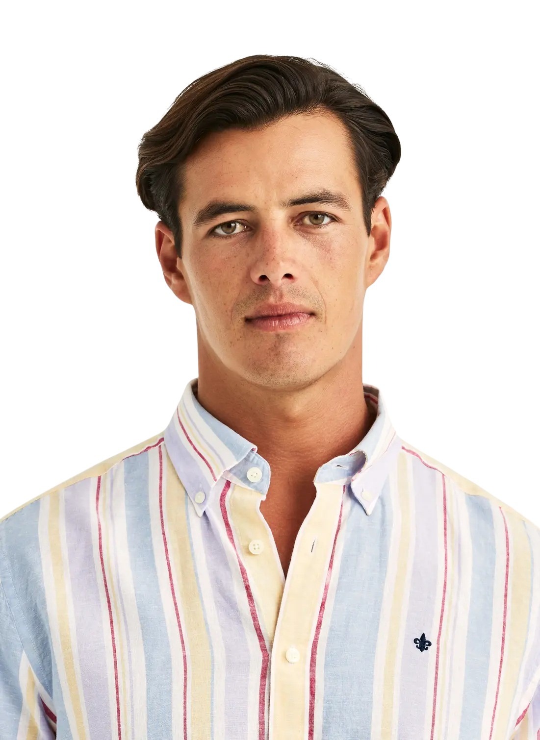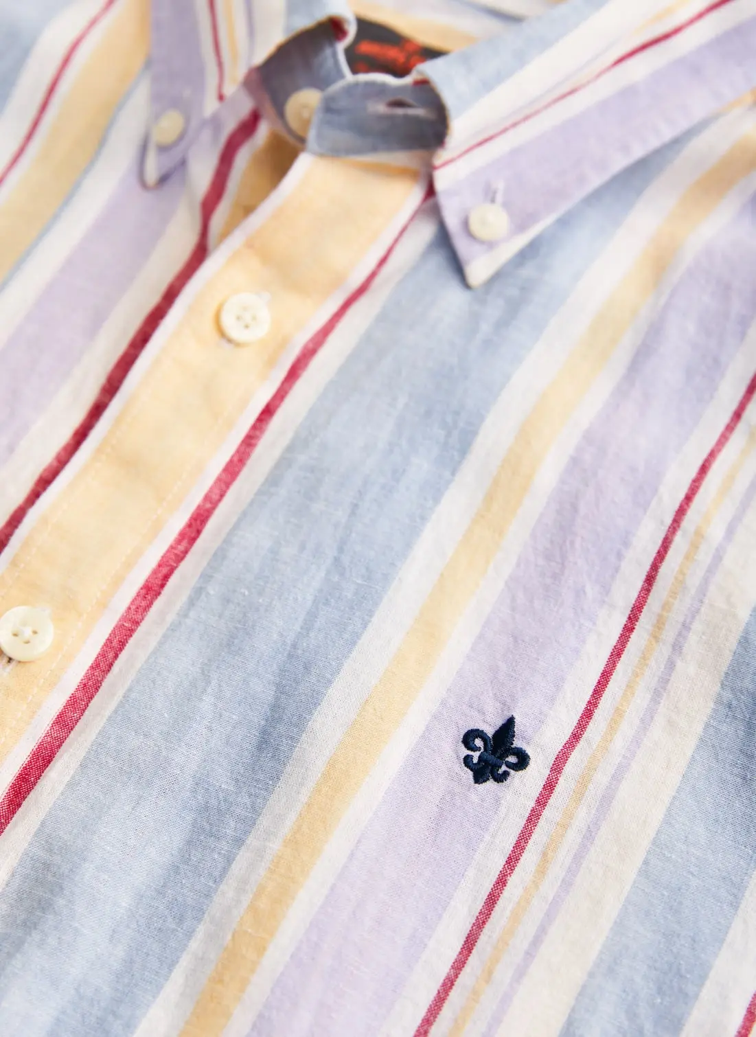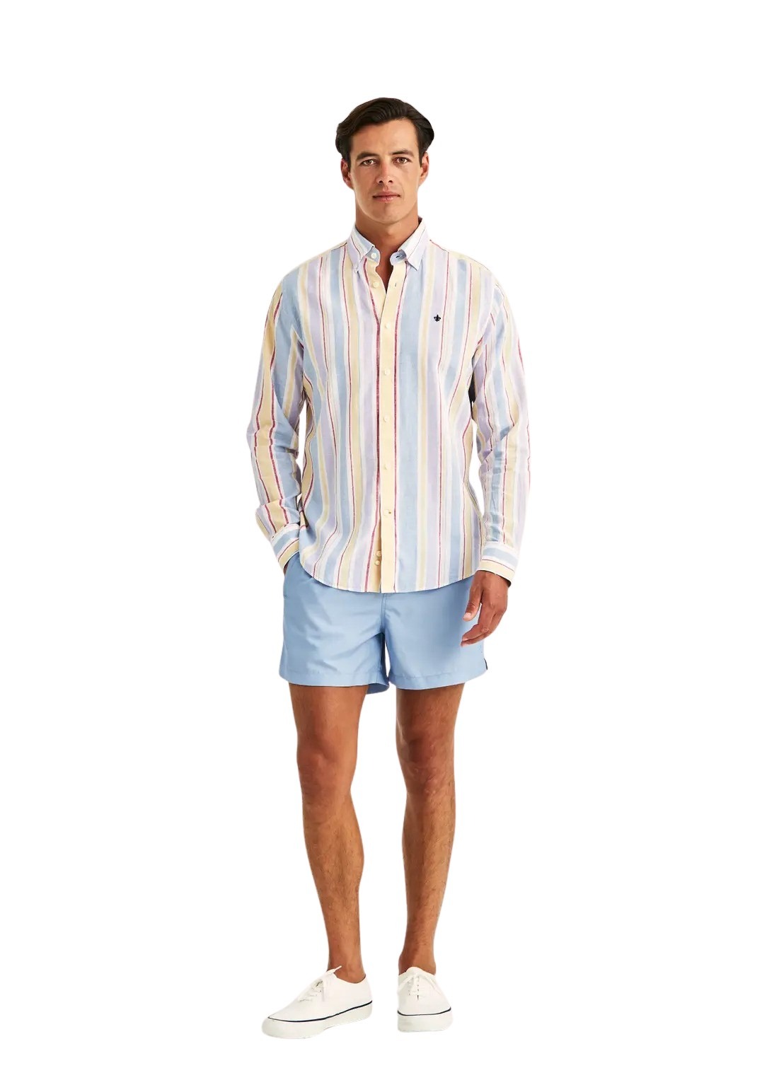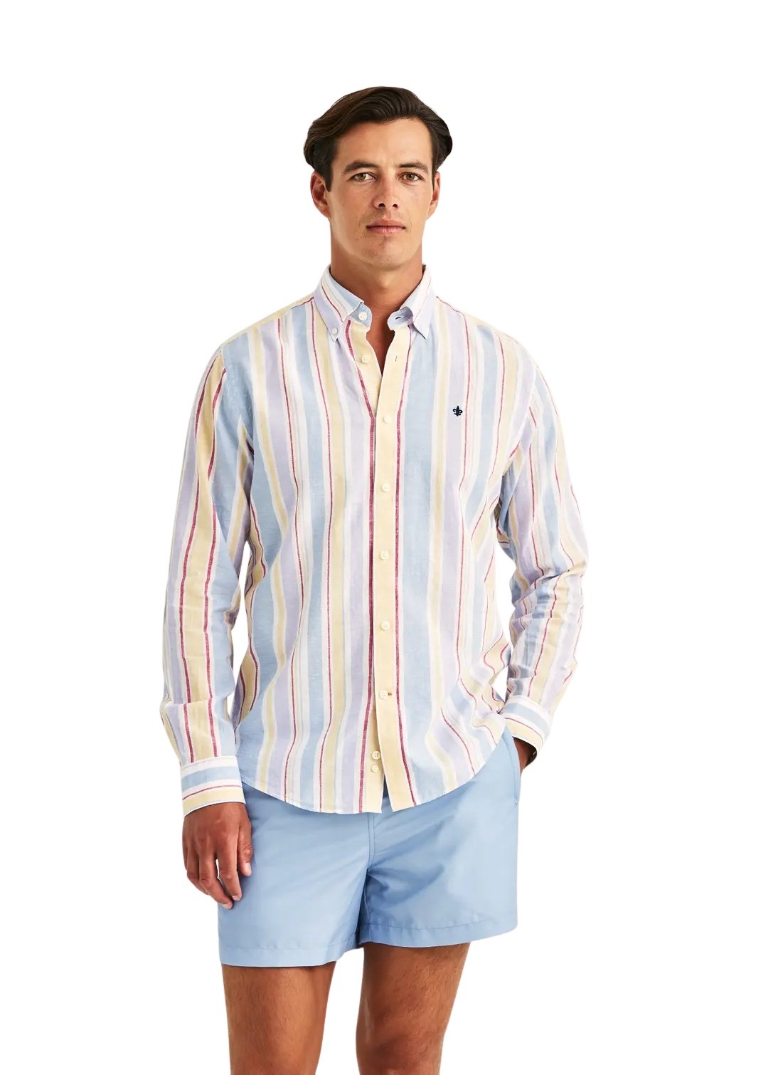 Happy Linen Stripe Shirt fra Morris Stockholm. Et lett og sommerlig uttrykk med sin blanding av lin og bomull. De fargerike stripene tilfører liv og varme til antrekket, perfekt for lyse og avslappede dager. Kombiner med linbukser eller oppbrettede chinos for en preppy, men uanstrengt stil.