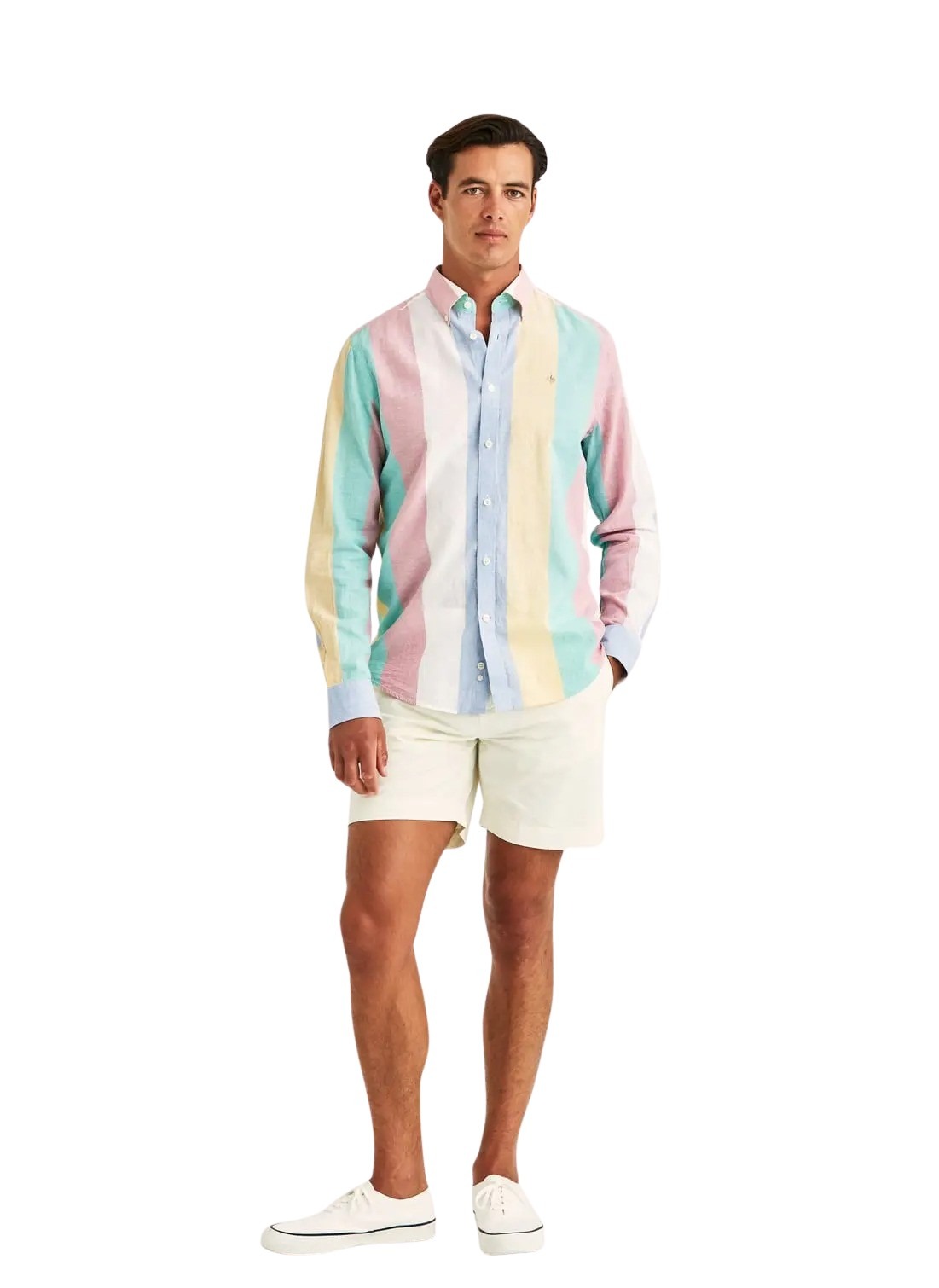 Happy Linen Stripe Shirt fra Morris Stockholm. Et lett og sommerlig uttrykk med sin blanding av lin og bomull. De fargerike stripene tilfører liv og varme til antrekket, perfekt for lyse og avslappede dager. Kombiner med linbukser eller oppbrettede chinos for en preppy, men uanstrengt stil.