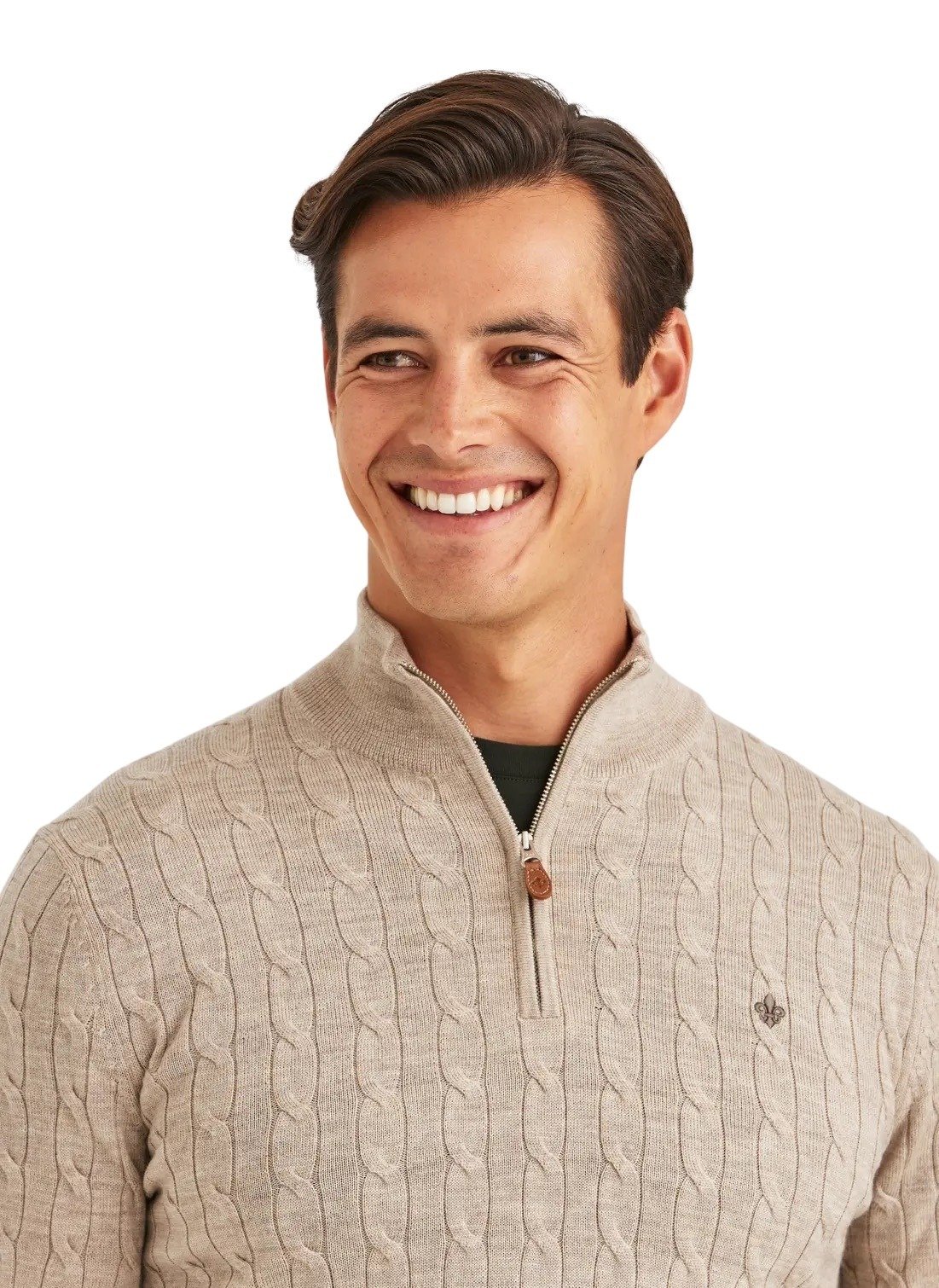 Half-zip til herre fra Morris Stockholm. Laget av 100 % merinoull – en naturlig fiber kjent for sine temperaturregulerende egenskaper. Genseren har halv glidelås, høy krage, og en tidløs kabelstrikket tekstur. En smart investering, sesong etter sesong.