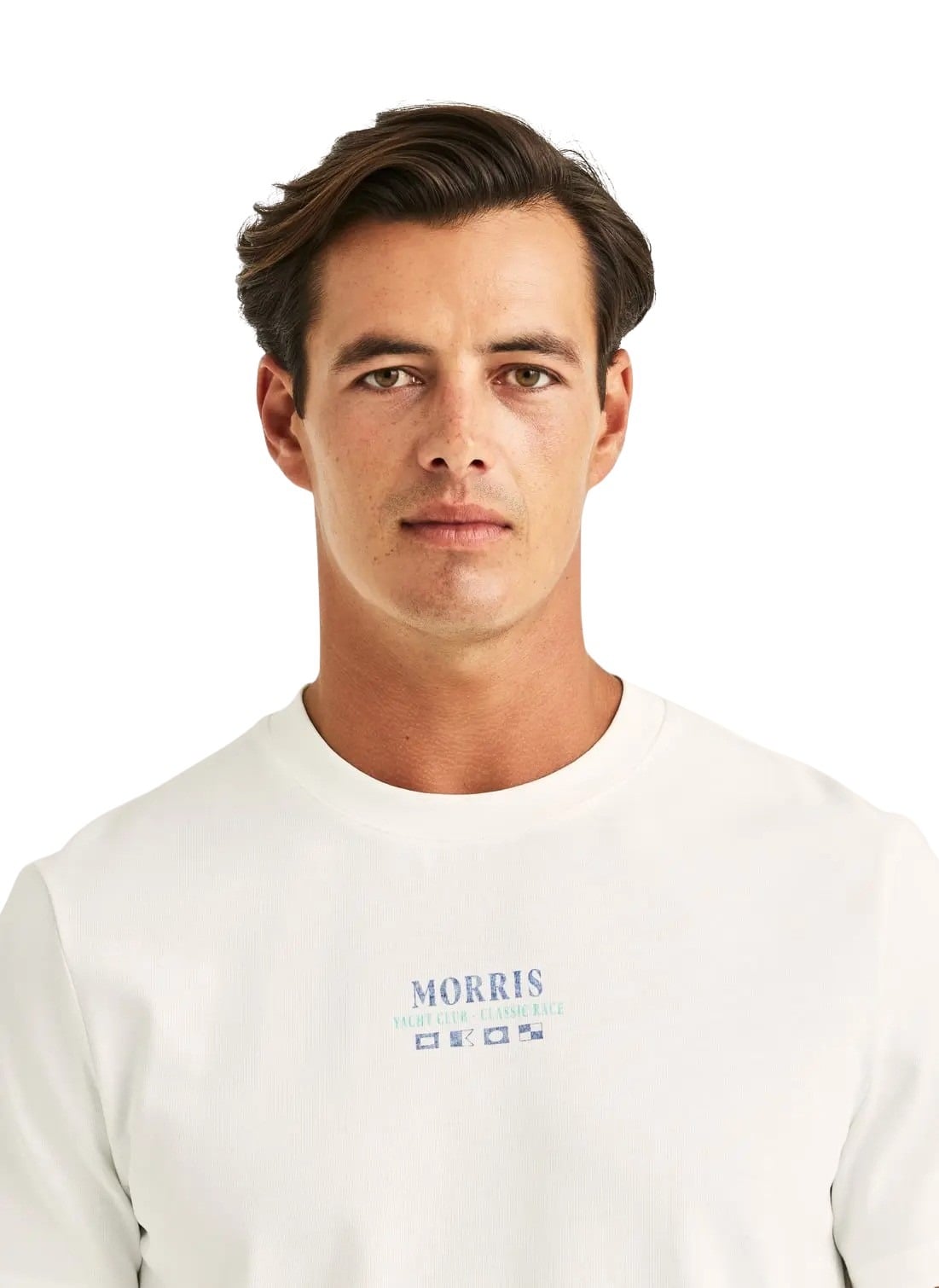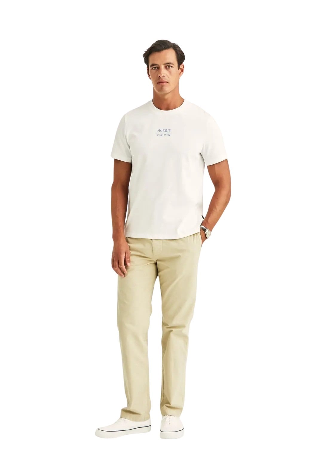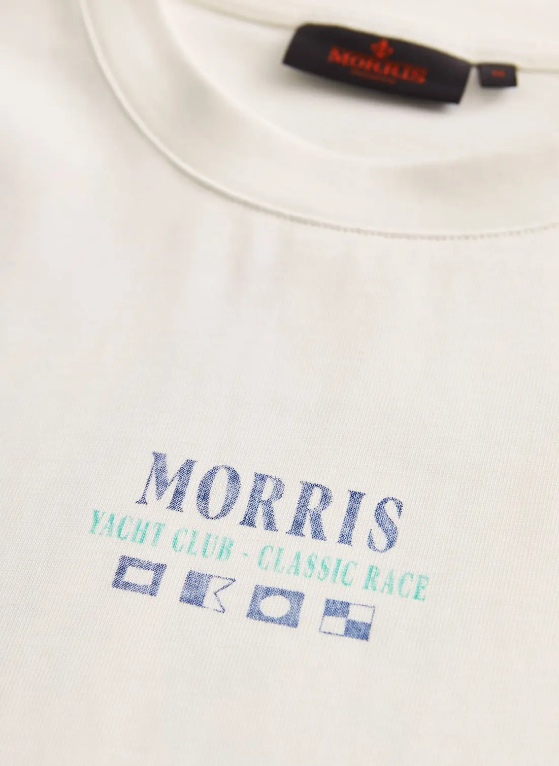Neville Tee fra Morris Stockholm. En myk og komfortabel t-skjorte i 100% bomull, med maritimt print på ryggen og en stilren logo på brystet. Den puster godt og passer perfekt til både hverdagsbruk og sommerlige antrekk. Style den med linshorts eller jeans for en avslappet look med en tydelig seaside-vibe.