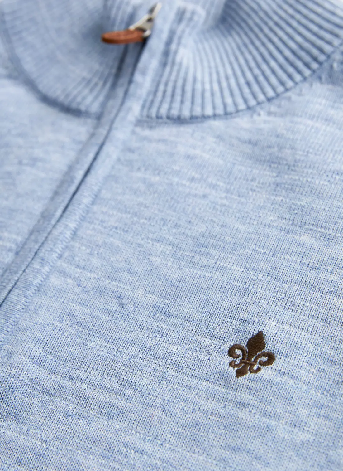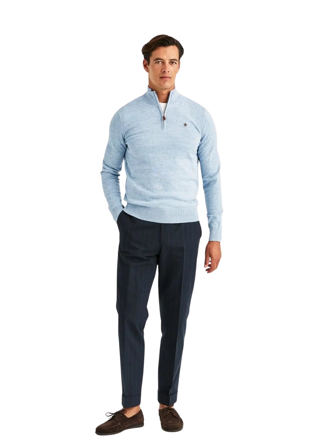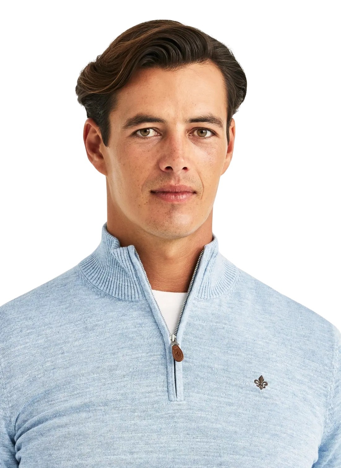 Randall Half Zip fra Morris Stockholm. En lett og behagelig genser i 100% bomull, perfekt for vårsesongen. Den er enkel å style i lag og gir komfort hele dagen, med en smal og velkledd silhuett. Den broderte liljen på brystet tilfører en elegant signatur.