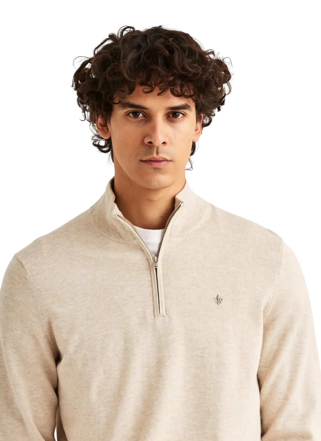 Riley Half Zip fra Morris Stockholm. En klassisk strikkegenser i myk bomull med en behagelig og litt tyngre kvalitet. Half-zip kragen gjør den enkel å style både til hverdags og mer oppdressede antrekk. Den broderte Morris-liljen på brystet gir et stilrent og tidløst uttrykk.