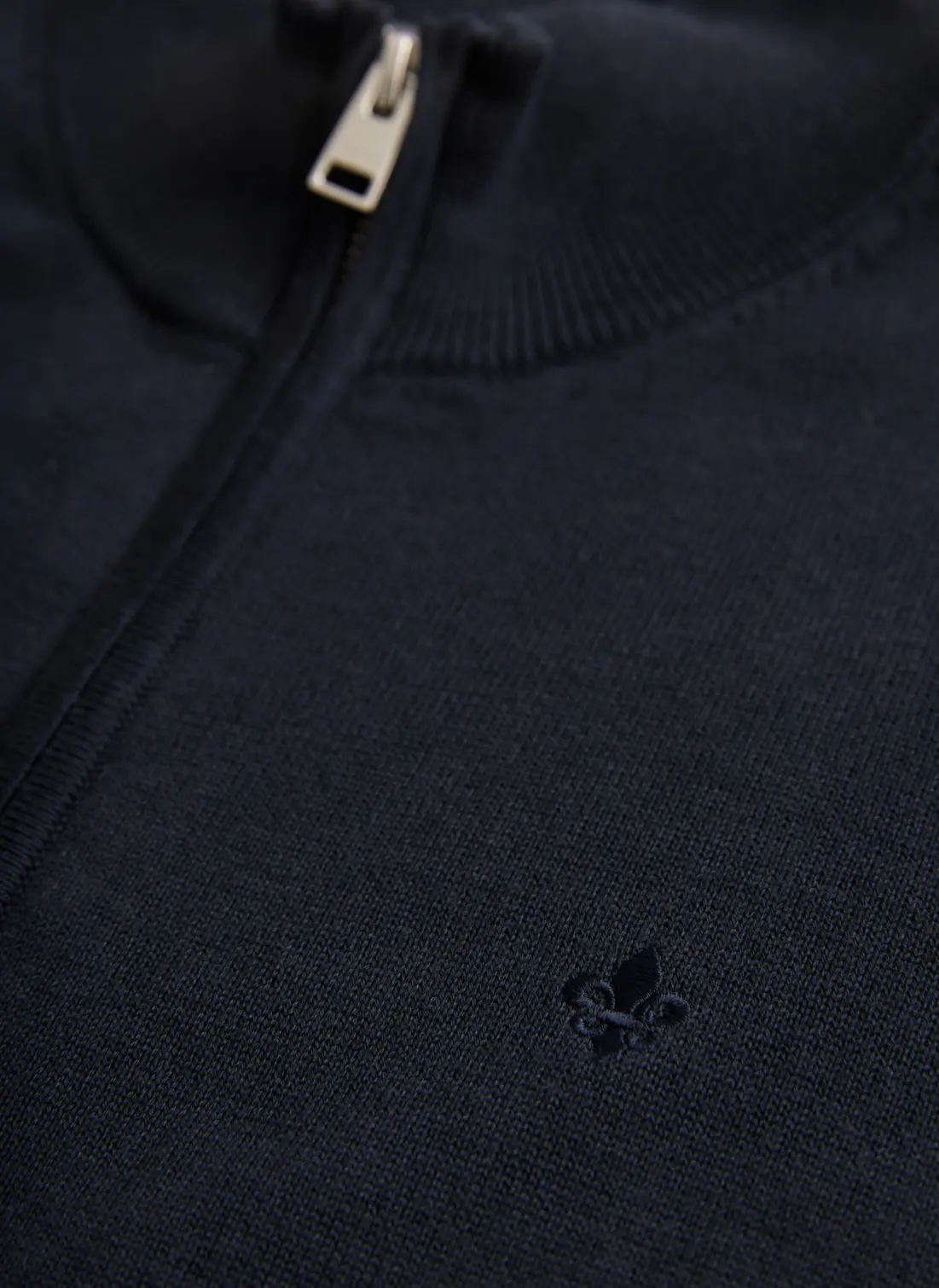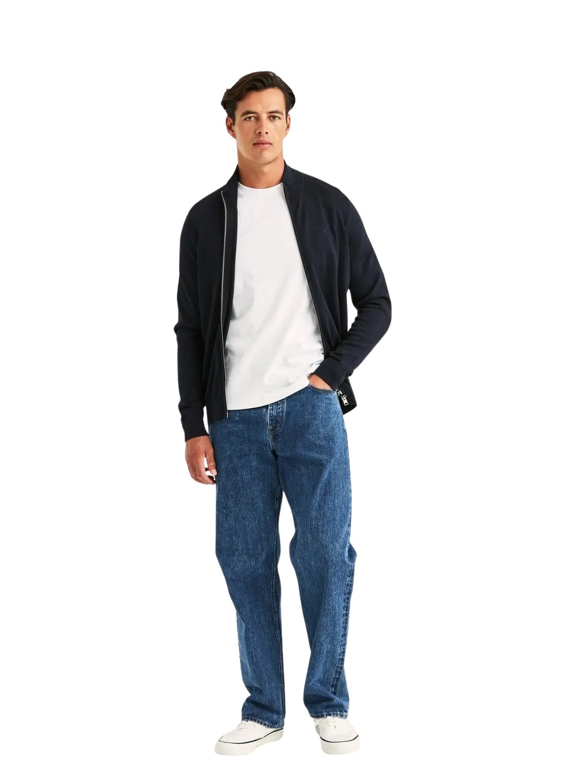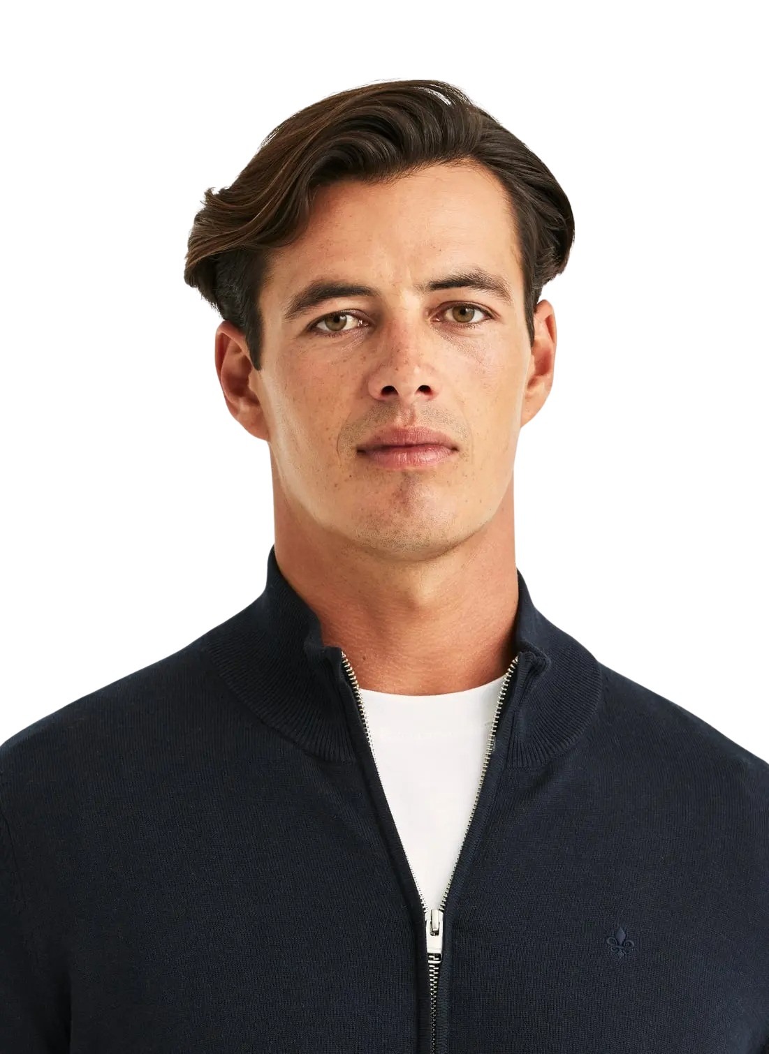 Riley Zip Cardigan fra Morris Stockholm. En klassisk cardigan i myk bomull. Den har full glidelås og en komfortabel passform som gjør den enkel å bruke over både skjorter og t-skjorter. Den broderte Morris-liljen på brystet gir et stilrent og tidløst uttrykk.