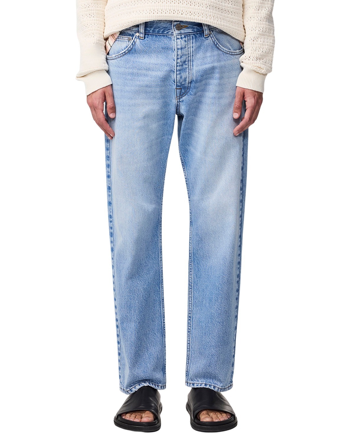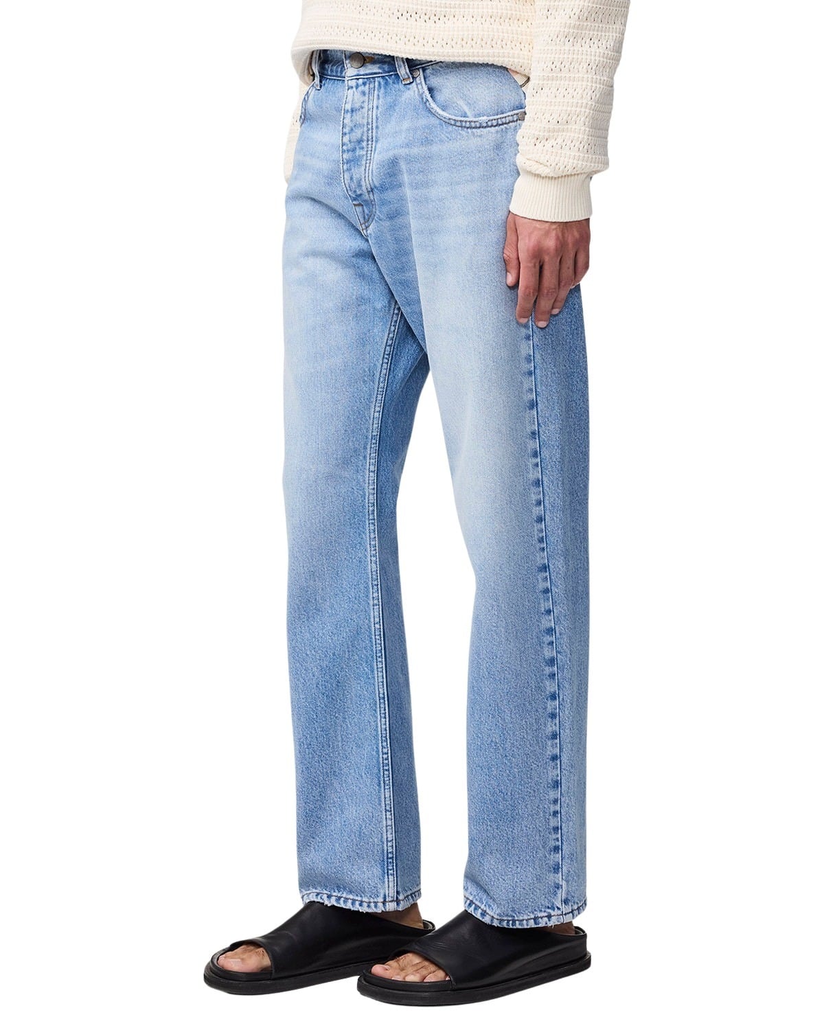 Jeans til herre fra NN07 med rette ben. Laget av bleket, mellomtung økologisk bomullsdenim. 5-lommers modell med knappelukking i gylf og matchende nagler. En stilsikker jeans som aldri går av moten.