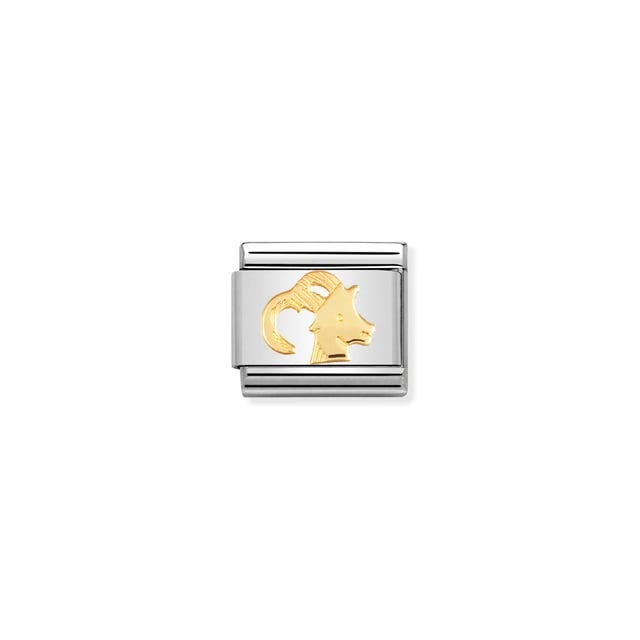 Zodiac Sign Link fra Nomination. Et stilrent stjernetegn i rustfritt stål med detaljer i gult gull, perfekt for å gi armbåndet ditt et personlig preg.