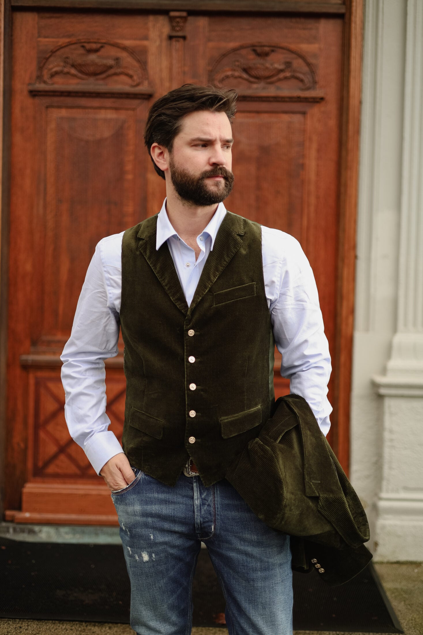 Vest til herre fra Not My First. Laget i myk, italiensk corduroy og har et tidløst uttrykk som passer til både skjorte og blazer. Blazeren har fem gullknapper, tre lommer og en justerbar spenne bak for perfekt passform. En komfortabel og stilfull vest i en slim fasong.