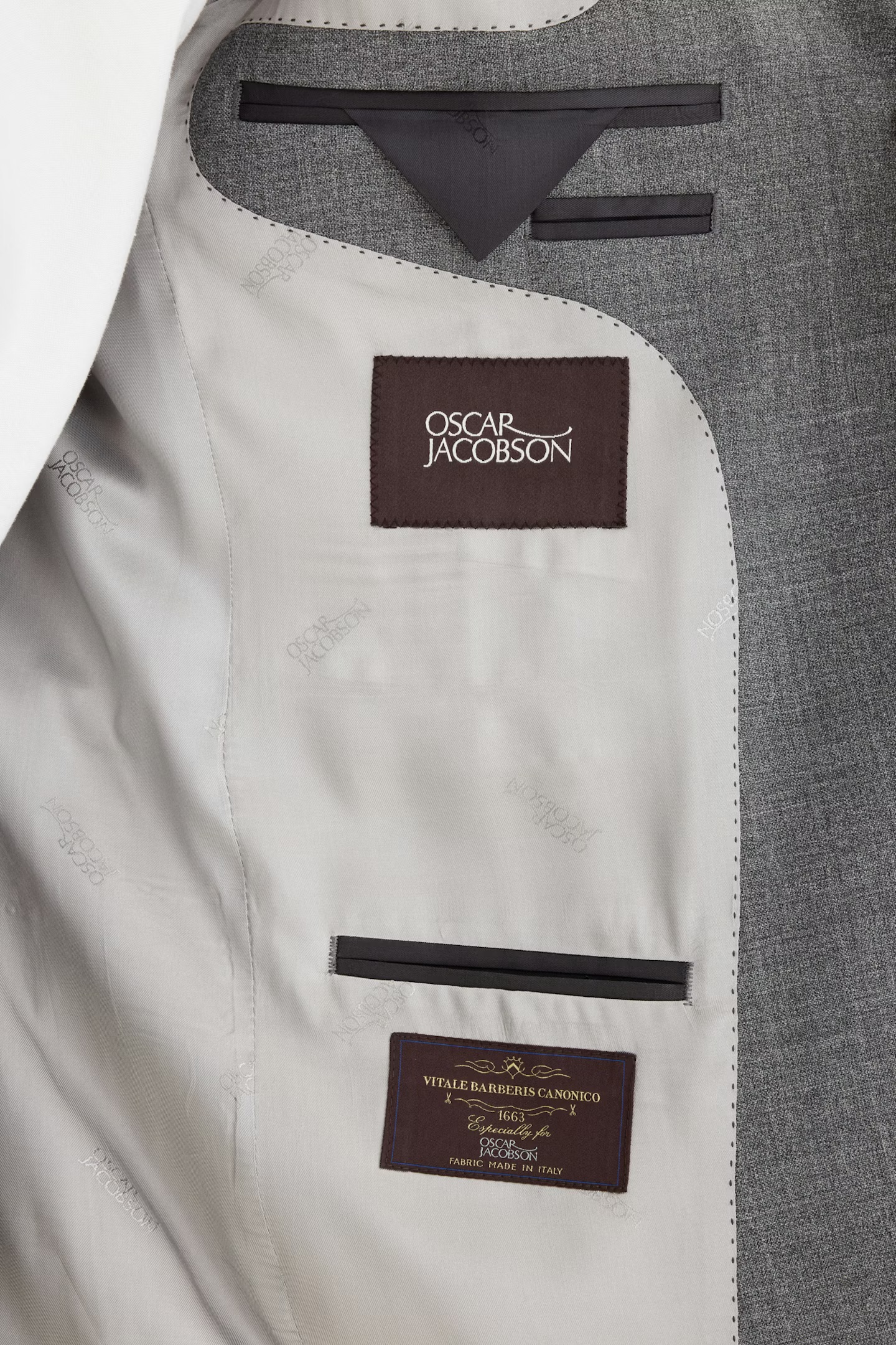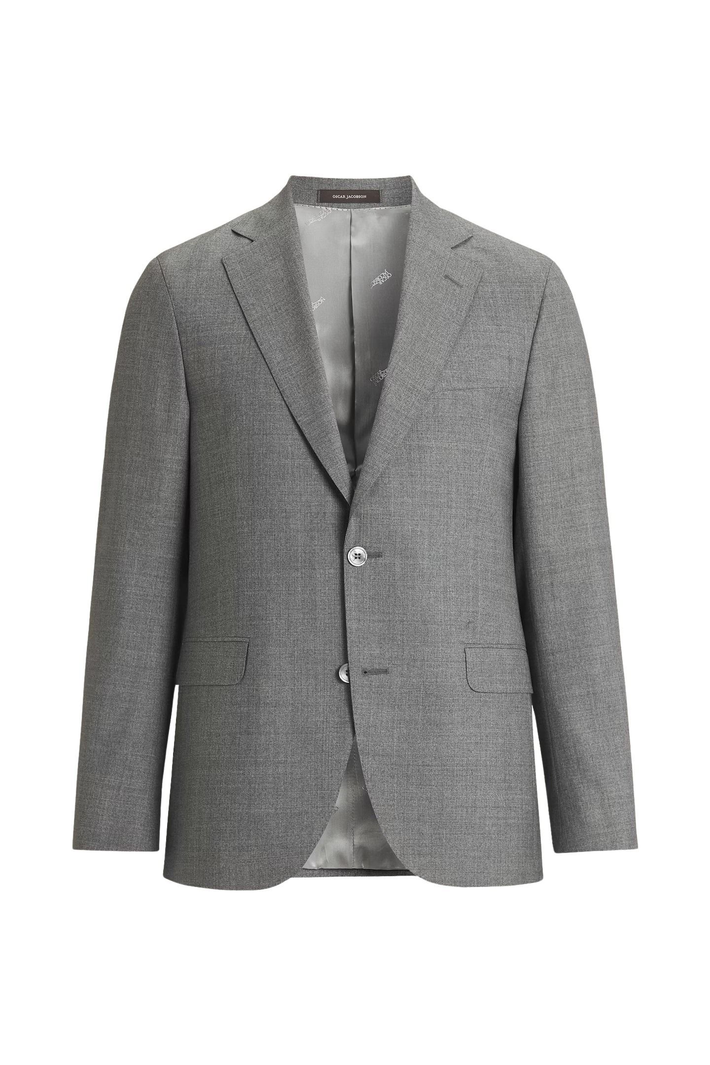 Blazer til herre fra Oscar Jacobson. Slim fit-modell i eksklusiv sharkskin-vevd ull fra Vitale Barberis Canonico. Den myke skulderkonstruksjonen og det rene designet gir et sofistikert og moderne uttrykk som er perfekt til både kontor og formelle anledninger.