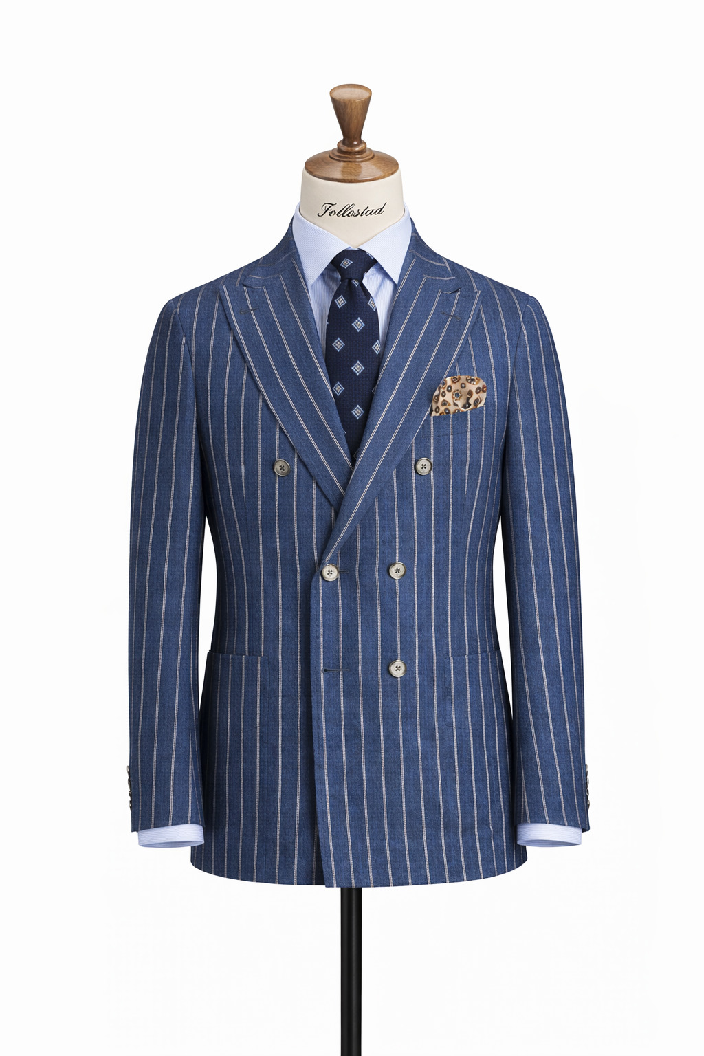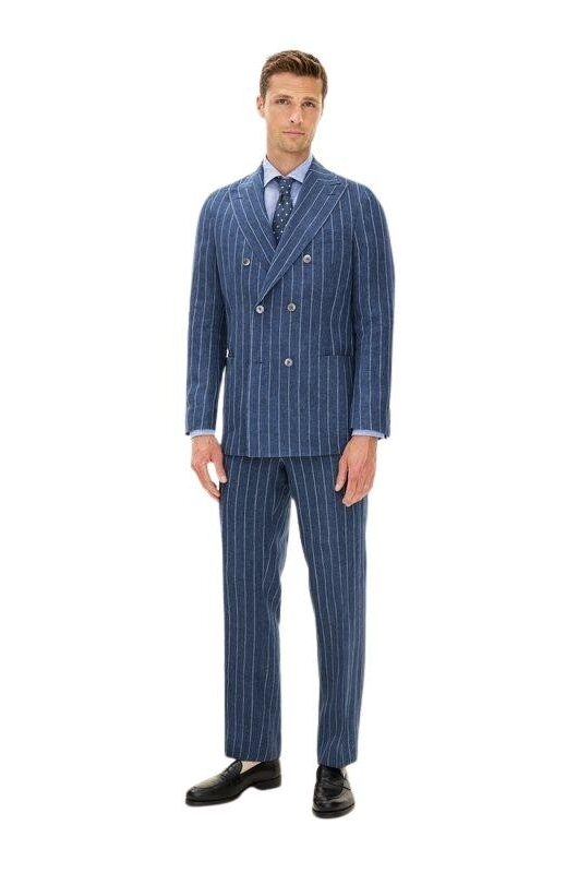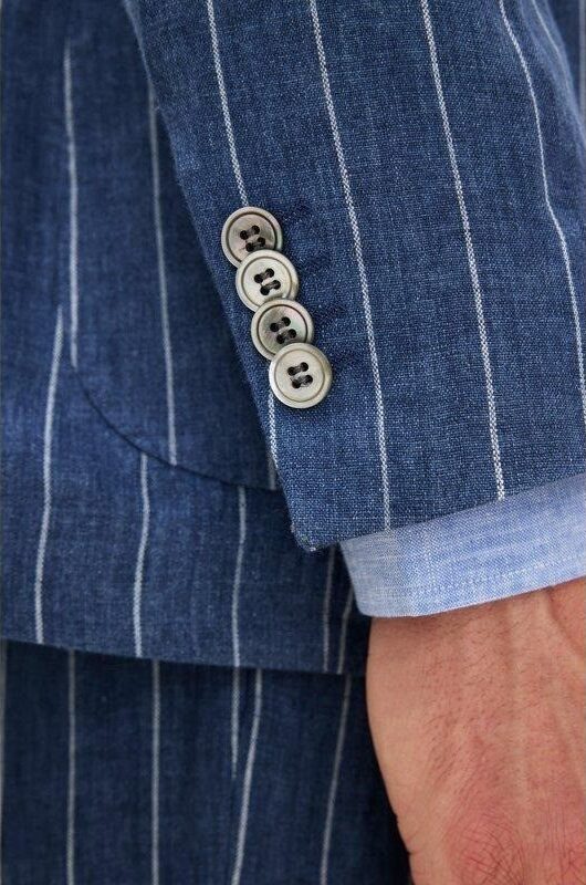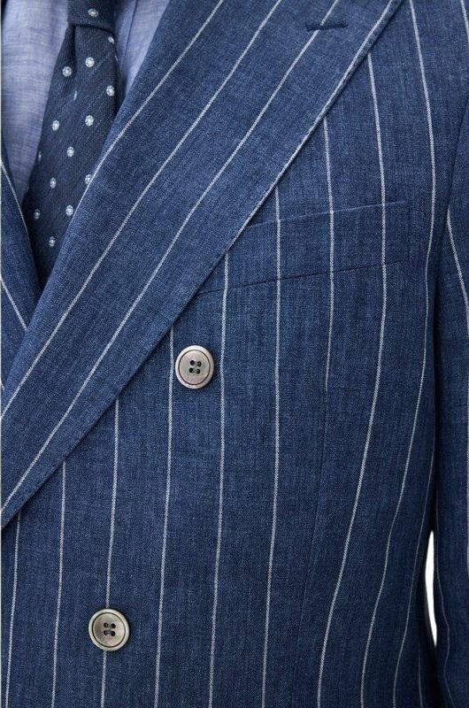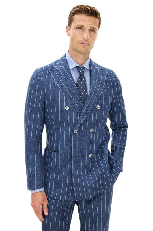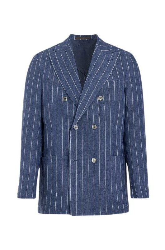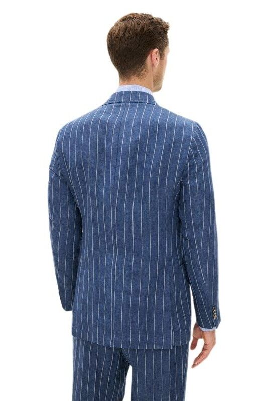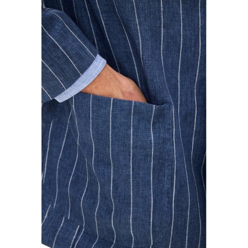 Blazer til herre fra Oscar Jacobson. Dobbeltspent modell i vevd lin med markerte striper og lett, ukonstruert skulder for en avslappet eleganse. Perfekt til sommerlige anledninger med dressbukse eller chinos.