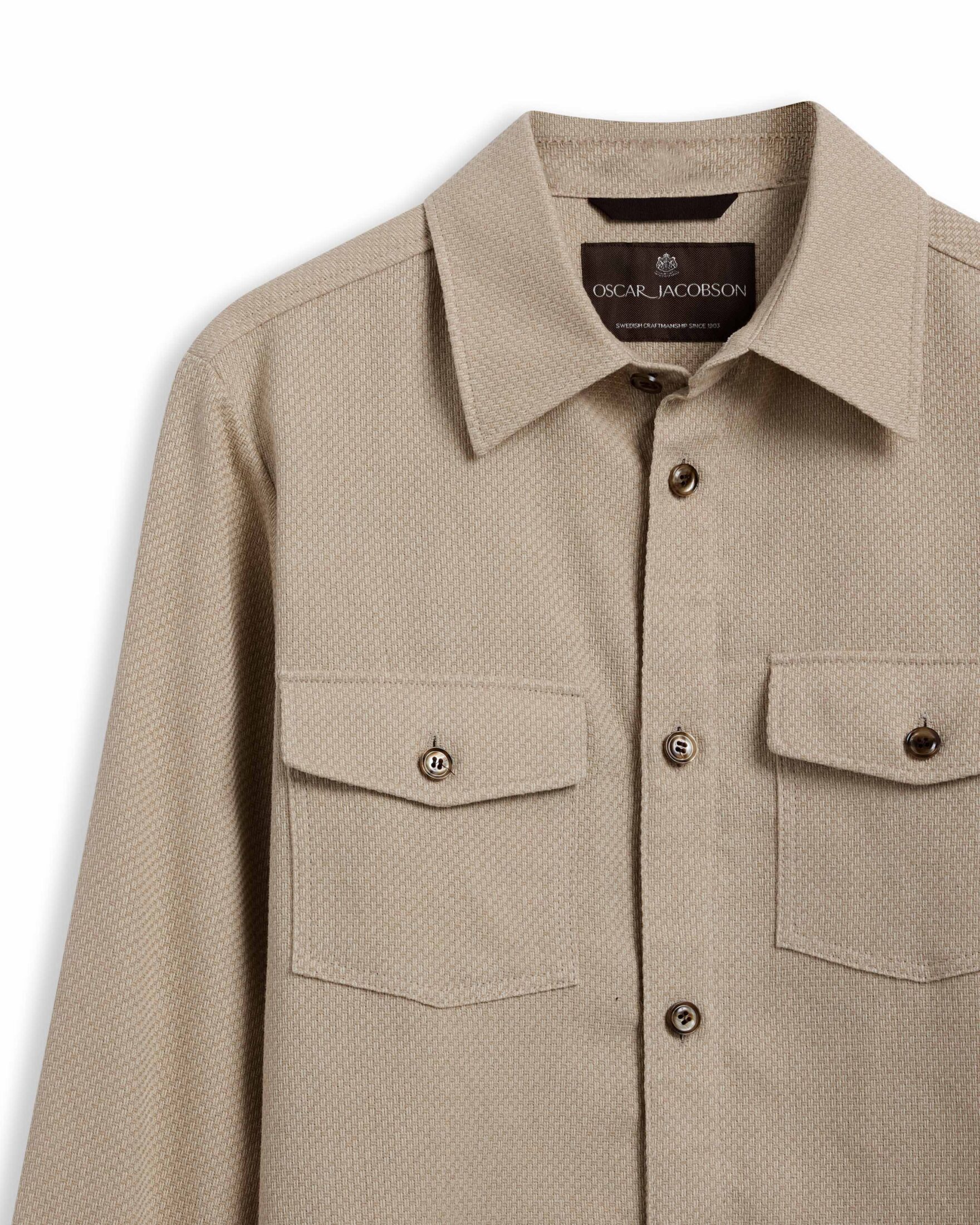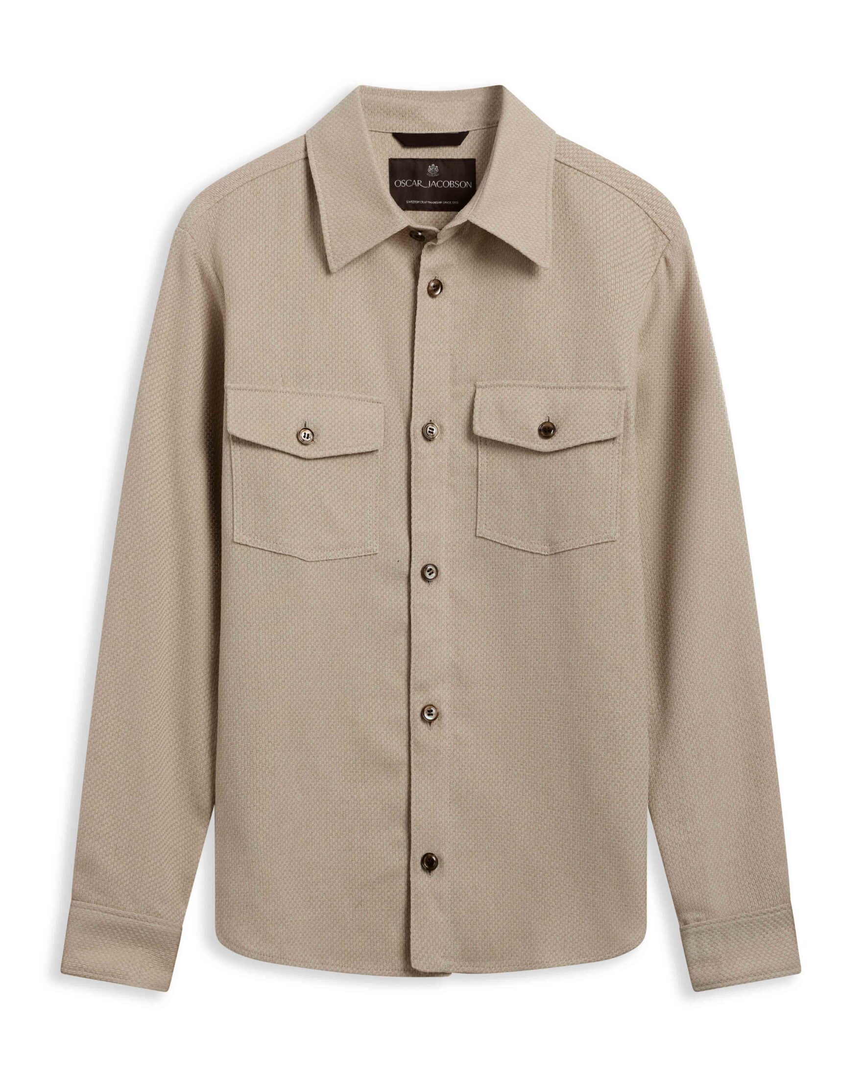 Magnus Shirt Jacket fra Oscar Jacobson. En stilren overskjorte i bomullsblanding med twillstruktur som gir et subtilt og raffinert uttrykk. Den har en komfortabel passform som gjør den like fin å bruke lukket som åpen over en T-skjorte. Et allsidig plagg som enkelt løfter hverdagsantrekket.