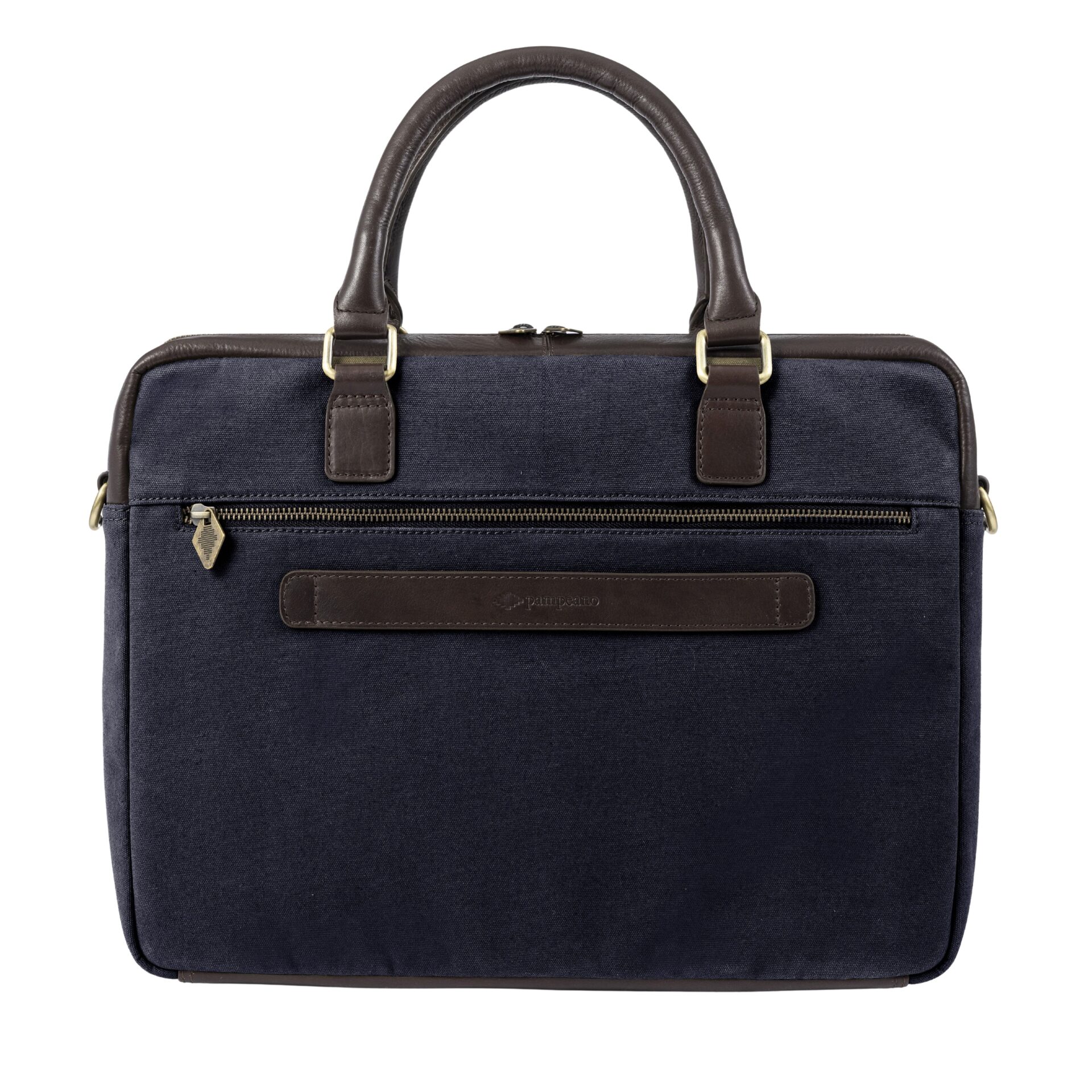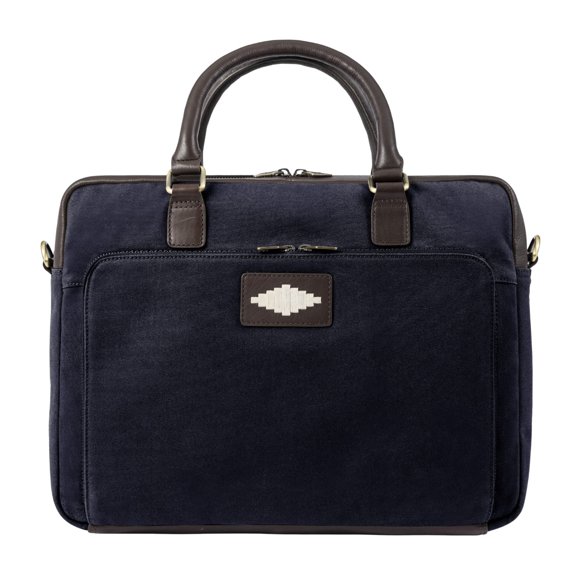 Klassisk laptop-veske fra Pampeano i slitesterkt marineblått canvas og vegetabilsk garvet brunt skinn. Vesken er håndlaget i Argentina og dekorert med en brodert pampa-diamant, en diskré signatur med røtter i argentinsk tradisjon. Perfekt til jobb og reise.