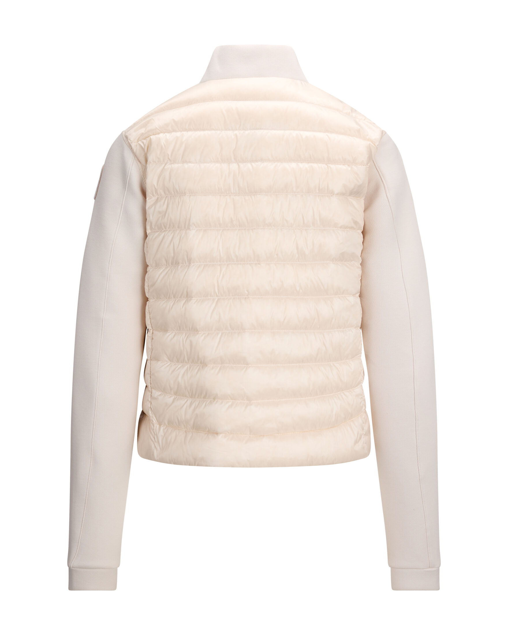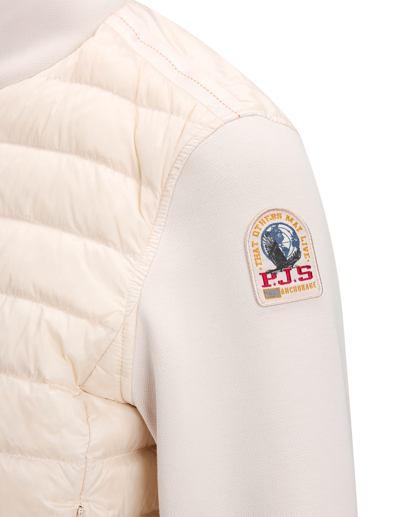 Hybridjakke til dame fra Parajumpers, fra den ikoniske Warm Up-serien. Modellen kombinerer stretch piqué med dunfylt, halvblank resirkulert nylon foran. En sporty og allsidig jakke som fungerer like godt innendørs som utendørs.