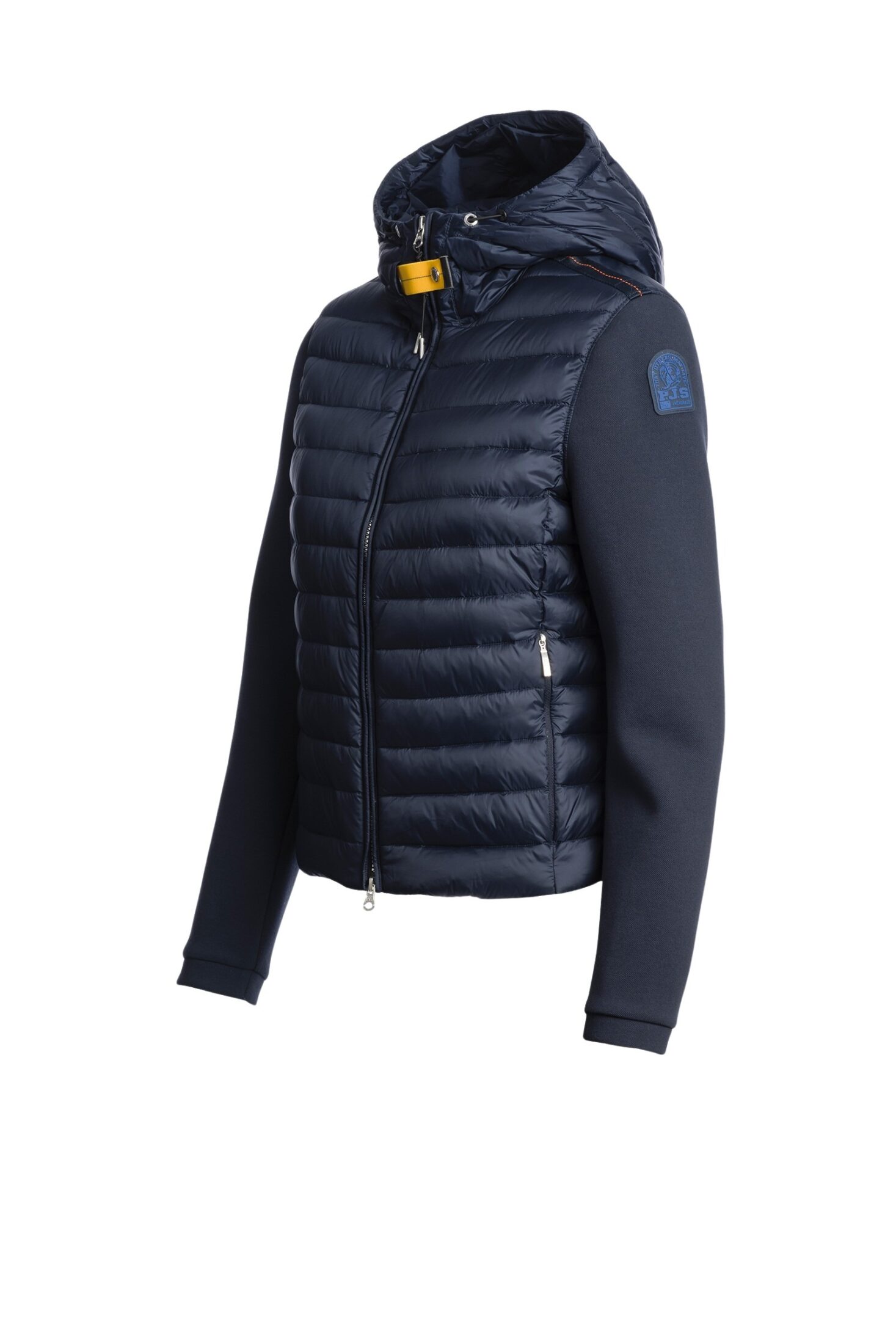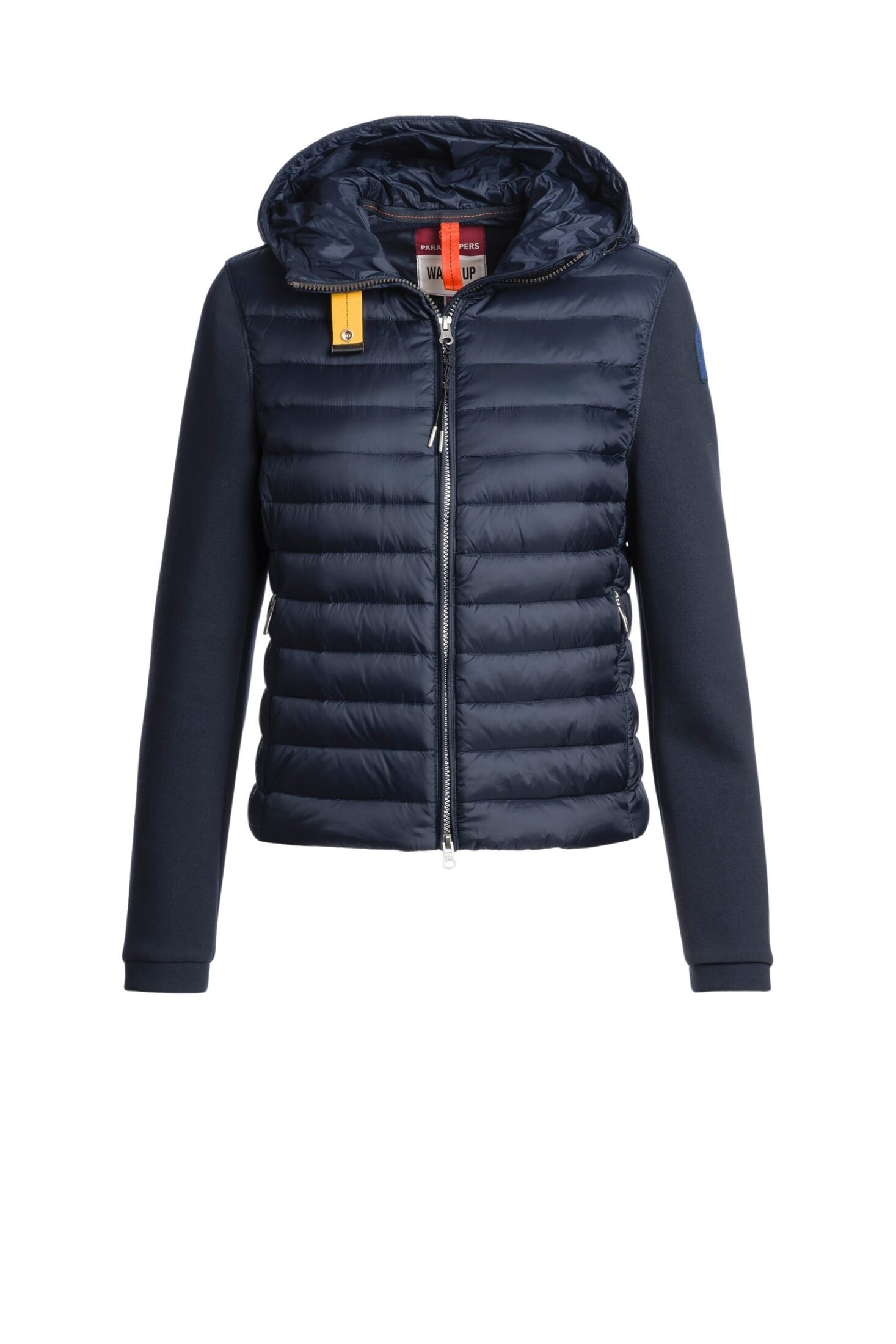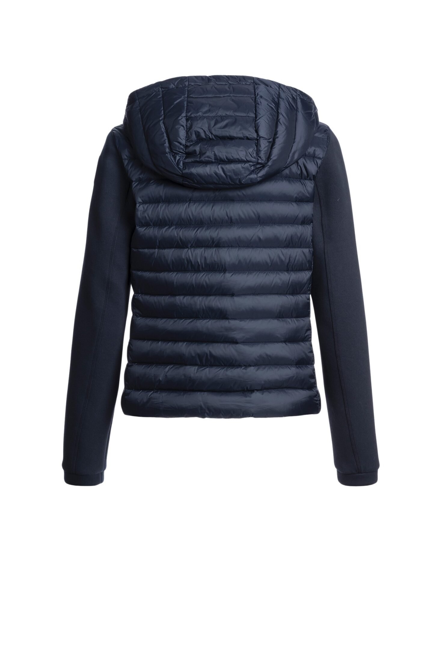Hybridjakke til dame fra Parajumpers med hette. Laget av en bomullsblanding av piké, kombinert med en dunfylt, halvblank nylontaft. Designet for å brukes både innendørs og utendørs.