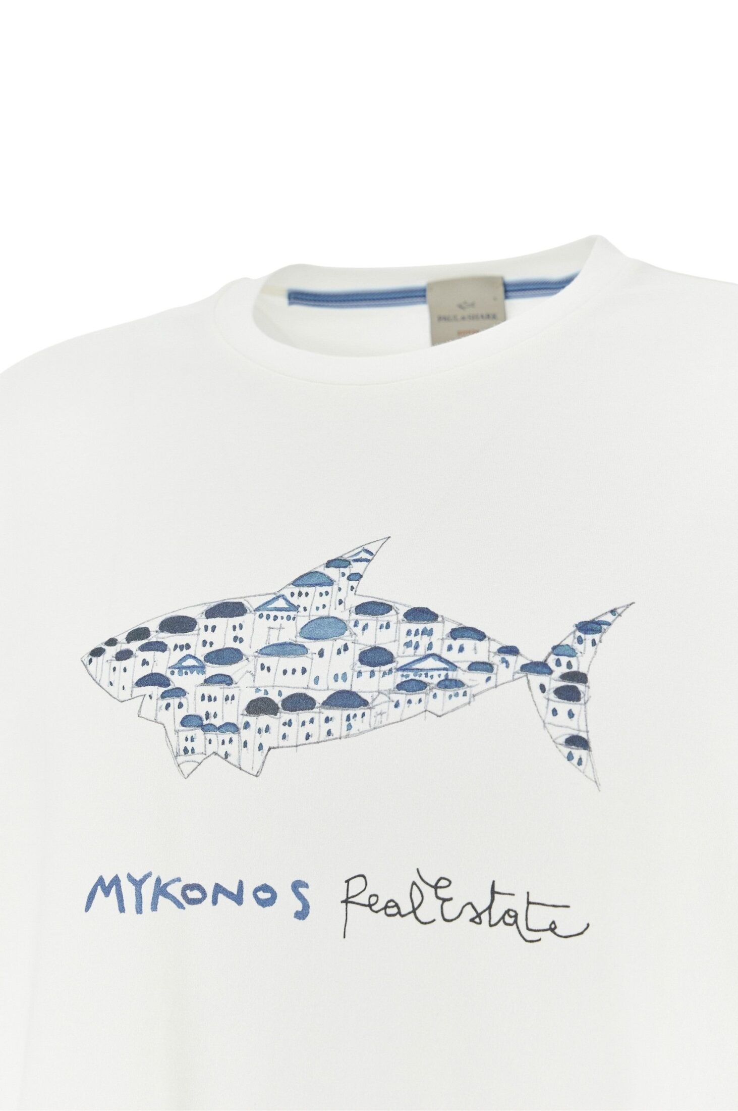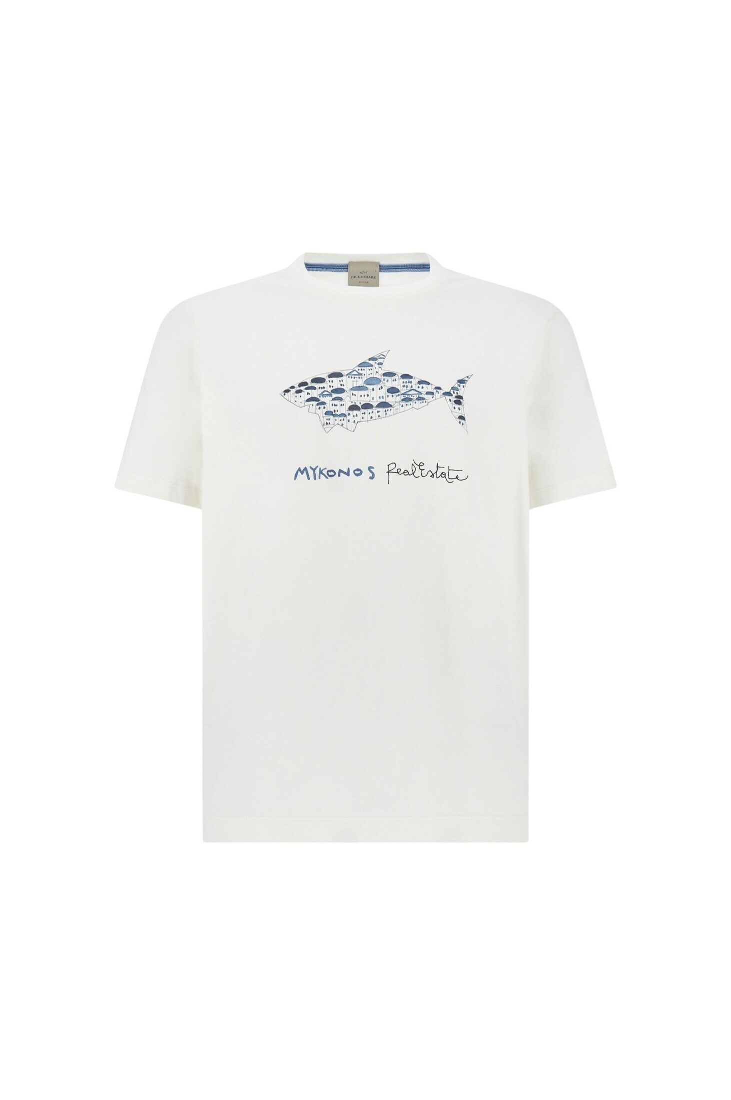 T-skjorte til herre fra Paul & Shark. En stilren T-skjorte til herre fra Riviera-kolleksjonen, laget i lett og pustende bomullsjersey for maksimal komfort på varme dager. Den har en rett passform med splitter i sidene som gir god bevegelighet og et elegant fall. Frontprint med ikonisk hai inspirert av fargene og arkitekturen i Mykonos gir et eksklusivt og sommerlig uttrykk.