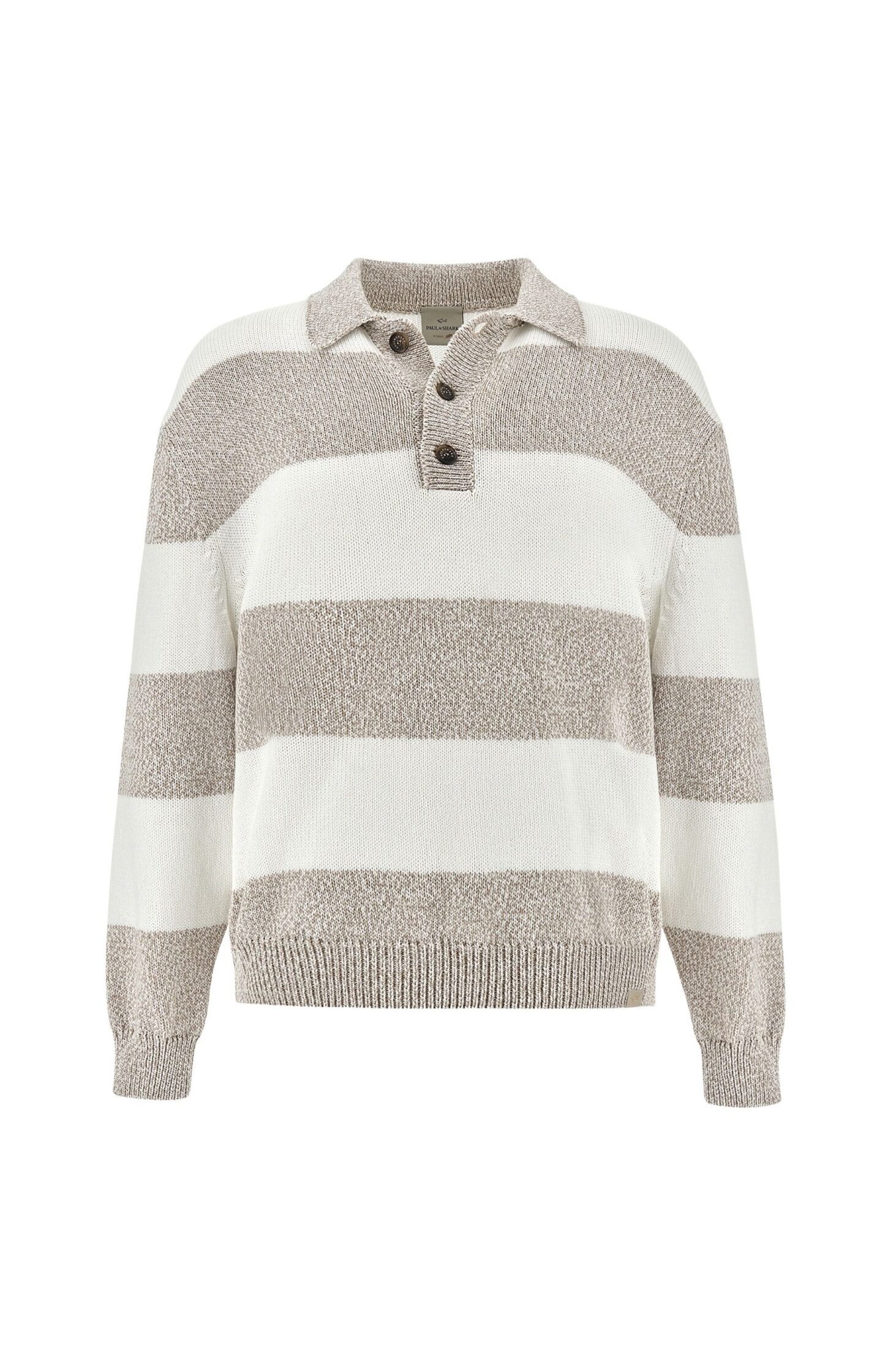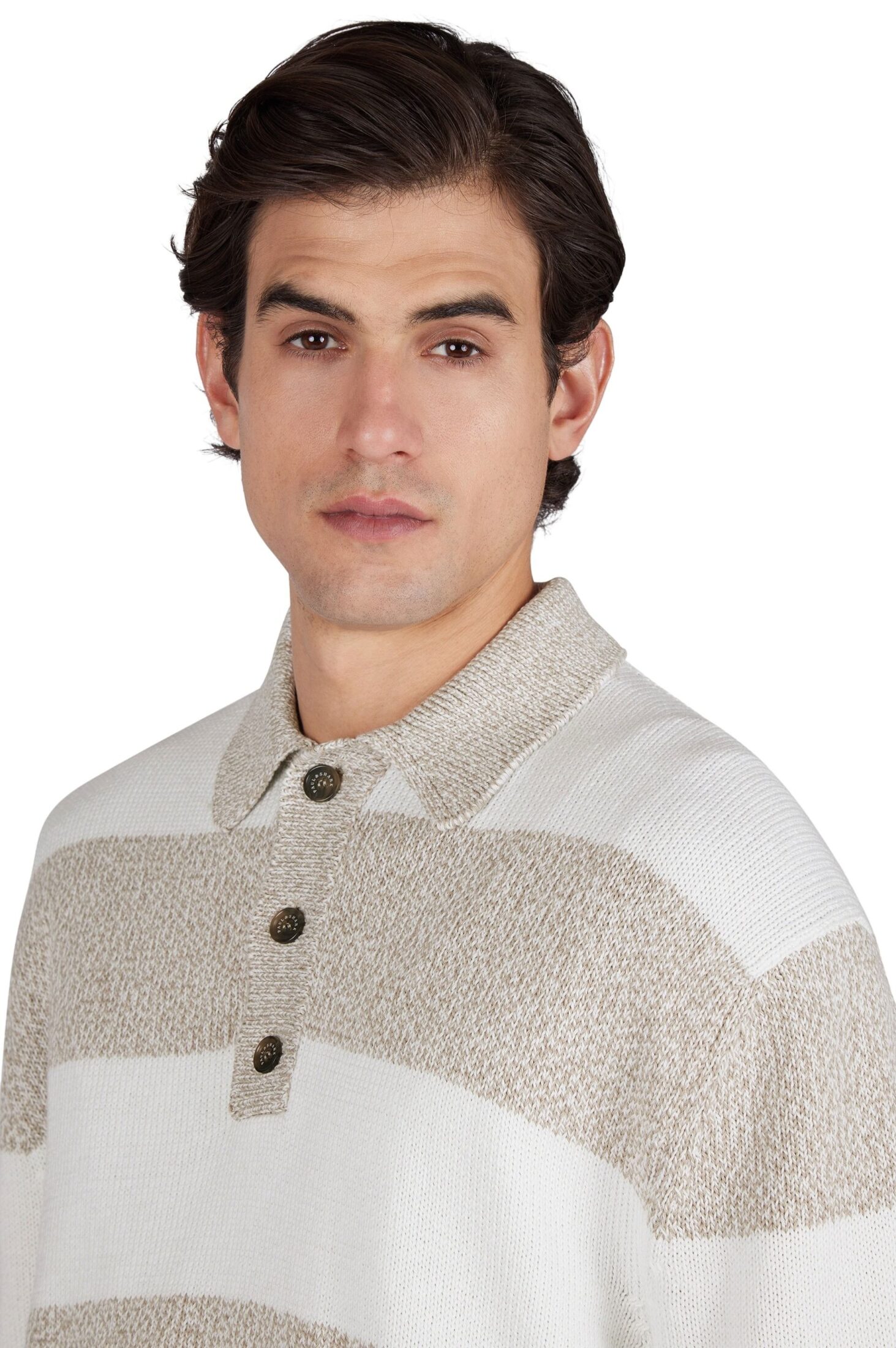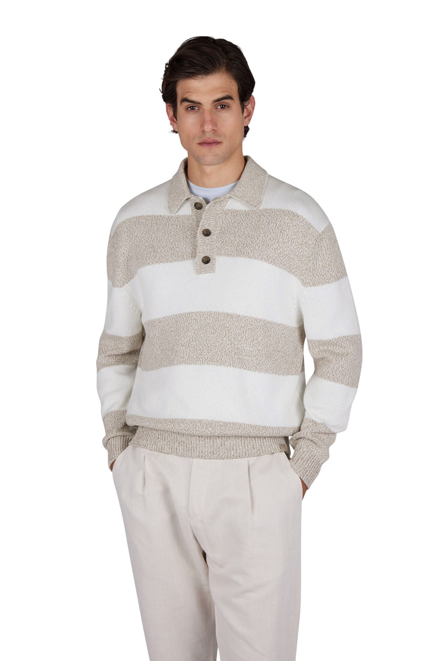 Genser til herre fra Paul & Shark. En maritim og stilren strikket polo med klassiske horisontale striper og treknapps stolpe. Laget i eksklusiv Giza-bomull med Piuma-garn som gir en ekstra myk, lett og pustende kvalitet mot huden. En allsidig herrepolo som passer like godt til sommerlige dager ved sjøen som til en avslappet, velkledd stil i byen.