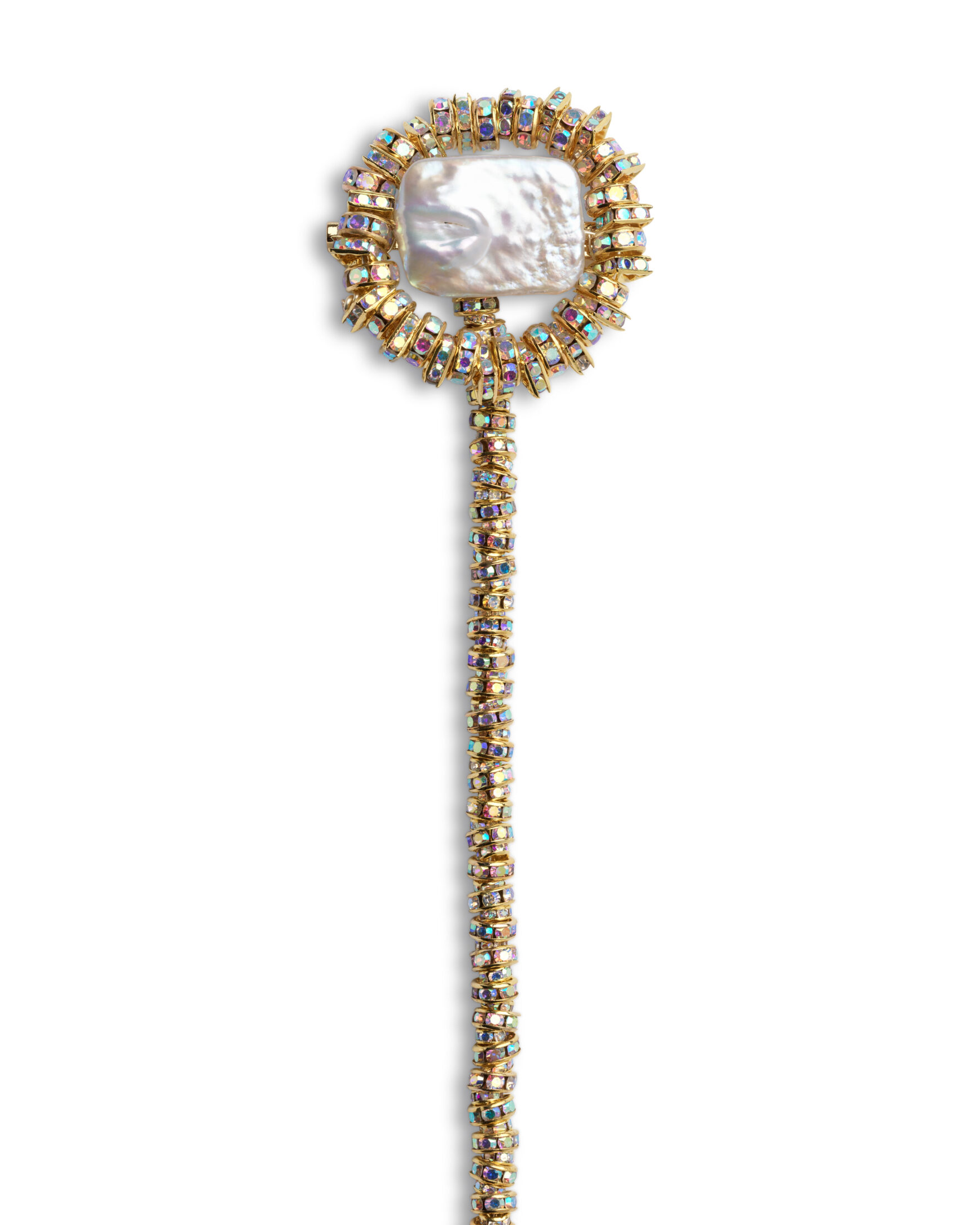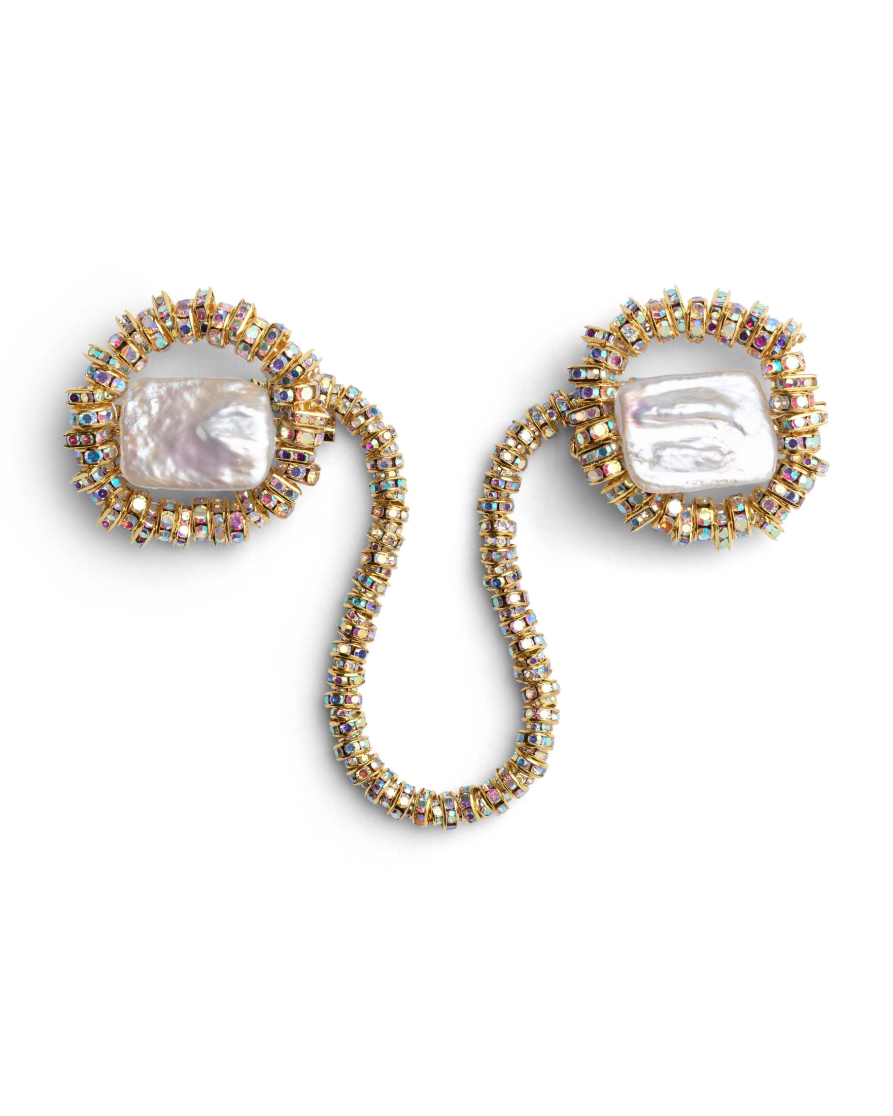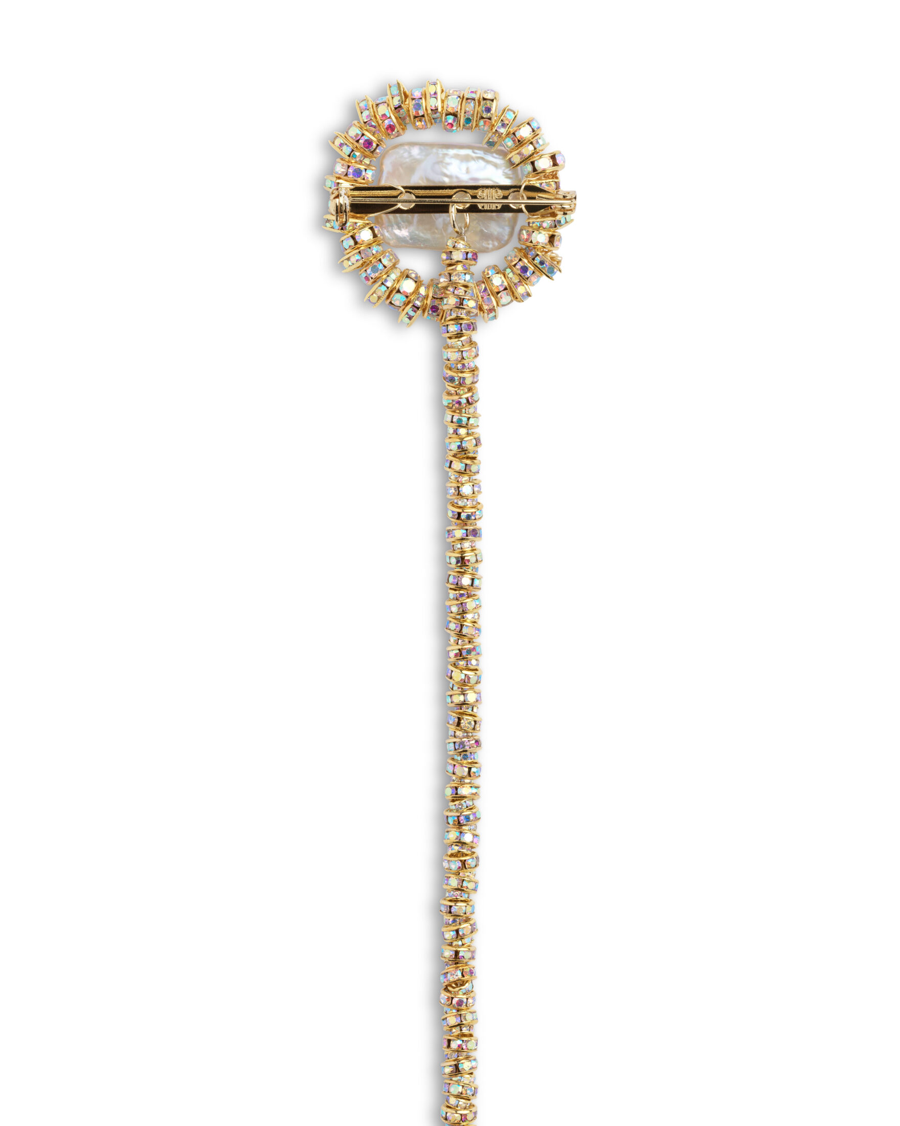 Brosje fra Pearl Octopuss.y. Denne brosjen vil garantert gjøre et inntrykk med sine organiske ferskvannsperler og en glitrende krystallramme og -kjede. Det perfekte tillegget til favorittskjorten eller -blazeren din.