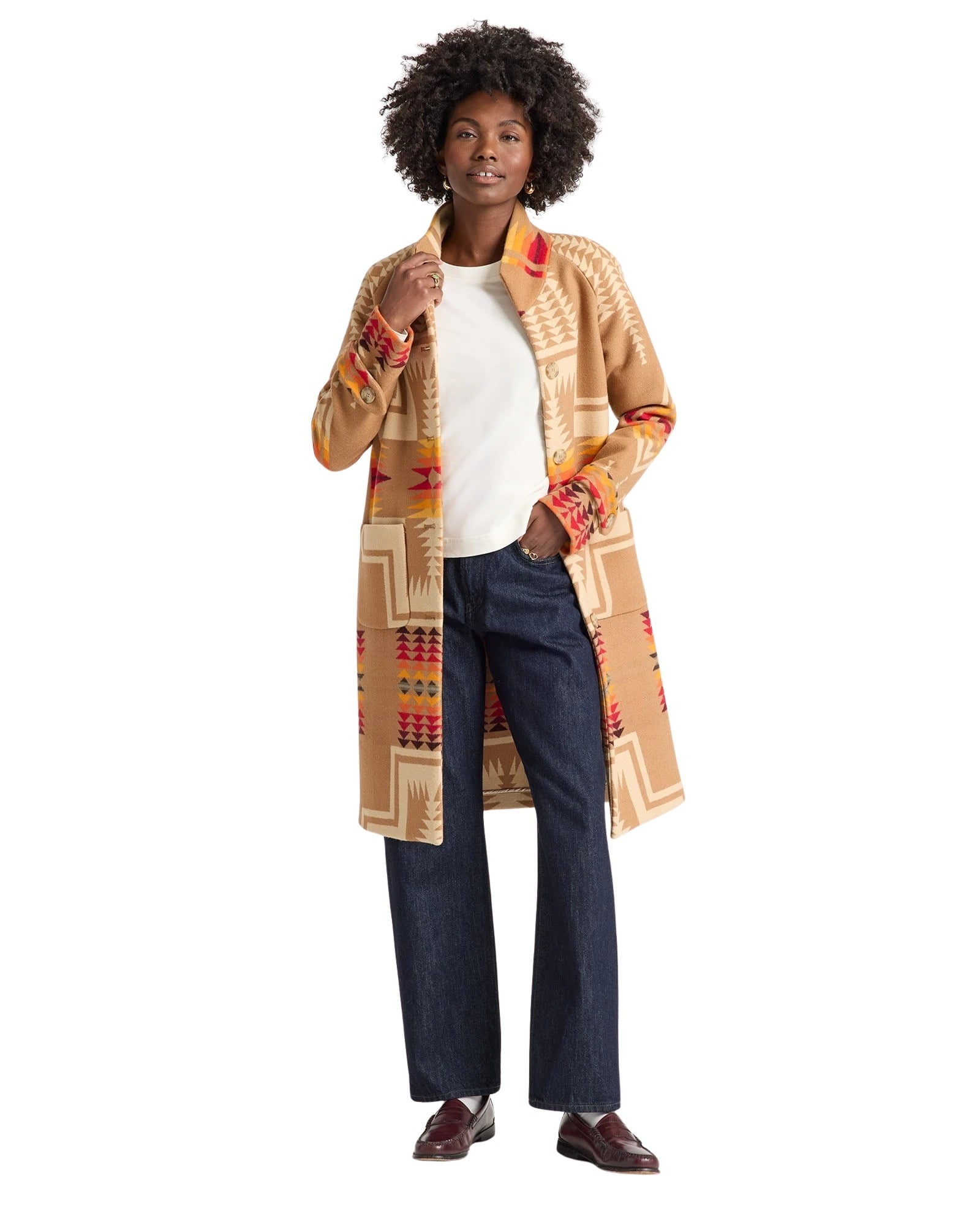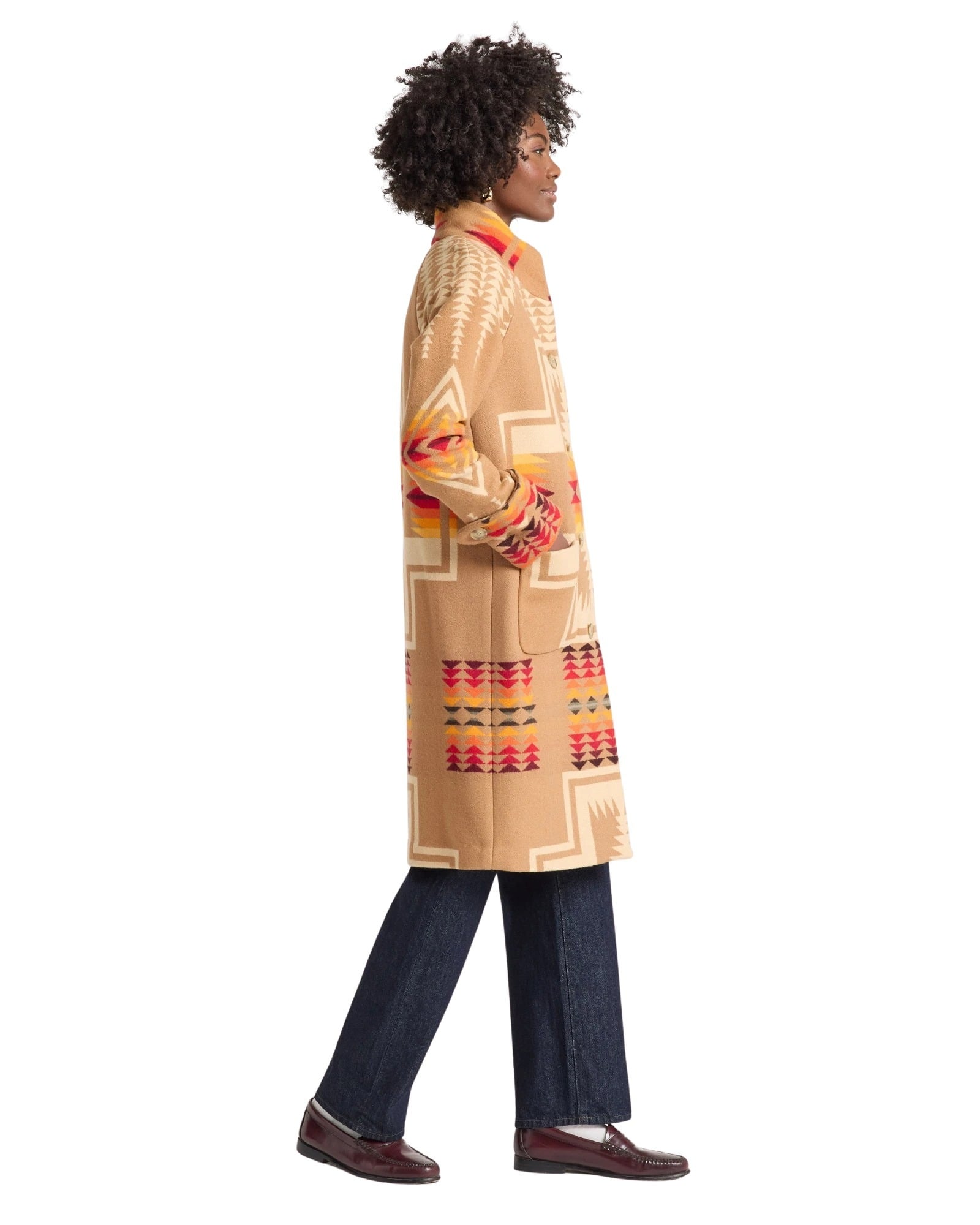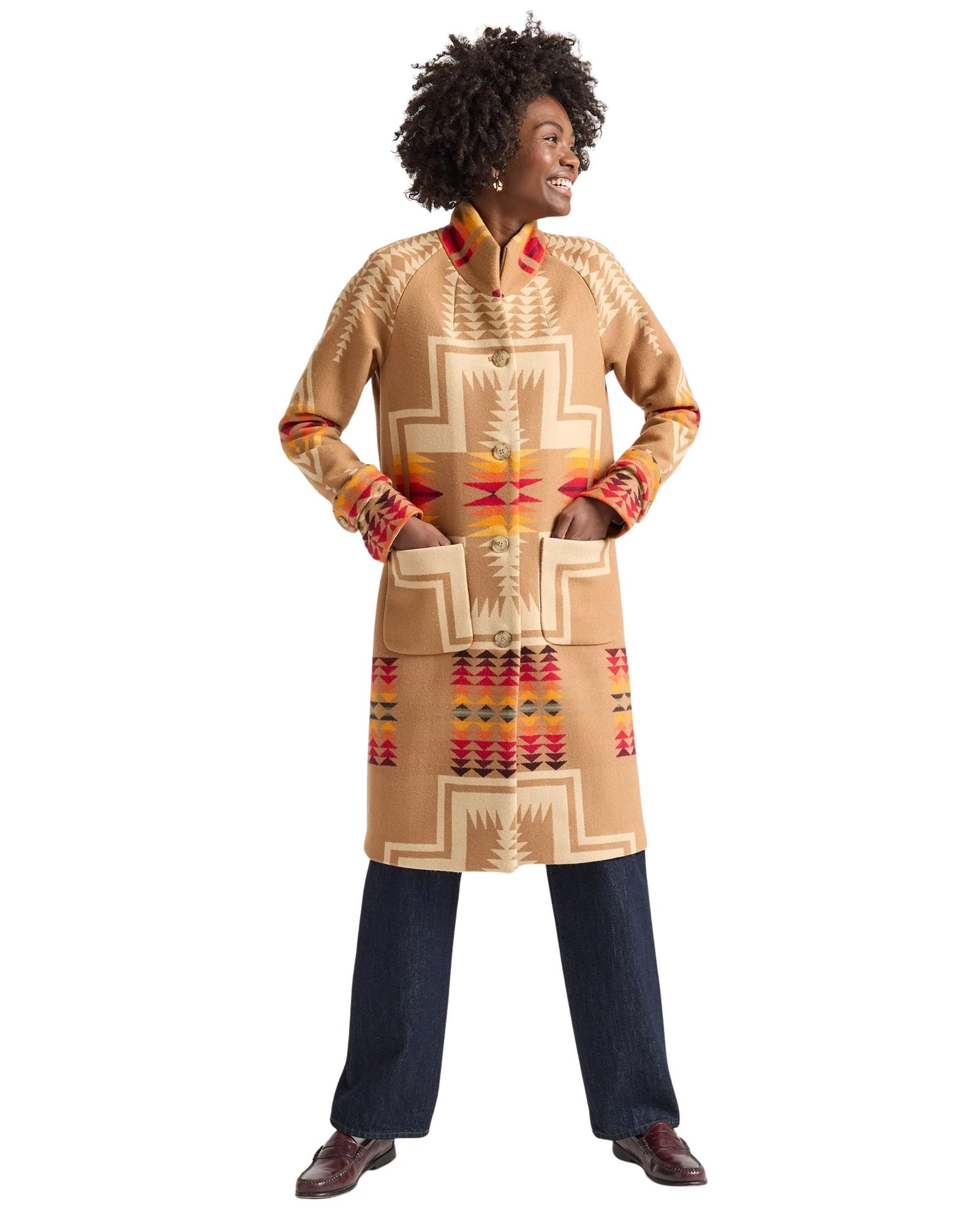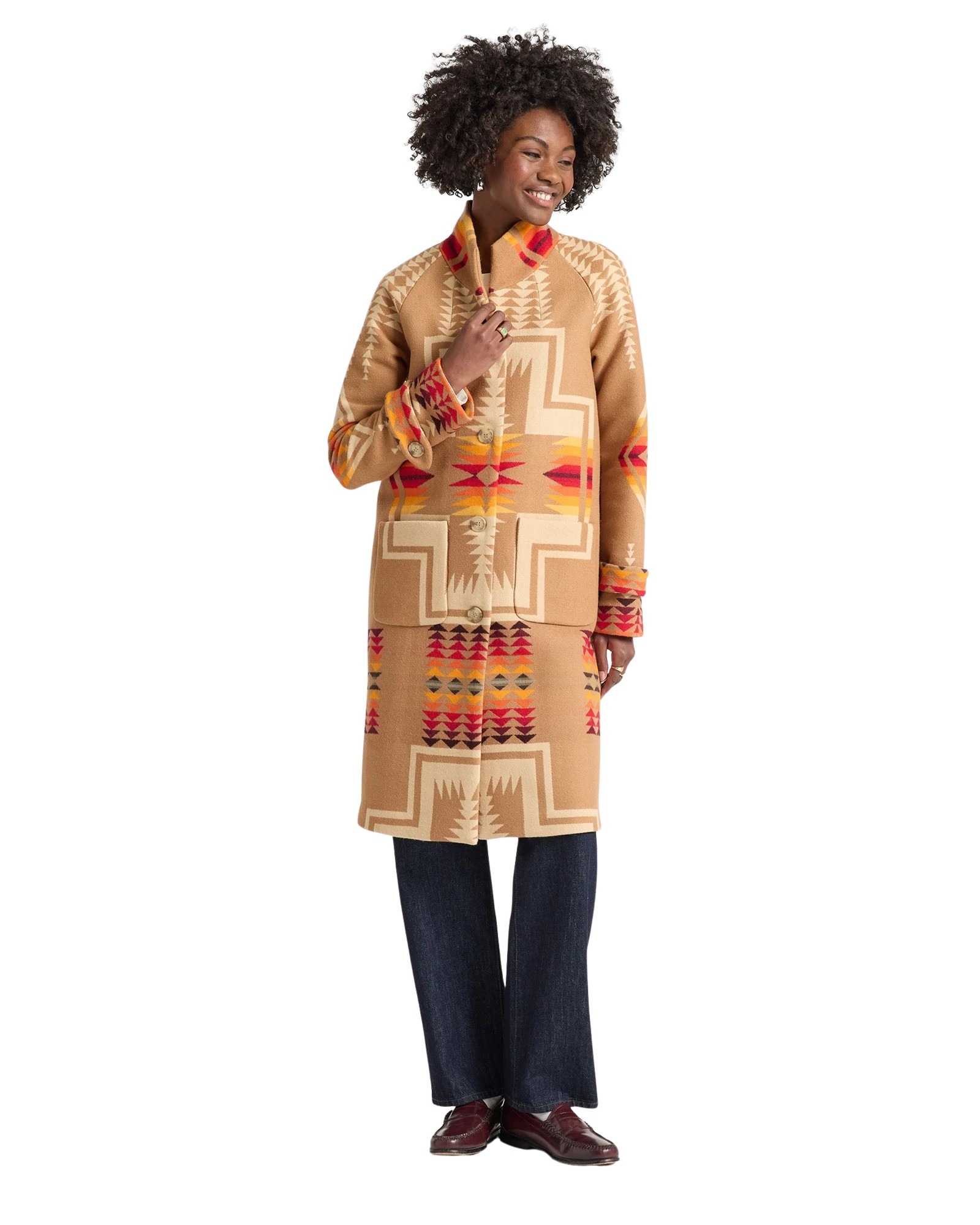 Kåpe til dame fra Pendleton. Denne kåpen kombinerer et ikonisk Harding-mønster med en moderne, flatterende passform. Vevd i USA av tett og varm ull, og avsluttet med klassiske detaljer som knappelukking, frontlommer og mansjetter med knapper. Et tidløst statement-plagg der håndverk og design står i fokus.