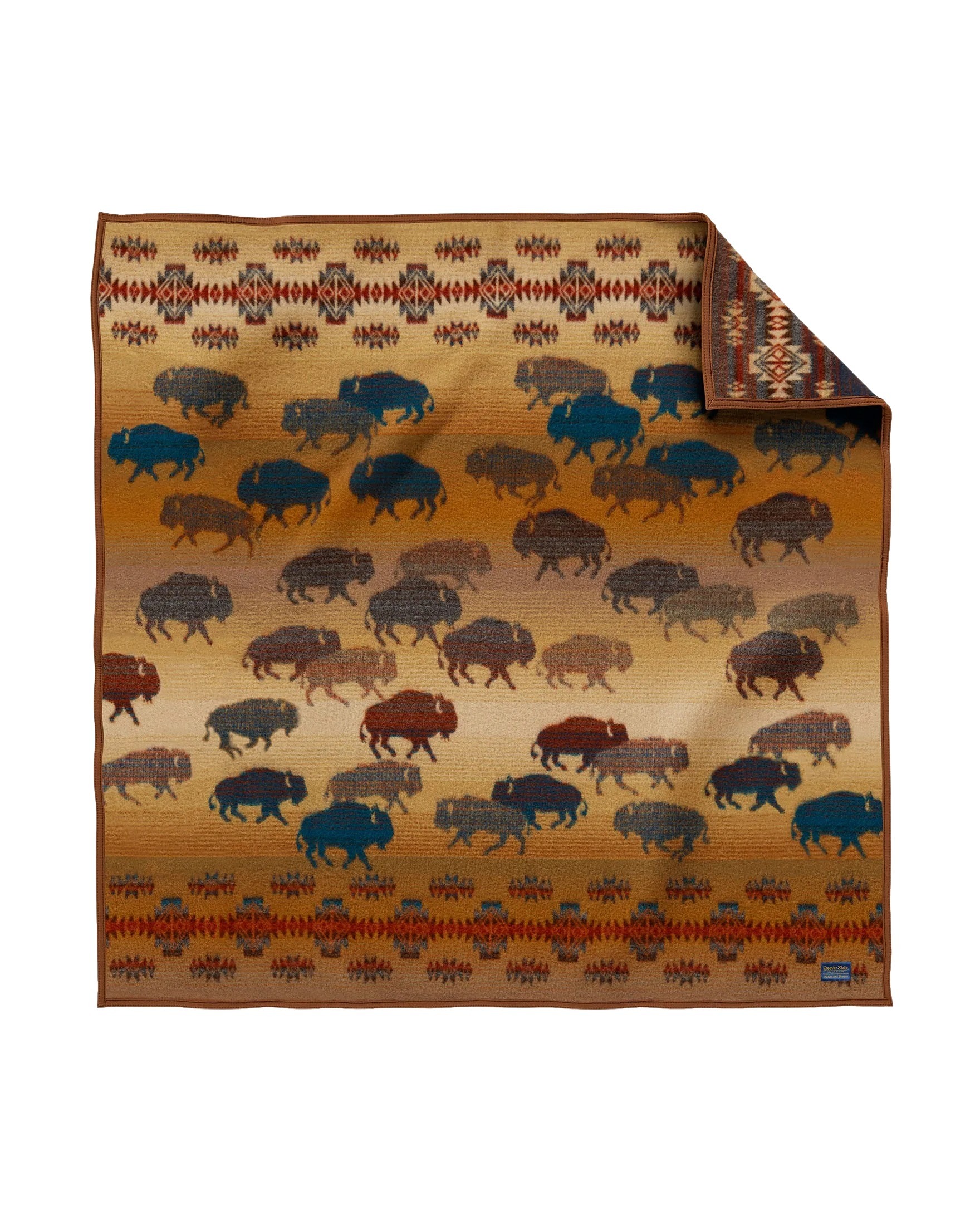 Pledd fra Pendleton. Et karakterfullt pledd med et levende motiv av vandrende bison, inspirert av det åpne prærilandskapet. Vevd i myk ull med Pendletons velkjente kvalitet, gir det både varme og et dekorativt, fortellende uttrykk til hjemmet.