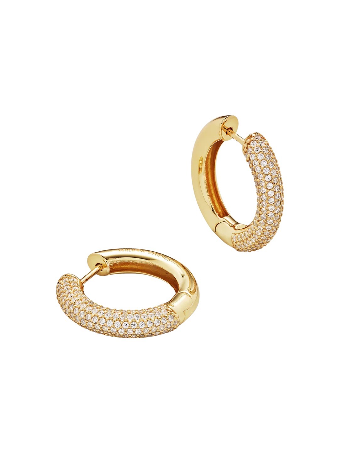 Øreringer fra Philippa Studios. Øreringer belagt i 14K gull som skaper et luksuriøst og iøynefallende uttrykk med sine glitrende stener og voluminøse form. De er et elegant statement alene, men kan også kombineres med andre øredobber for en ekstra glamorøs og personlig styling.