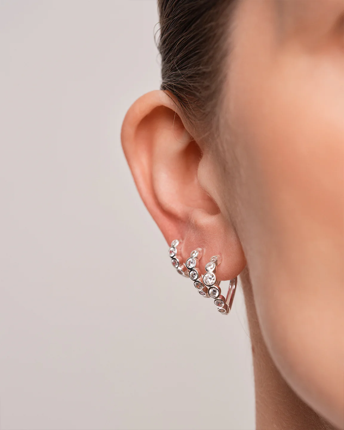 Øreringer fra Philippa Studios. Et iøynefallende, bølgende design med glitrende stener, laget av 925 sterling sølv som gir et luksuriøst uttrykk. De fungerer perfekt som et statement alene, men kan også kombineres med andre øredobber for en elegant og personlig ørestyling.